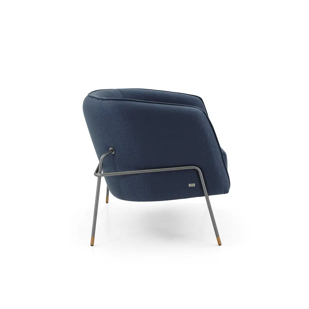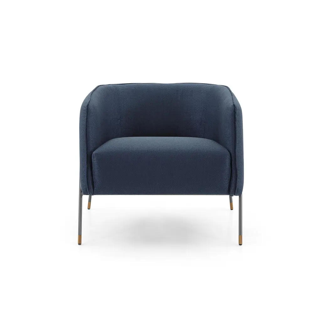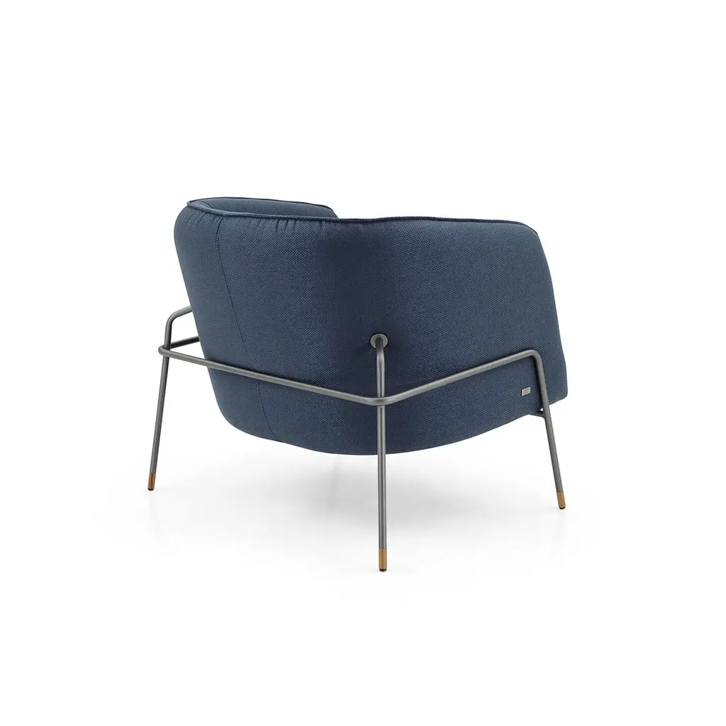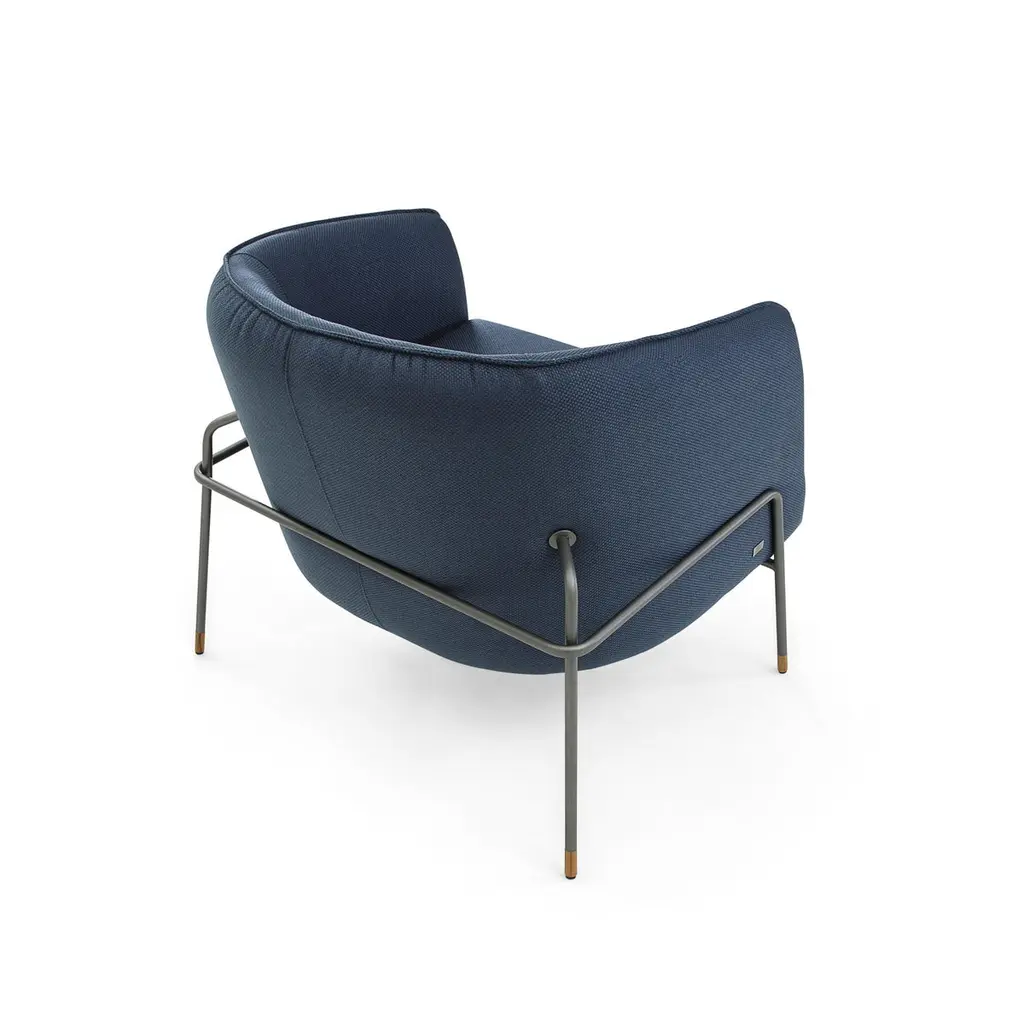 A Bella armchair designed by Sérgio Batista for Uultis with graphite metallic finish and dark blue upholstery. Please check availability prior to purchase.The Bella armchair is a beautifully designed piece, blending elegance and comfort with its graphite metallic frame and deep Pthalo Blue Basket Weave upholstery. This contemporary lounge chair features a fully upholstered shell and firm seat cushion that invites you to sit back without compromising on support. The padded seat, backrest, and arms are wrapped in rich, textured dark blue fabric that brings depth and sophistication to any interior. The open metal frame lends a light, airy feel, allowing this piece to work seamlessly in smaller spaces like apartments or studio rooms, as well as larger living areas.With its continuous curved silhouette and tub-like shape, the Bella armchair creates a cozy nook ideal for reading or lounging. Perfect as an accent chair in a living room or paired in a set for a stylish conversation corner, this armchair also works beautifully in a bedroom as a statement piece. Its firm comfort level offers the perfect balance for both relaxing and entertaining. The slim graphite metal legs add visual lightness while providing sturdy support, complemented by a curved back bar for added stability and sculptural detail. Arriving fully assembled, the Bella chair makes an immediate impact with its blend of modern design and timeless comfort, elevating contemporary, minimalist, or urban interiors with ease.