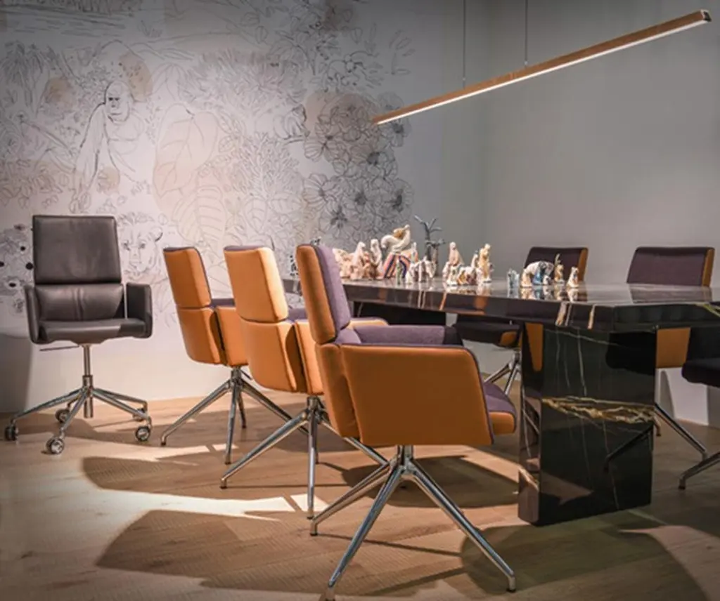 When the little brother suddenly grows up DS-414 is a chair that follows the movements of the person seated and provides noticeable support for the sitting posture: sitting has never been so healthy – no wonder, since the model is based on a novel movement mechanism. Available as a cantilevered chair or with a star base, the consistent further development contains everything one needs to bring the new culture of sitting to the table. But De Sede takes things a step further still, by selecting materials that permit a high-quality material mix of leather and fabric, suddenly lending DS-414, the little brother, a distinctive appearance all its own.How do you unite perfect ergonomics and optimal comfort? By sitting down in DS-414 – the evolved form of the DS-343 wing chair that adapts to the movements of the person seated. With DS-414, too, the object is not constructed with a Classic seating area that stops at the backrest, instead, it extends up to the height of the pelvis. If one leans backwards, the backrest element, from pelvic height on up, automatically moves along with the user, without any mechanical effort, and solely as a result of the change in the posture of the person seated. DS-414 can be set up or positioned anywhere without any problems, making the joys of dining even more pleasurable and the fun of company even greater than before: the proven movement mechanism actively supports the spine, promoting better posture and making everything a delight: dining, discussing, reflecting, even working at the table is suddenly a great deal easier.Additional information:Material: FabricCategory: Maple - 7716-222Type: Upholstery fabric 81% viscose, 15% linen, 4% polyesterCharacteristics: Maple is made of three tone-in-tone matched yarns and refined with an aero finish. This results in a particularly soft fabric which is given an unmistakable sheen by the viscose used. Depending on the incidence of light and perspective, the numerous color nuances become visible. Maple is woven with a velvety chenille yarn and thereby provides an extremely soft pile which makes the structure of the fabric tangible.Dimensions: 57 W x 62 D x 107 H cmSeat height: 48 cmArmrest height: 64 cmAvailable in other upholstery options: Living, touch, cashmere, natural, club, coloral, craft, pine, re-wool, velour, select, arco, lilaAvailable in other base options: Star base, cantilevered base.