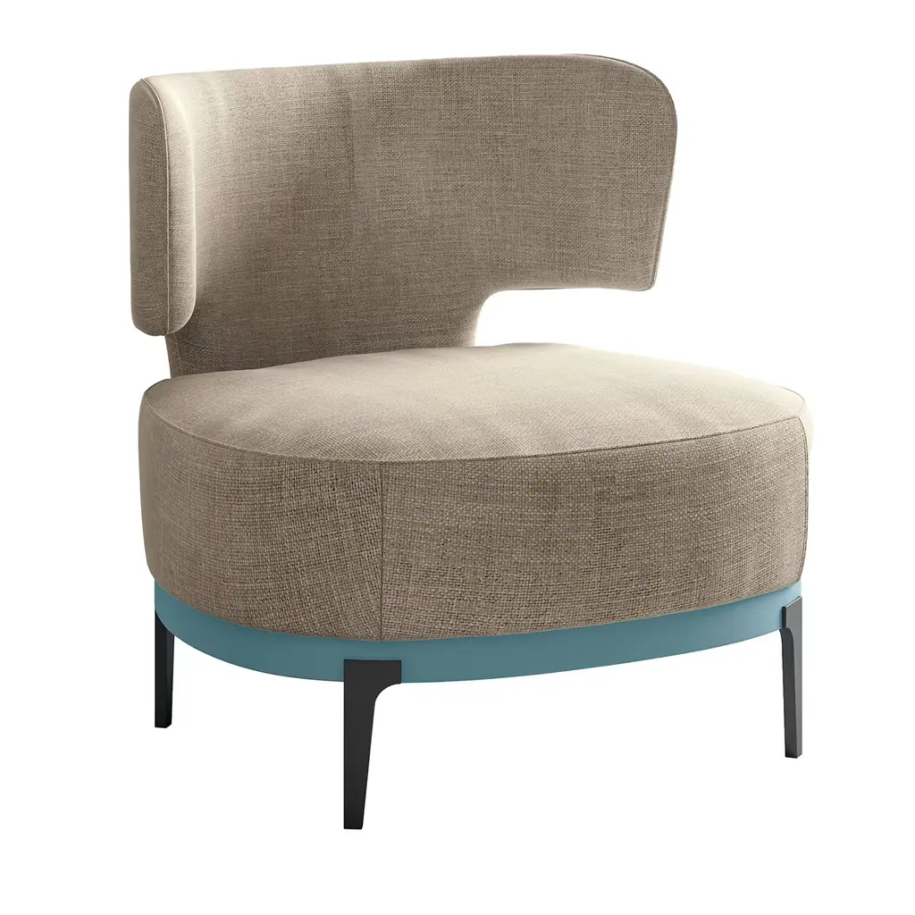 This enveloping Diamante collection of sublime beauty features a wide seat that appears almost suspended and projects outwards. Its original contemporary design, with fluid, corner-free geometries and a large backrest lined with cushions in soft, sturdy fabric, makes for a refined armchair of sophisticated simplicity. It features a Glamour fabric cover with contrast piping for added elegance.