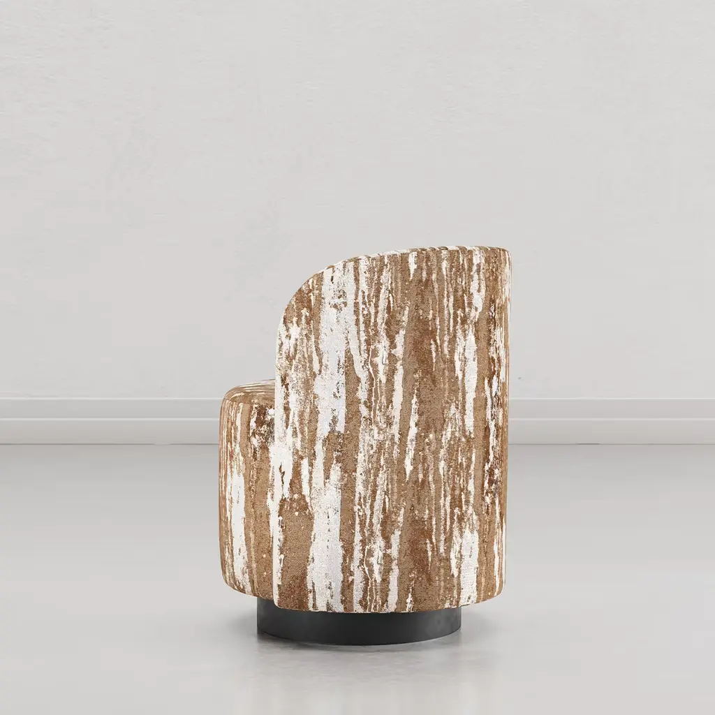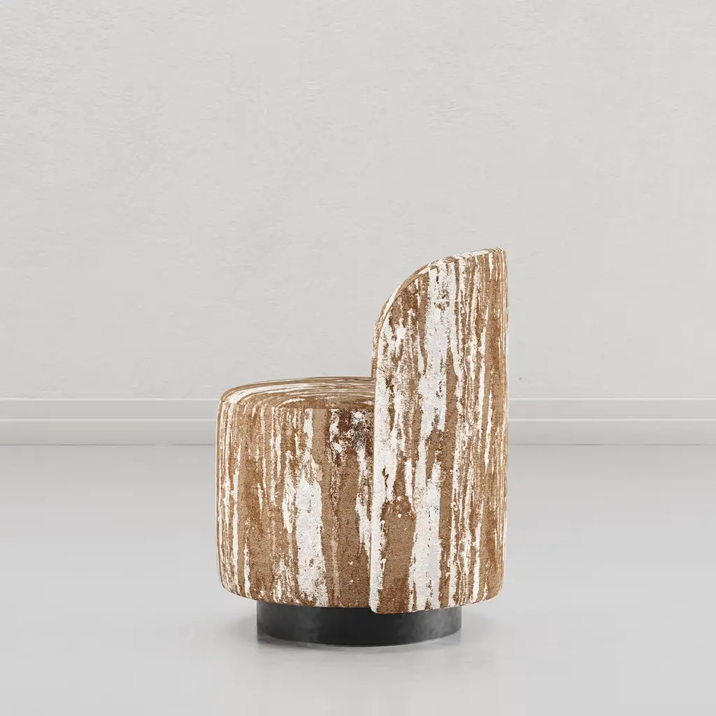 Dig It chair is a chair with a cylindrical seat and an enveloping backrest. The wooden shell is covered with differentiated-density polyurethane foam and finished with a top layer of acrylic fiber. The base is made of matt black lacquered wood and upholstered with second-firing fabric in a dark reflection color.