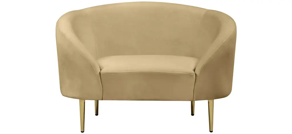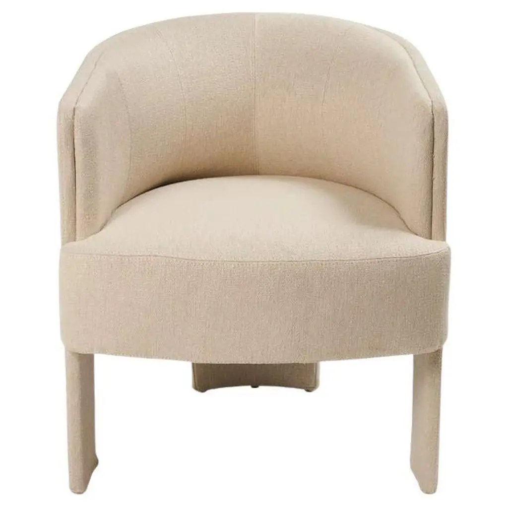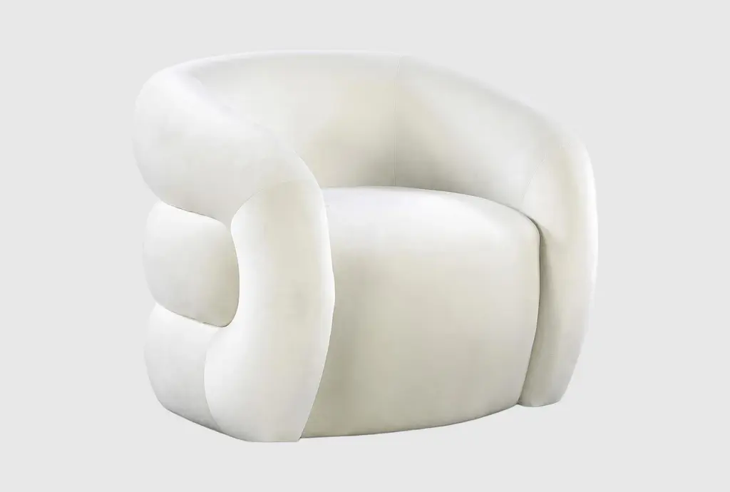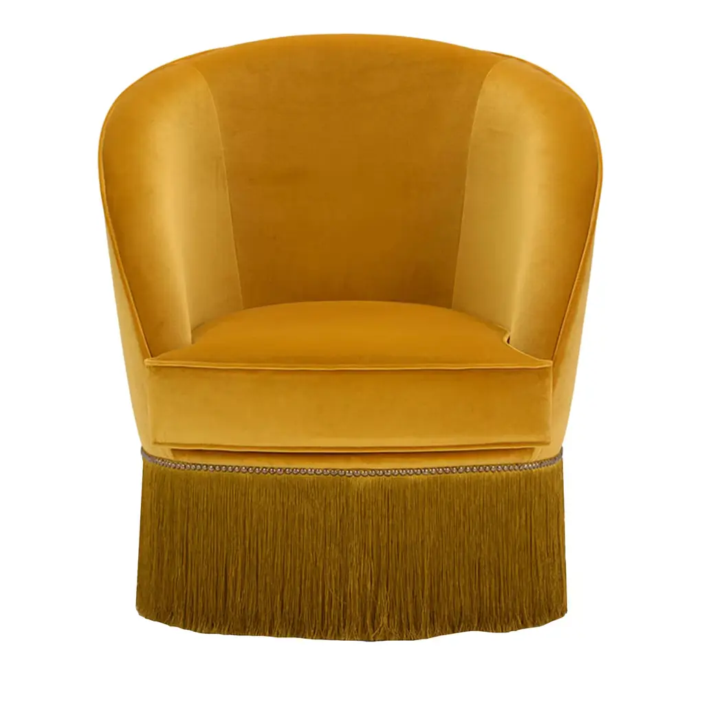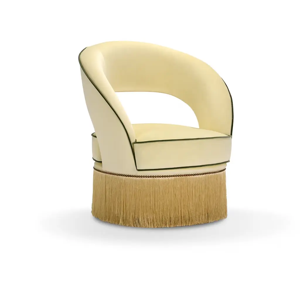 Superb addition to classic decors, this stylish armchair is inspired by the goddess Dione, mother of Aphrodite according to the "Iliad" by Homer. Sustained by an elegant, circular seat whose base is adorned with delicate fabric fringes, the open backrest is made from a sloping, deeply-curved element designed to provide unrivaled comfort. A prized, off-white velvet upholstery with exposed green hems completes the design.