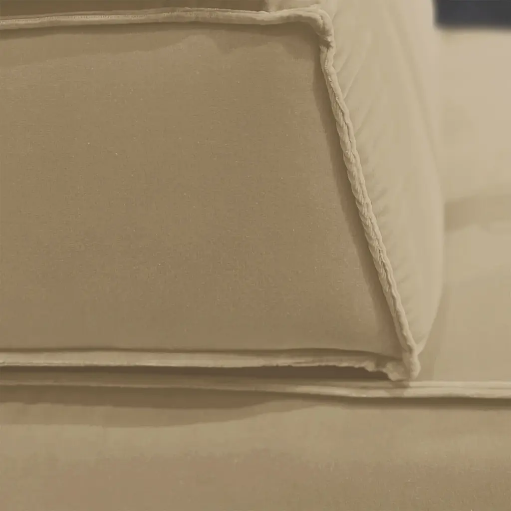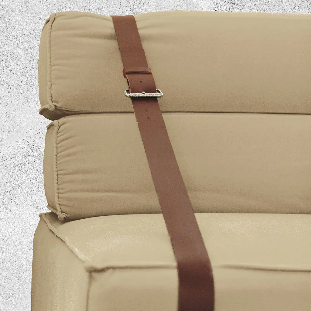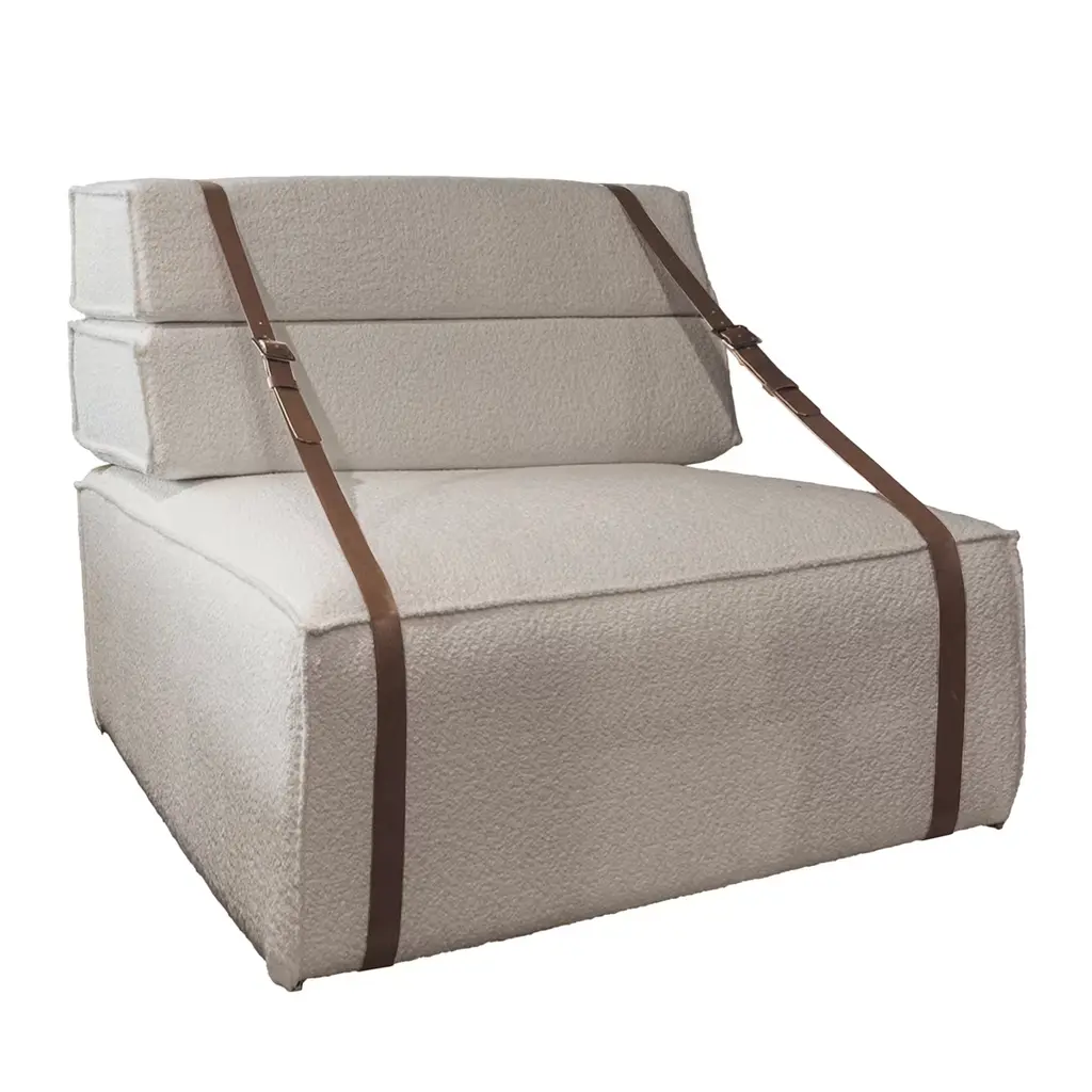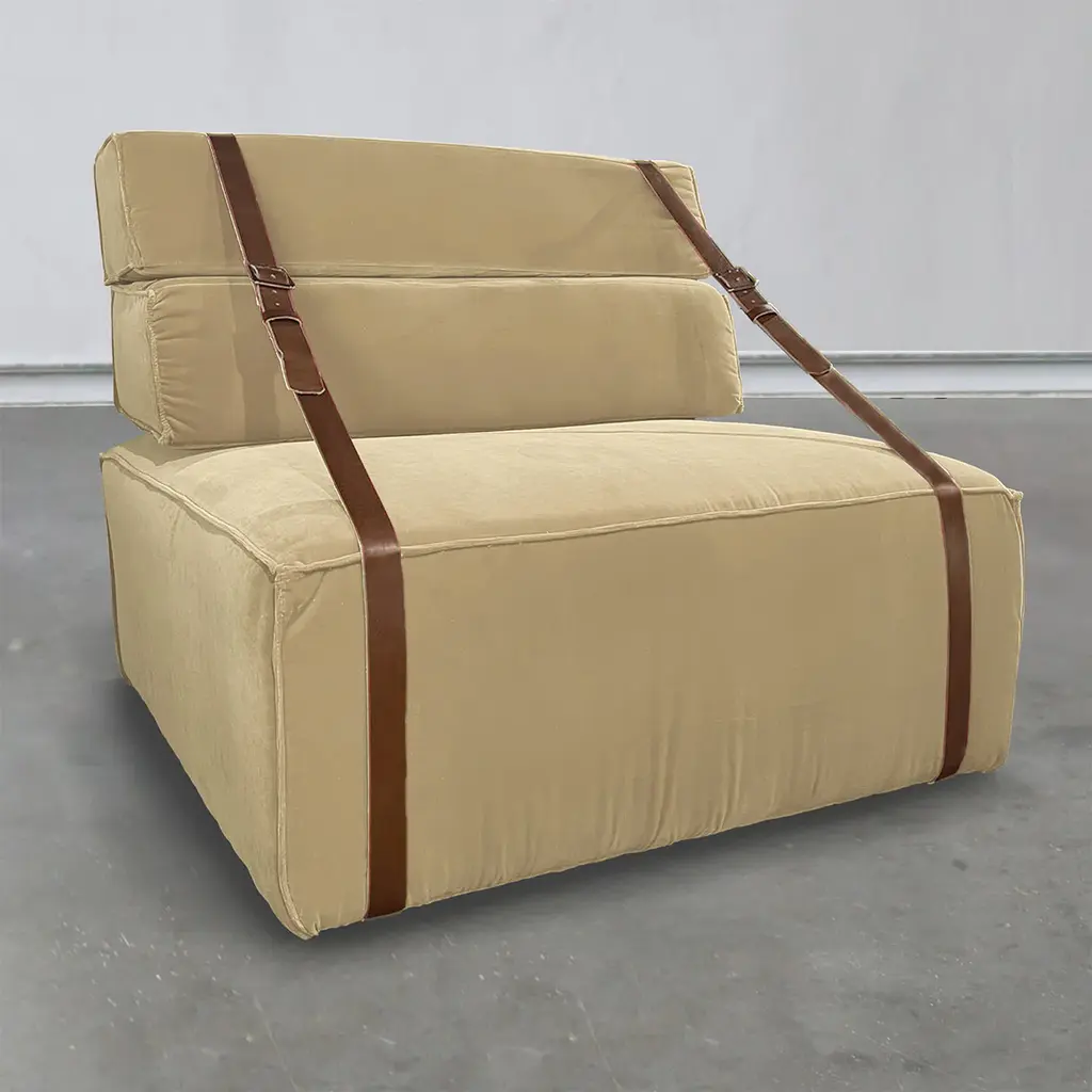 This armchair, defined by its eco-friendly "bio-cotton" fabric, embodies luxury with a sustainable twist. Its soft velvet in a neutral beige tone enhances any setting, offering a calm, sophisticated aesthetic. The armchair pays homage to nostalgic cargo transports at Genoa's docks, evoking memories of travel. It is customizable in various sizes and finishes and also offers an outdoor version with leather straps and multiple fabric options, providing versatility to suit any environment.