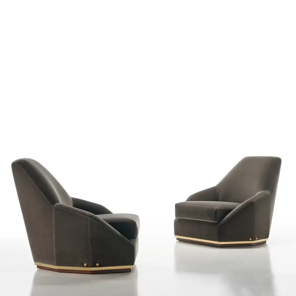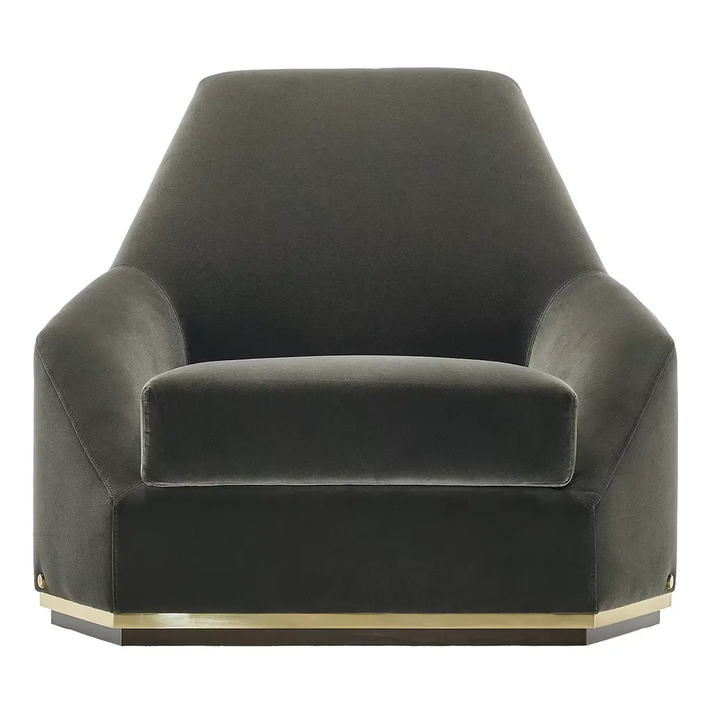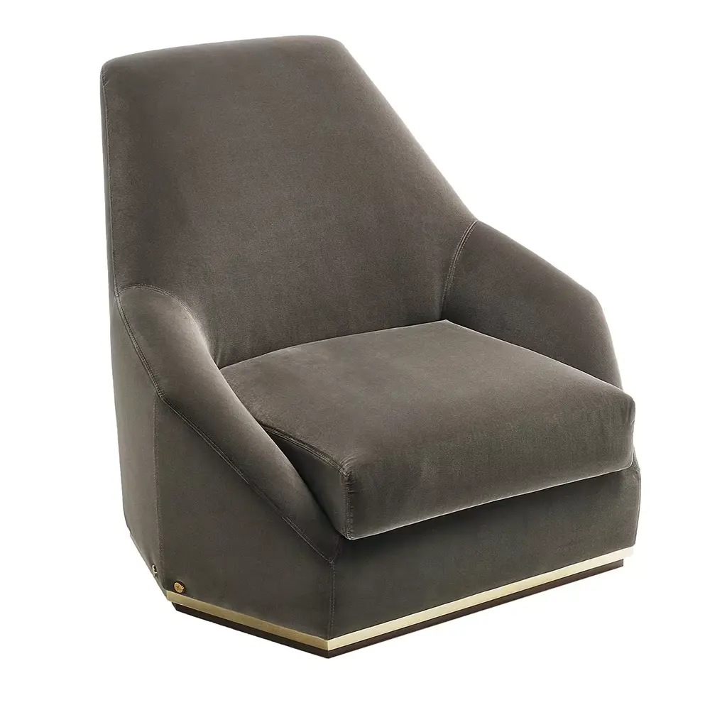 A marvelous design of unprecedented style, this armchair from the Studio Interior Collection is distinguished by a refined silhouette of clean geometric value. Handmade with meticulous care and expertise of solid wood and softly padded with polyurethane, it is upholstered with gray velvet that highlights the metal profile along the base.