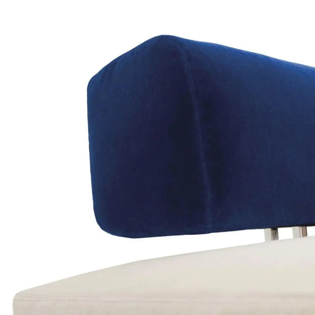 This armchair is part of the Domino collection, the quintessential modular system designed by Davide Barzaghi that allows multiple combinations and total customization. Crafted of ash plywood, the square frame of the modules is padded with non-allergenic, vegetable natural oil, officinal herbs, and goose feathers. The upholstery is fashioned of natural cotton fabric in a crisp white for the L-shaped seat and vivid blue for the arms and backrest units, one supported by a steel cylinder. This interplay of shapes and colors creates captivating variations that can be adapted to any interior need.