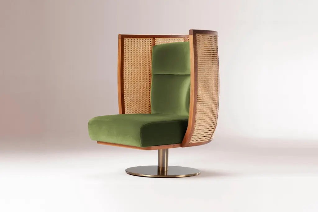 Dooq Swivel Egoísta Armchair With Solid Walnut, Rattan And Green Velvet