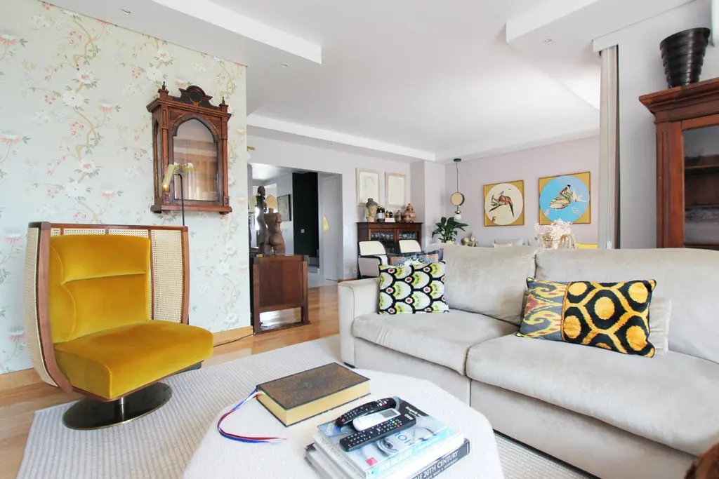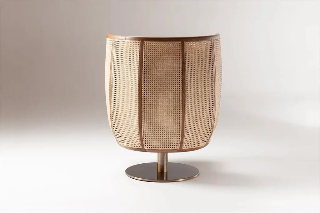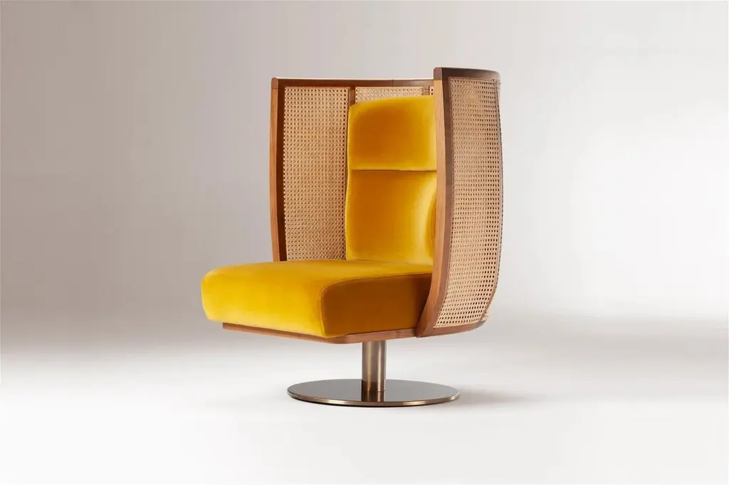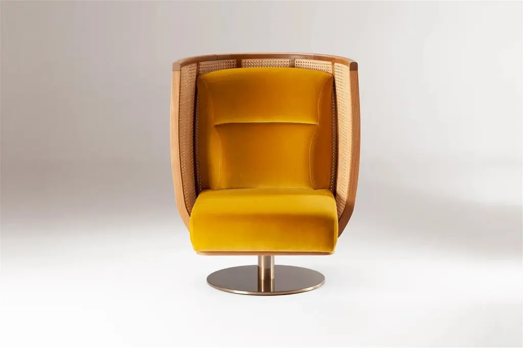 Dooq Swivel Egoísta Armchair With Solid Walnut, Rattan And Yellow Velvet
