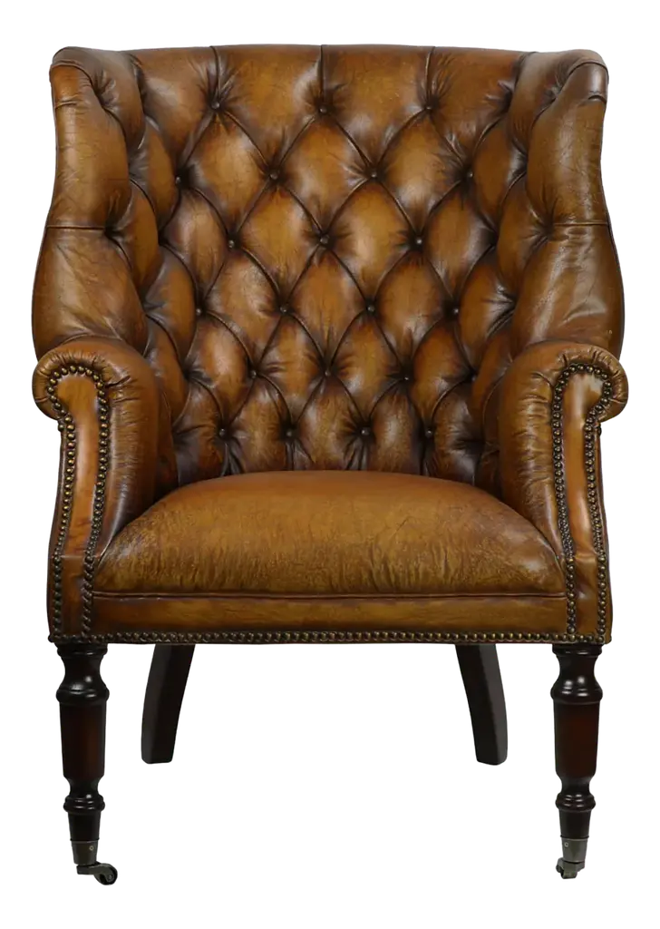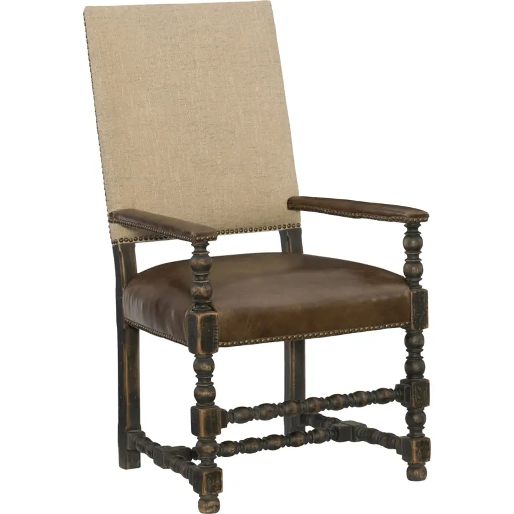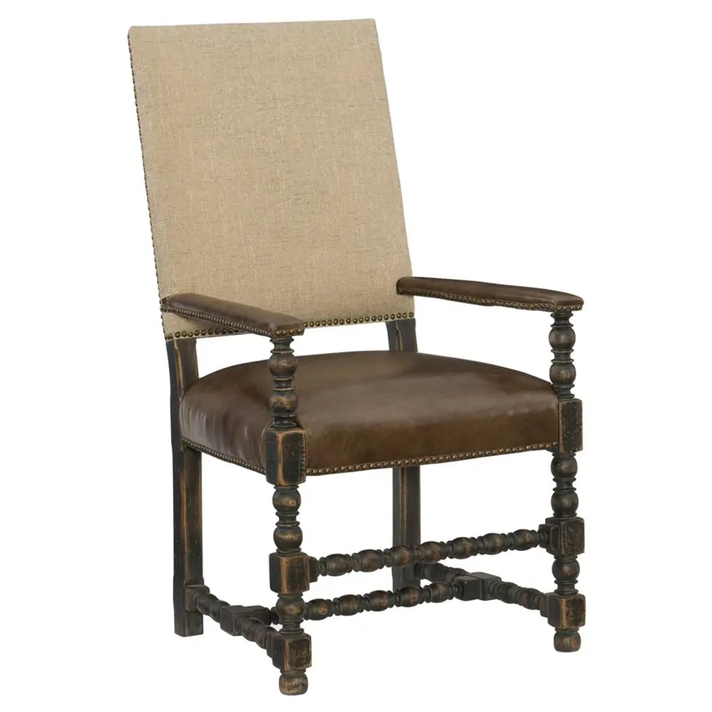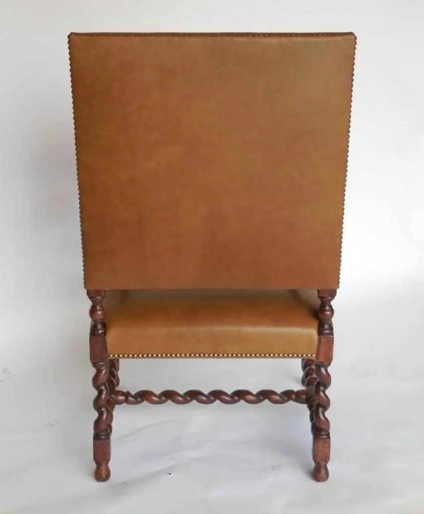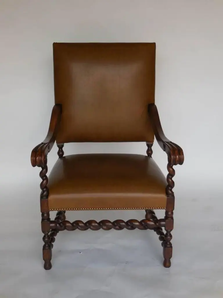 Our Custom Occasional chair in walnut with barley twist legs and stretchers. Beautifully carved scrolled arms. As shown in COL and nail heads. Can be made in any finish, in solid Walnut or Mahogany. Made in Los Angeles by Dos Gallos Studio. PRICES ARE SUBJECT TO CHANGE. PLEASE INQUIRE BEFORE PLACING AN ORDER. CUSTOM ORDERS ARE NON RETURNABLE. FINAL SALE