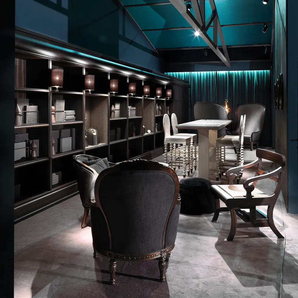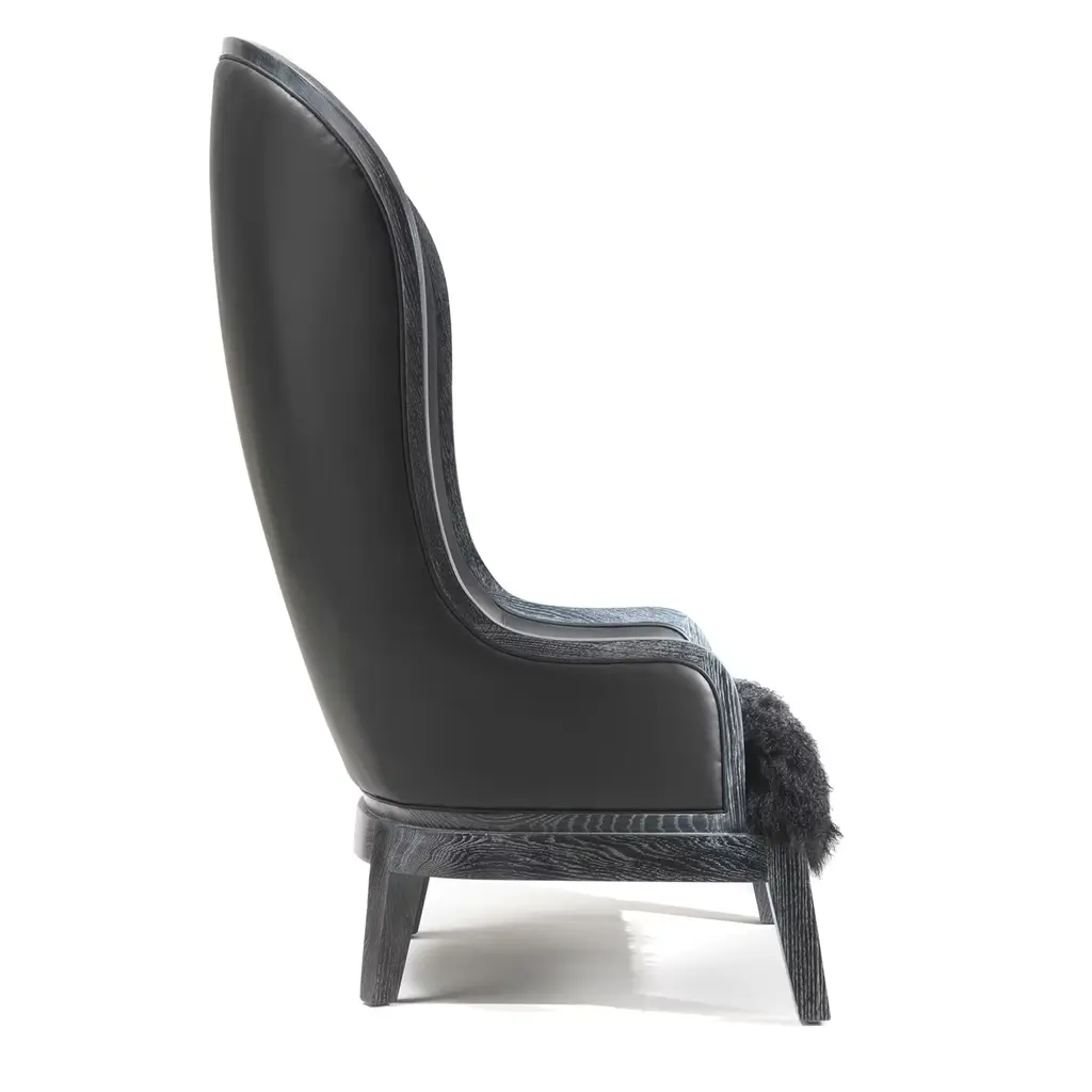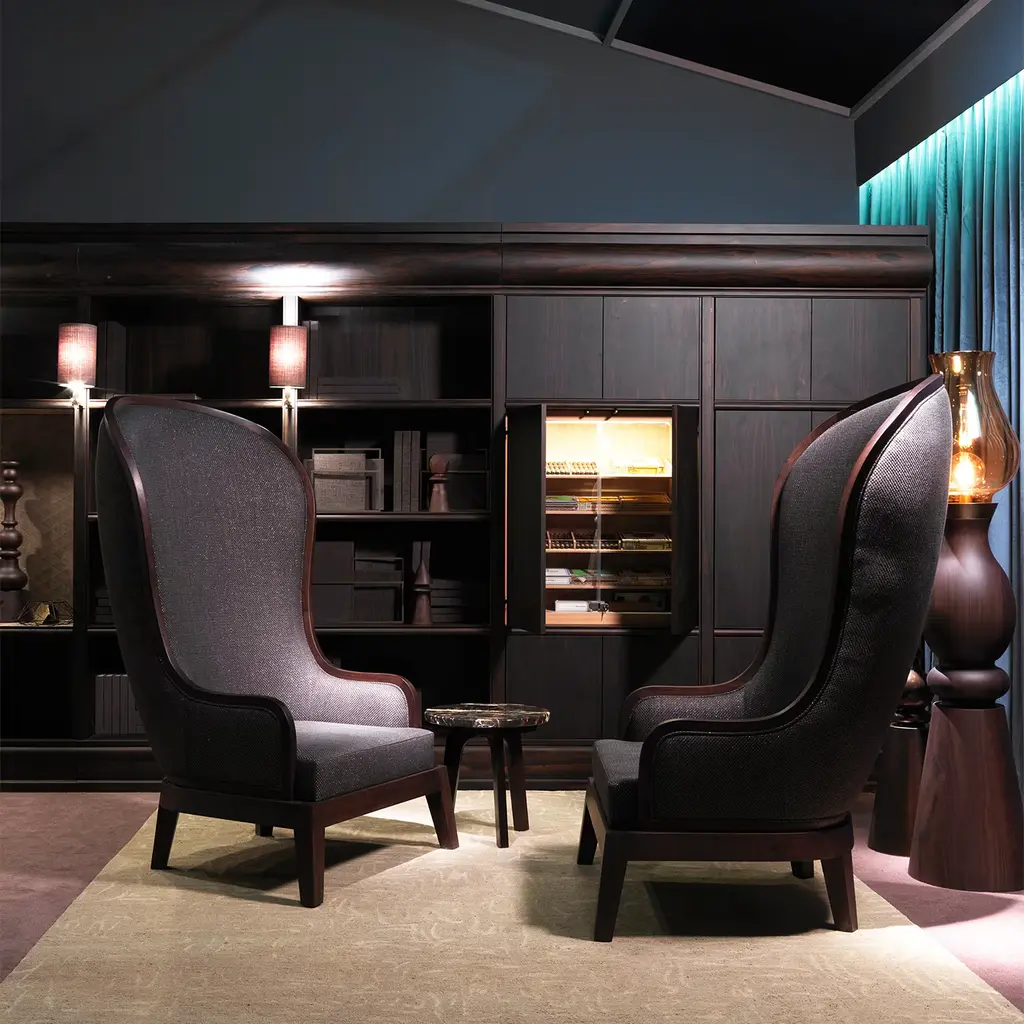 The imposing seat Duchess of Home designed by Archer Humphryes Architects is composed of a tall back, contoured by a wooden frame following its perimeter and, a solid dark American walnut wooden base. The flowing silhouette of the armchair can be embellished by peculiar upholstery of Quasinero fabric.