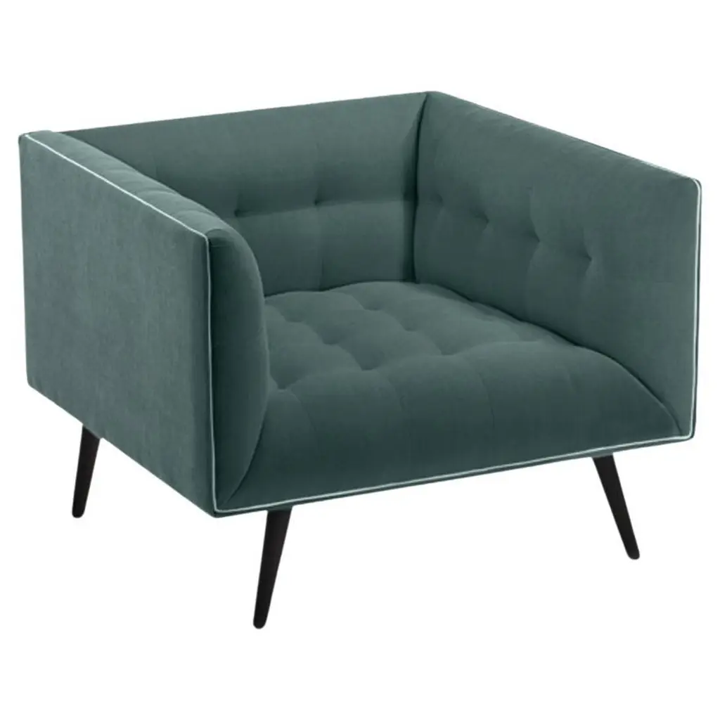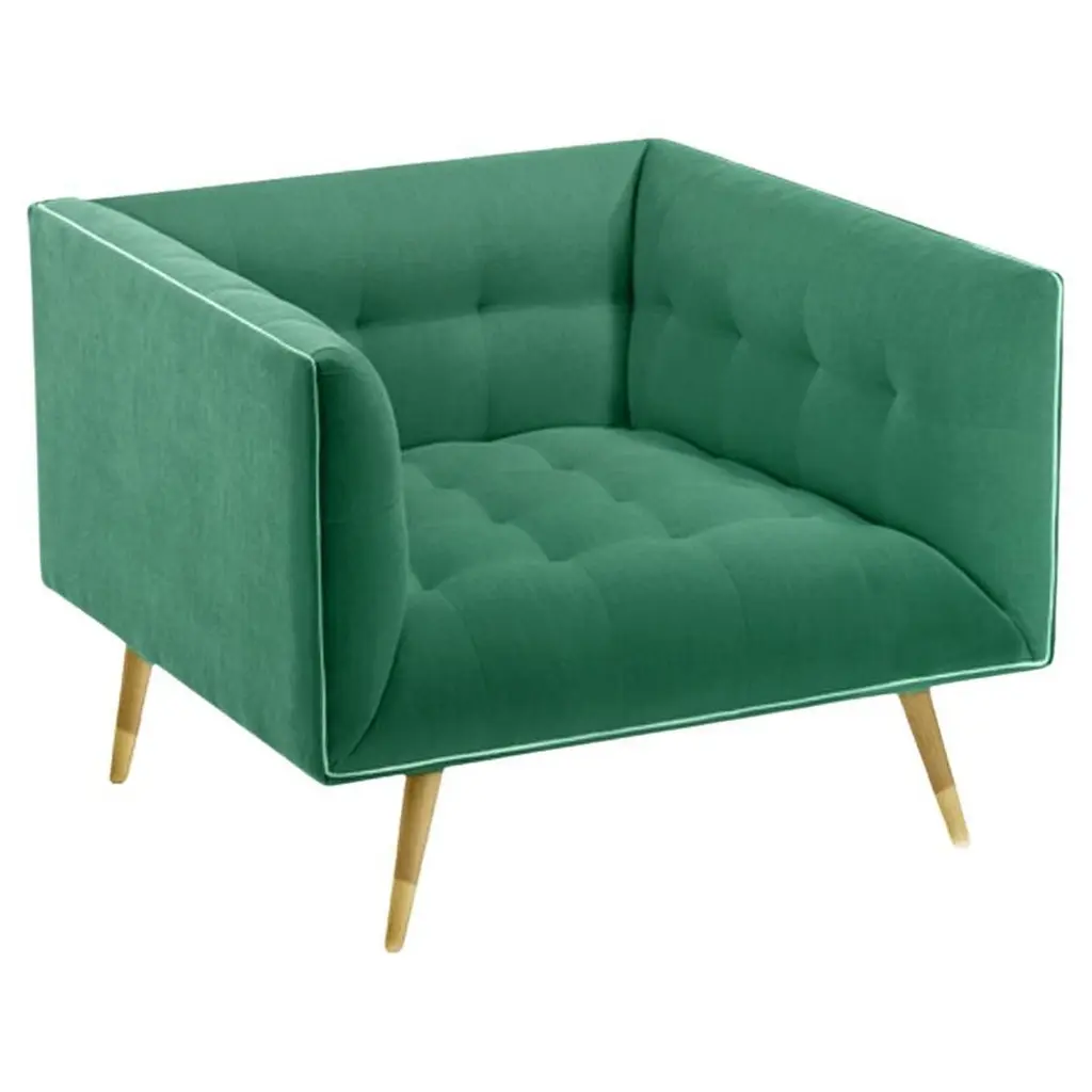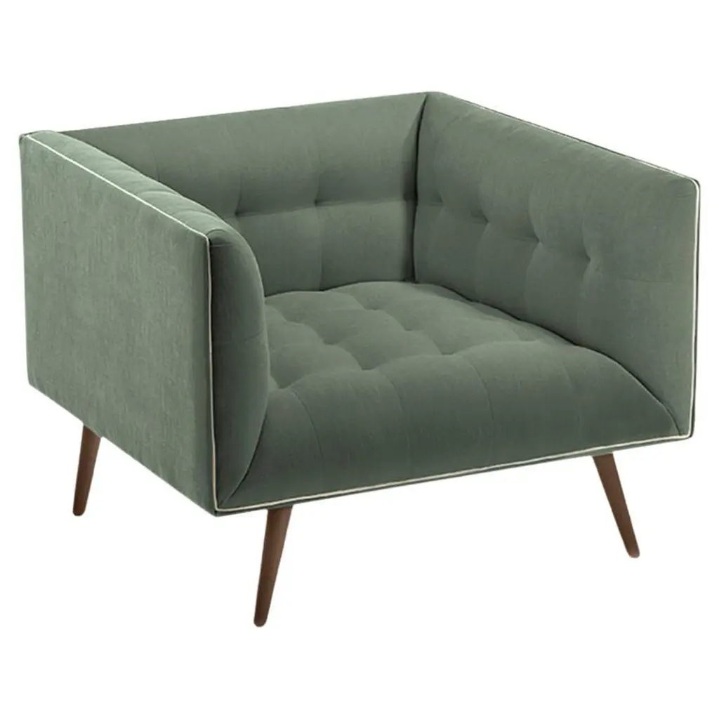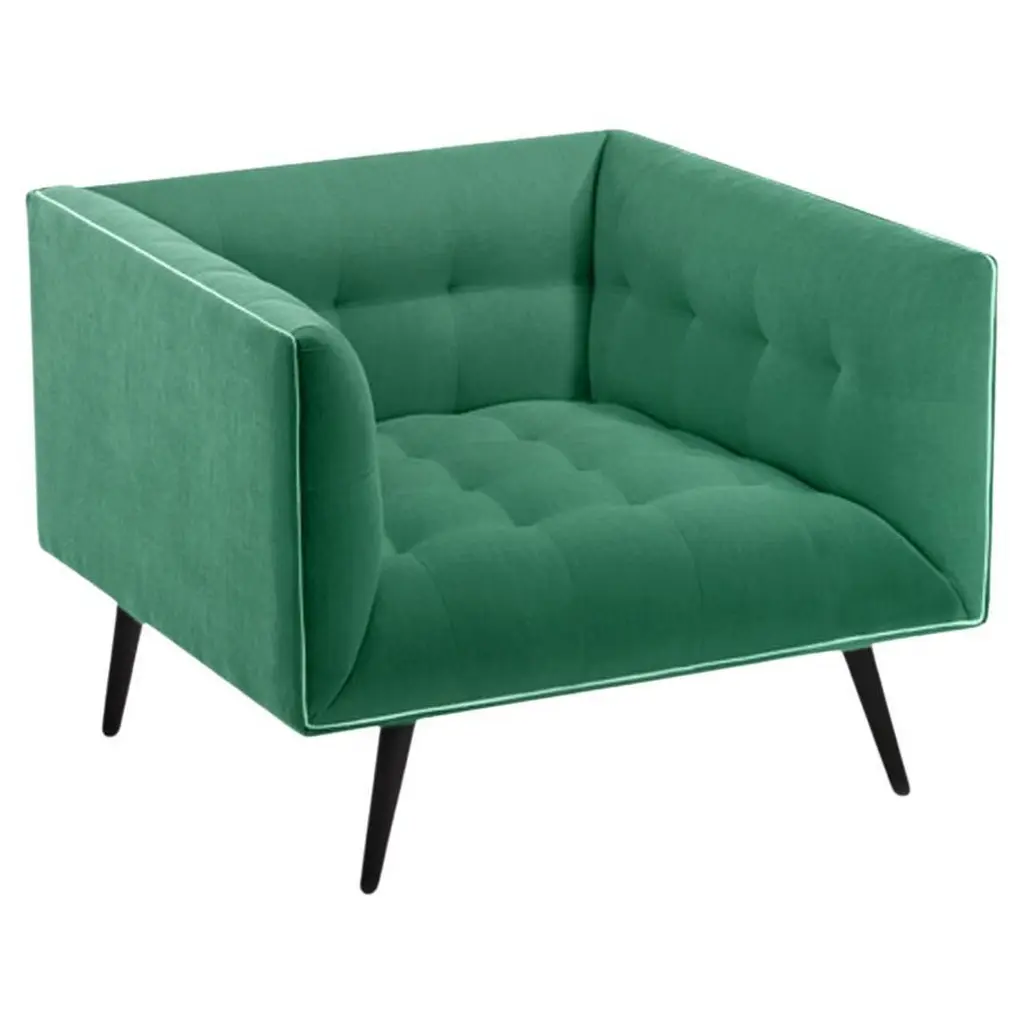 The Dust Armchair is constructed in solid wood, with an elevated tufted elegant look and a comfortable seating. Handmade with a solid wood base and wood legs. Polished brass metal feet detail is available as an option.The Dust Armchair is available in a number of different materials, finishes and combinations.Wood finish and upholstery can be fully customizedCOM Available : Upholstery 5 yards, piping 0.7 yardsMaterialUpholstery : Velvet Fabric, Boucle Fabric, COMWood legs : Solid Wood baseMetal foot detail (on demand)DimensionsW 31” x D 35” x H 27” - Seat height 16”Pictured inSmooth 60, Smooth Shell Pipping, Beech 056-3 Solid Wood Feet