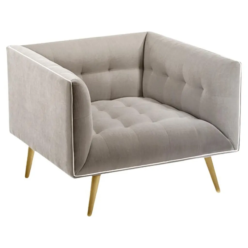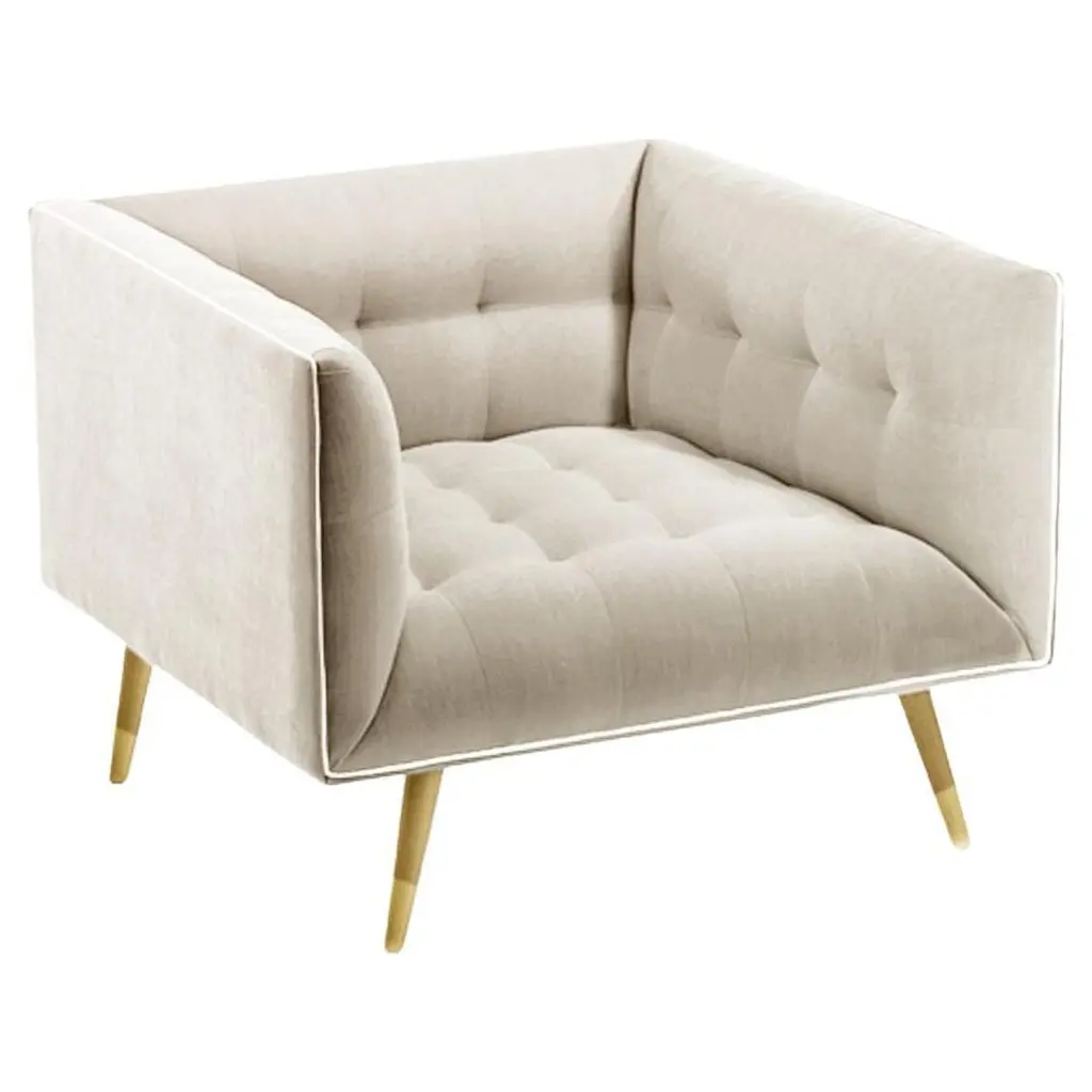 The dust armchair is constructed in solid wood, with an elevated tufted elegant look and a comfortable seating. Handmade with a solid wood base and wood legs. Polished brass metal feet detail is available as an option.The dust armchair is available in a number of different materials, finishes and combinations.Wood finish and upholstery can be fully customizedCOM Available : Upholstery 5 yards, piping 0.7 yardsMaterialUpholstery : Velvet Fabric, Boucle Fabric, COMWood legs : Solid Wood baseMetal foot detail (on demand)DimensionsW 31” x D 35” x H 27” - Seat height 16”Pictured inSmooth 60, smooth shell pipping, beech 056-3 solid wood feet.