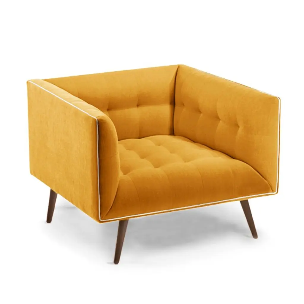 The Dust armchair is constructed in solid wood, with an elevated tufted elegant look and a comfortable seating. Handmade with a solid wood base and wood legs. Polished brass metal feet detail is available as an option.The Dust Armchair is available in a number of different materials, finishes and combinations.Wood finish and upholstery can be fully customizedCOM Available : Upholstery 5 yards, piping 0.7 yardsMaterialUpholstery : Velvet Fabric, Boucle Fabric, COMWood legs : Solid Wood baseMetal foot detail (on demand)DimensionsW 31” x D 35” x H 27” - Seat height 16”Pictured inSmooth 60, Smooth Shell Pipping, Beech 056-3 Solid Wood Feet.