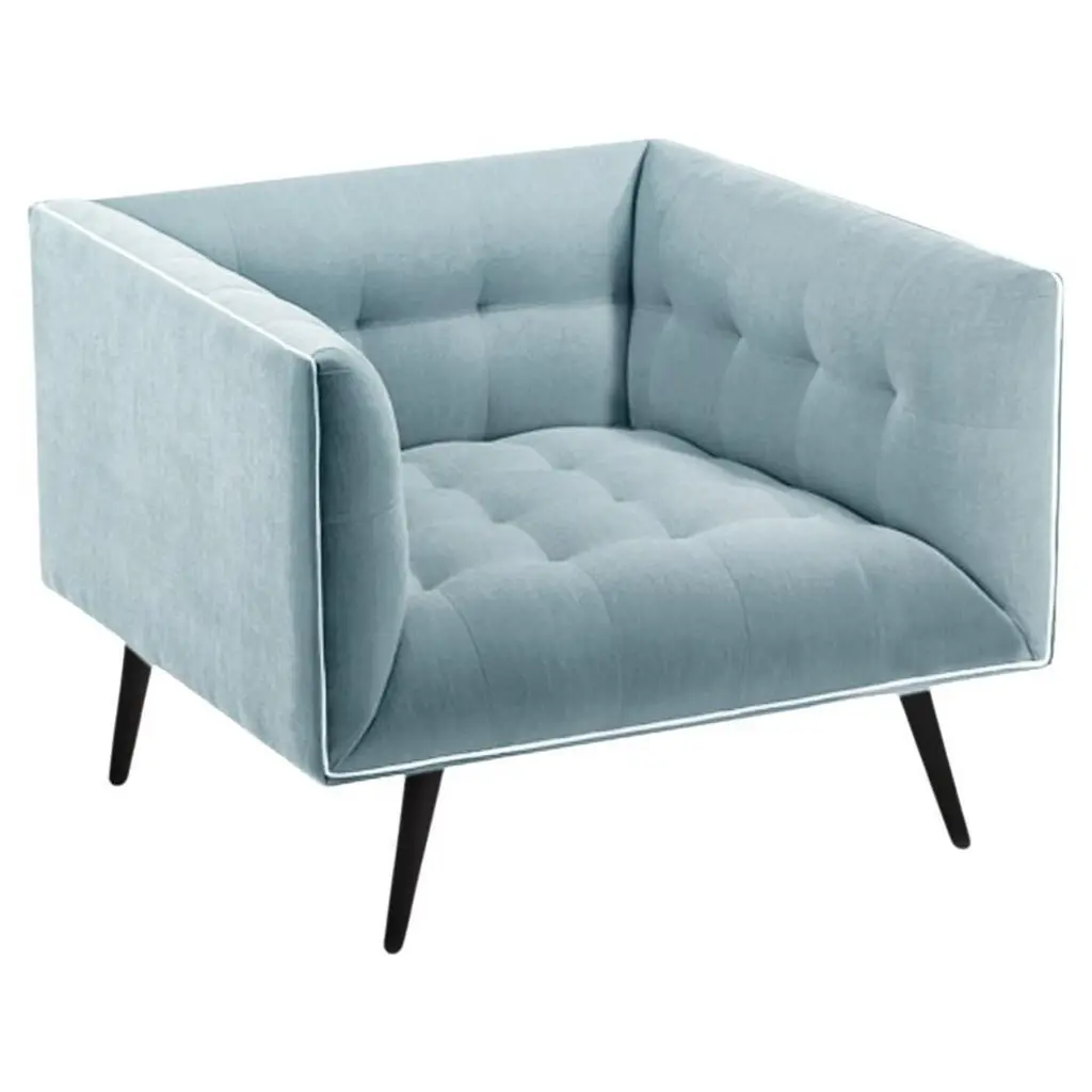 The Dust Armchair is constructed in solid wood, with an elevated tufted elegant look and a comfortable seating. Handmade with a solid wood base and wood legs. Polished brass metal feet detail is available as an option.The Dust Armchair is available in a number of different materials, finishes and combinations.Wood finish and upholstery can be fully customizedCOM Available : Upholstery 5 yards, piping 0.7 yardsMaterialUpholstery : Velvet Fabric, Boucle Fabric, COMWood legs : Solid Wood baseMetal foot detail (on demand)DimensionsW 31” x D 35” x H 27” - Seat height 16”Pictured inSmooth 60, smooth shell pipping, beech 056-3 solid wood feet.