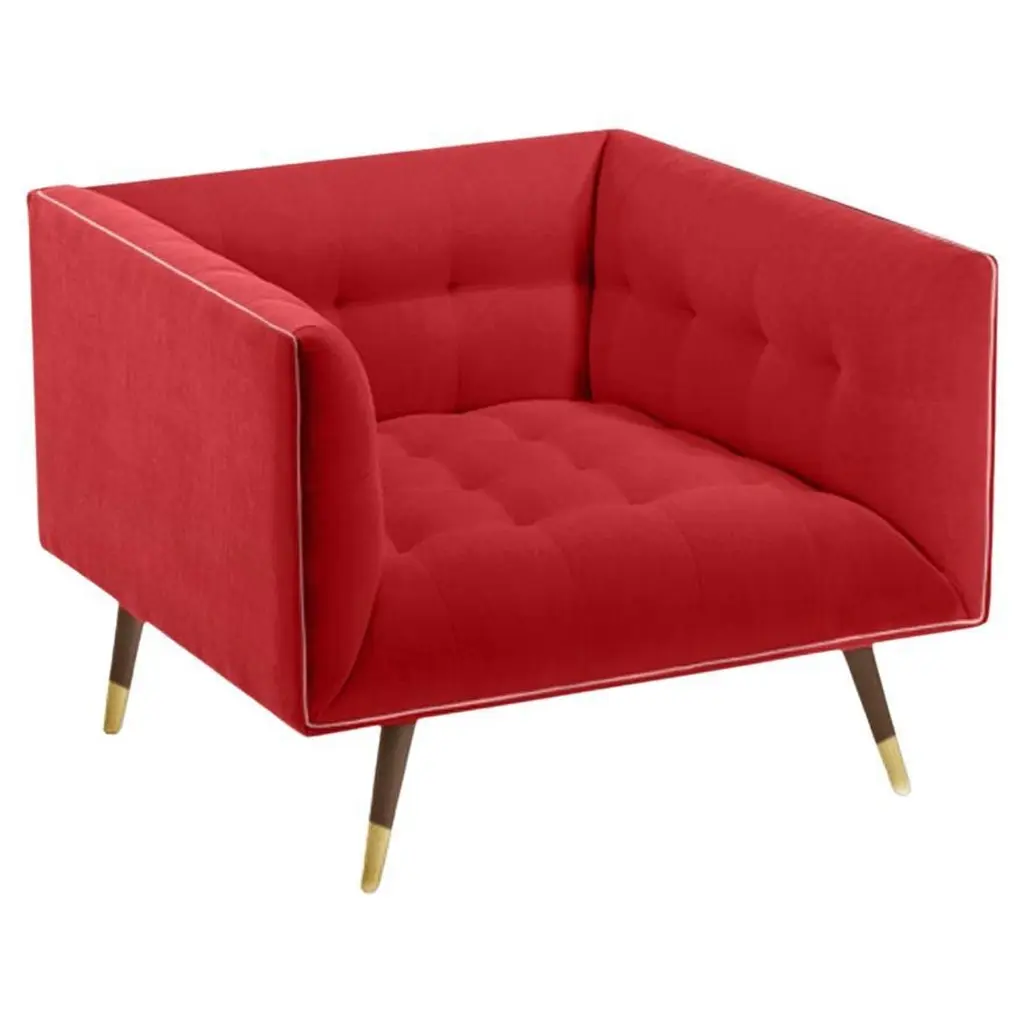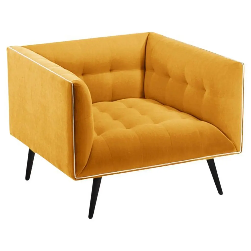 The Dust armchair is constructed in solid wood, with an elevated tufted elegant look and a comfortable seating. Handmade with a solid wood base and wood legs. Polished brass metal feet detail is available as an option.The Dust Armchair is available in a number of different materials, finishes and combinations.Wood finish and upholstery can be fully customizedCOM Available : Upholstery 5 yards, piping 0.7 yardsMaterialUpholstery : Velvet Fabric, Boucle Fabric, COMWood legs : Solid Wood baseMetal foot detail (on demand)DimensionsW 31” x D 35” x H 27” - Seat height 16”Pictured inSmooth 60, Smooth Shell Pipping, Beech 056-3 Solid Wood Feet.