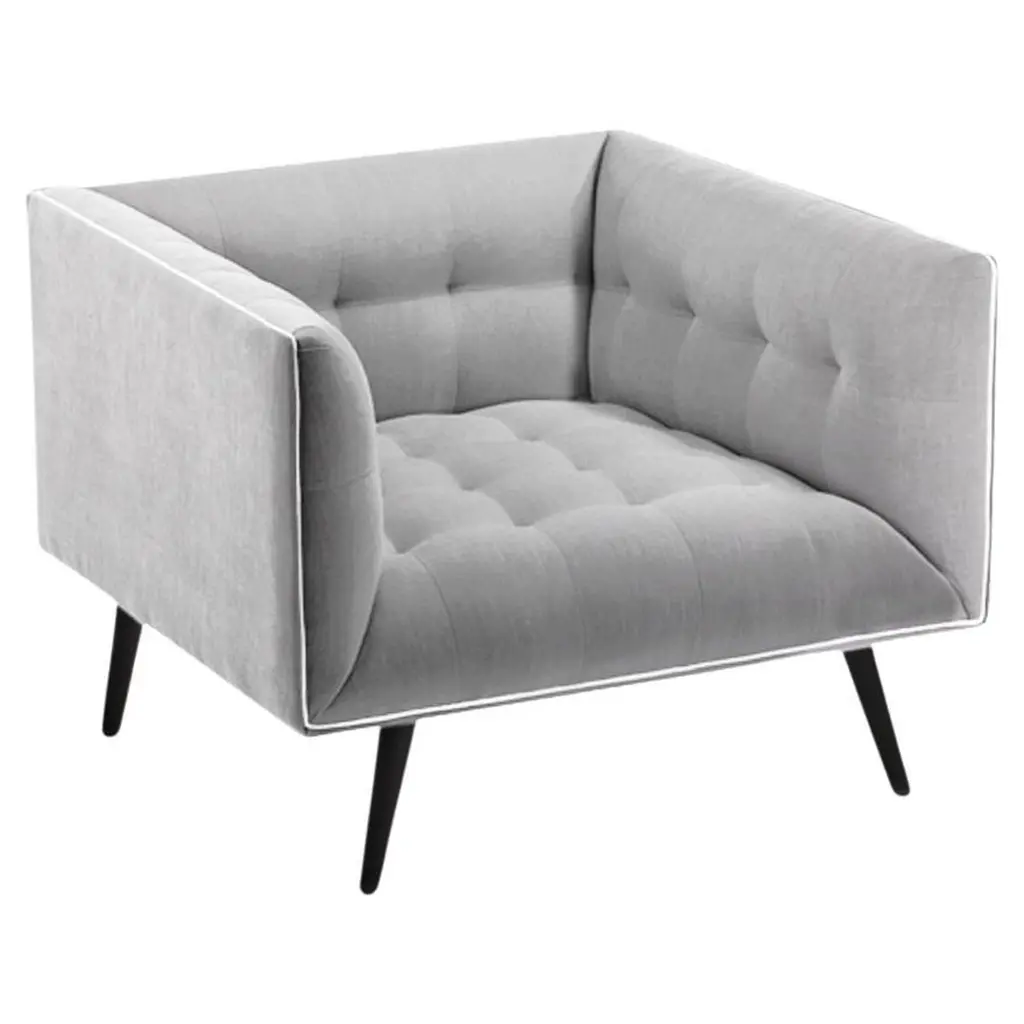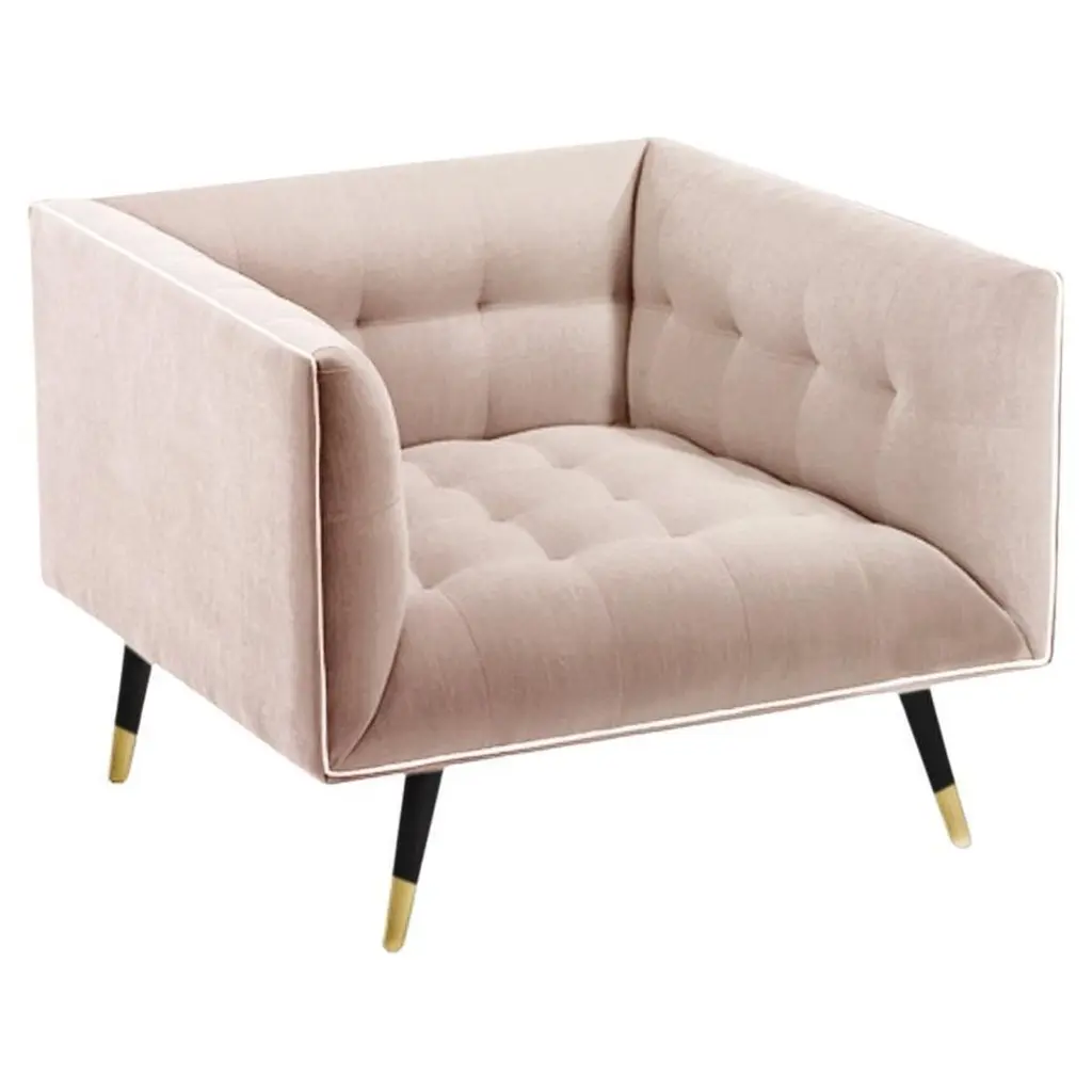 The Dust armchair is constructed in solid wood, with an elevated tufted elegant look and a comfortable seating. Handmade with a solid wood base and wood legs. Polished brass metal feet detail is available as an option.The Dust Armchair is available in a number of different materials, finishes and combinations.Wood finish and upholstery can be fully customizedCOM Available : Upholstery 5 yards, piping 0.7 yardsMaterialUpholstery : Velvet Fabric, Boucle Fabric, COMWood legs : Solid Wood baseMetal foot detail (on demand)DimensionsW 31” x D 35” x H 27” - Seat height 16”Pictured inSmooth 60, Smooth Shell Pipping, Beech 056-3 Solid Wood Feet.