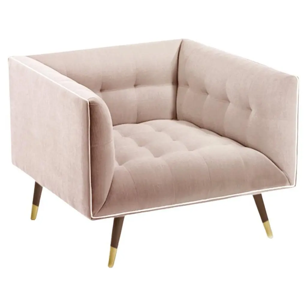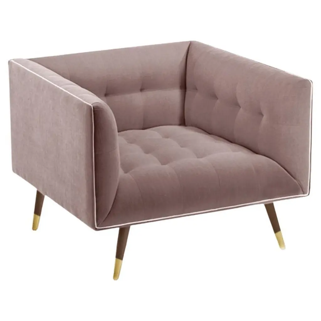 The dust armchair is constructed in solid wood, with an elevated tufted elegant look and a comfortable seating. Handmade with a solid wood base and wood legs. Polished brass metal feet detail is available as an option.The dust armchair is available in a number of different materials, finishes and combinations.Wood finish and upholstery can be fully customizedCOM available : upholstery 5 yards, piping 0.7 yardsMaterialUpholstery: velvet fabric, boucle fabric, COMWood legs: solid wood baseMetal foot detail (on demand)DimensionsW 31” x D 35” x H 27” - Seat height 16”Pictured inSmooth 60, smooth shell pipping, beech 056-3 solid wood feet.