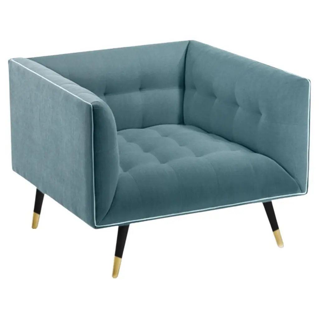 The Dust armchair is constructed in solid wood, with an elevated tufted elegant look and a comfortable seating. Handmade with a solid wood base and wood legs. Polished brass metal feet detail is available as an option.The Dust Armchair is available in a number of different materials, finishes and combinations.Wood finish and upholstery can be fully customizedCOM Available : Upholstery 5 yards, piping 0.7 yardsMaterialUpholstery : Velvet Fabric, Boucle Fabric, COMWood legs : Solid Wood baseMetal foot detail (on demand)DimensionsW 31” x D 35” x H 27” - Seat height 16”Pictured inSmooth 60, Smooth Shell Pipping, Beech 056-3 Solid Wood Feet.