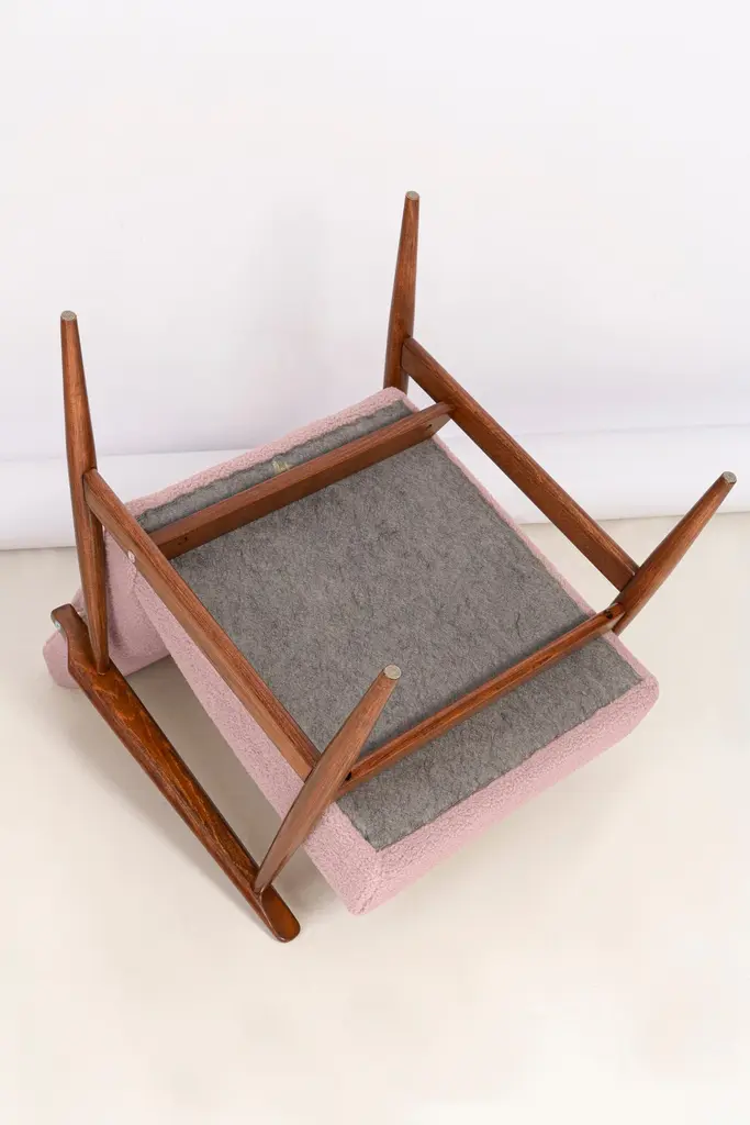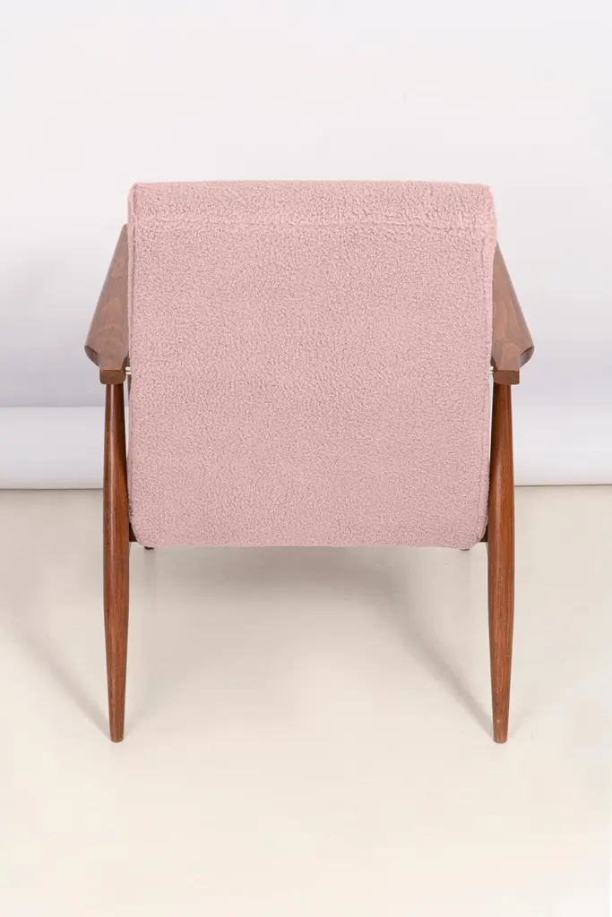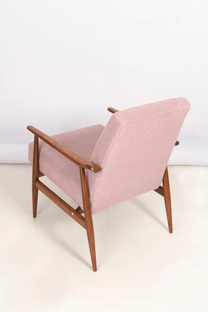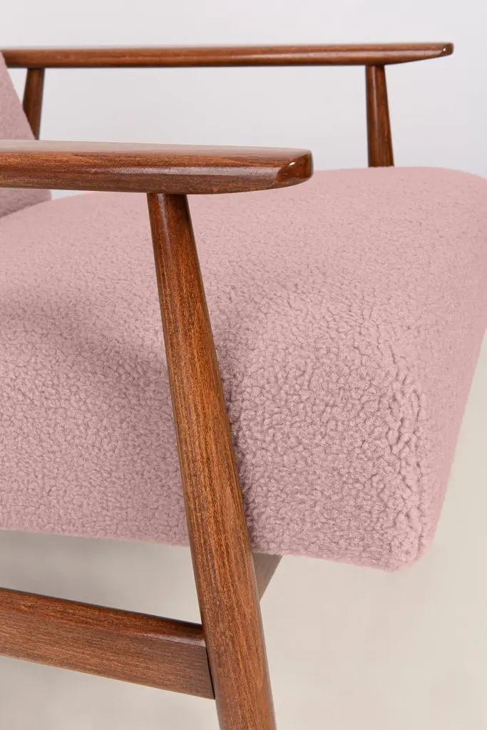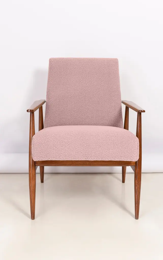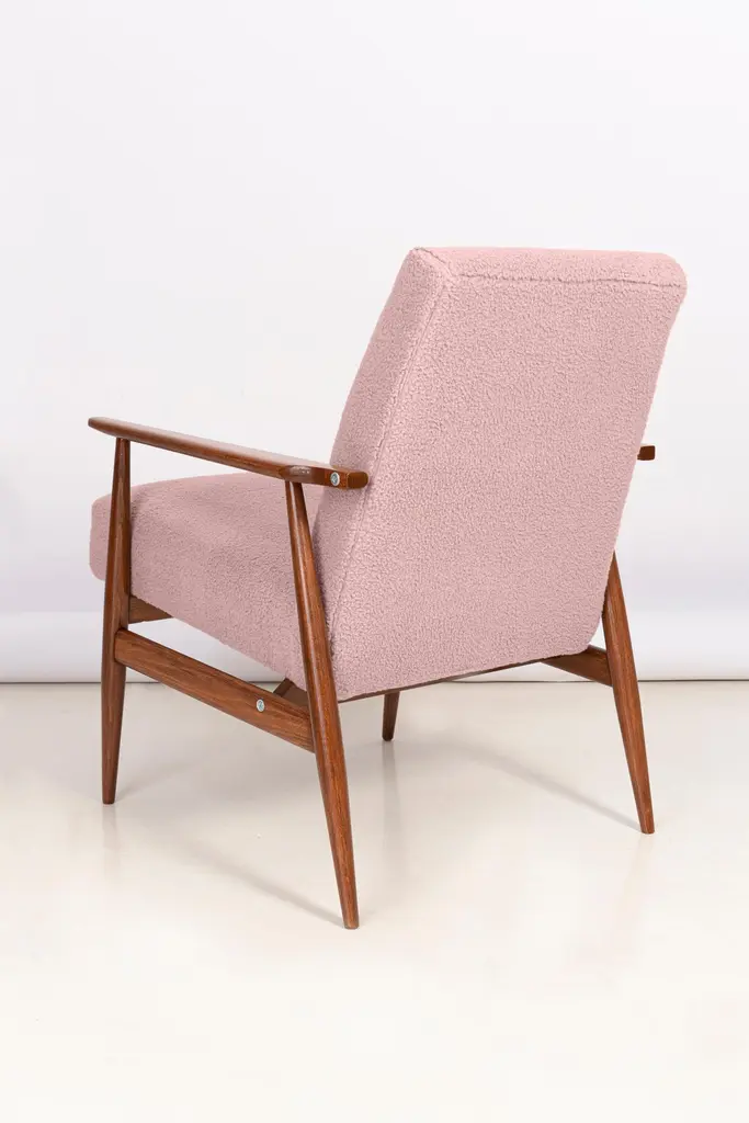 Dusty Pink bouclé armchair, designed by Henryk Lis. Furniture after full carpentry and upholstery renovation. The armchair will be perfect in Minimalist spaces, both private and public. Upholstery, faux fur has a structure reminiscent of a dense, fleshy, slightly rough sheep fleece. This is one of those upholstery fabrics whose haptic (tactile) qualities are as important as strength, pattern or color. It is characterized by a knotty weave, high basis weight and abrasion resistance. It is available in 10 subdued colors, inspired by the natural colors of wool. Used fabric it's color 03 from the last picture. We can prepare this armchair in different color of fabric and wood.