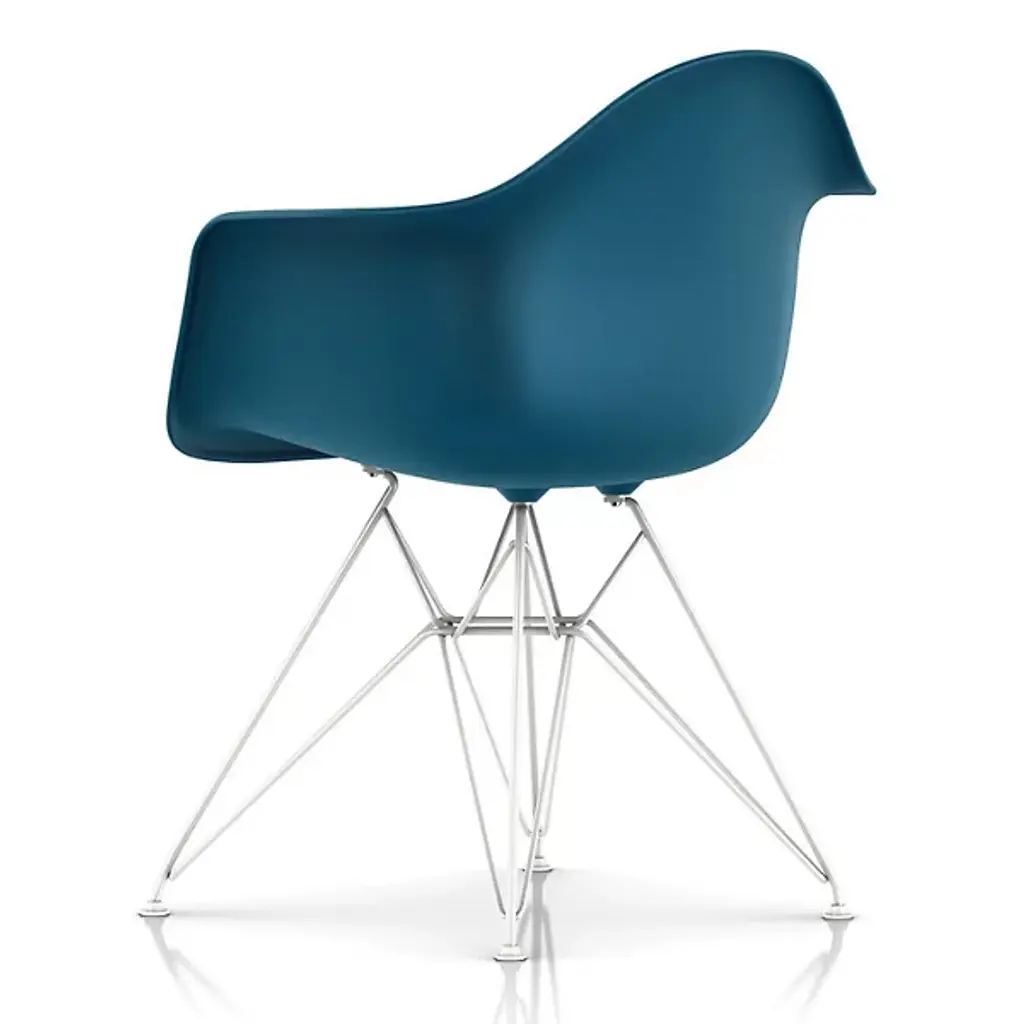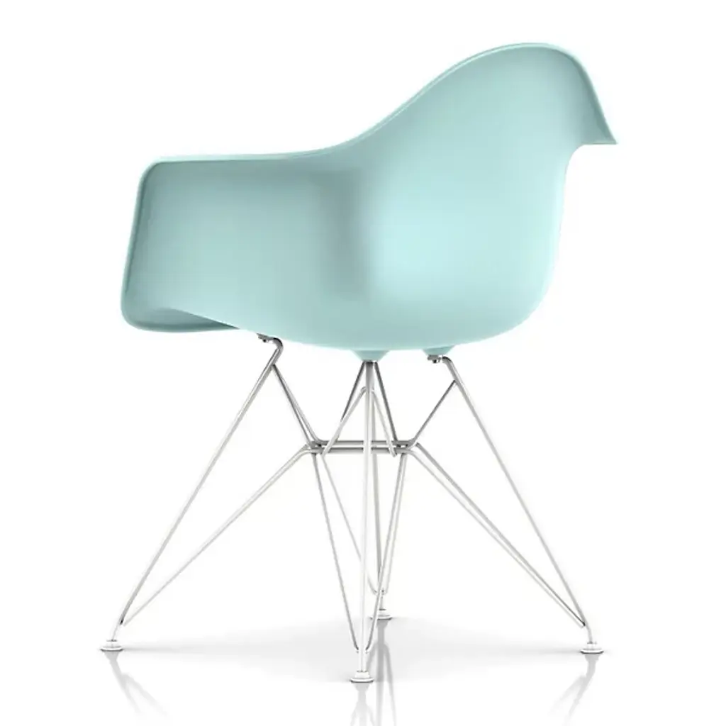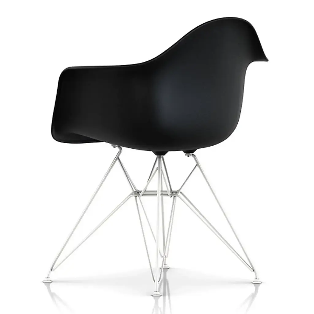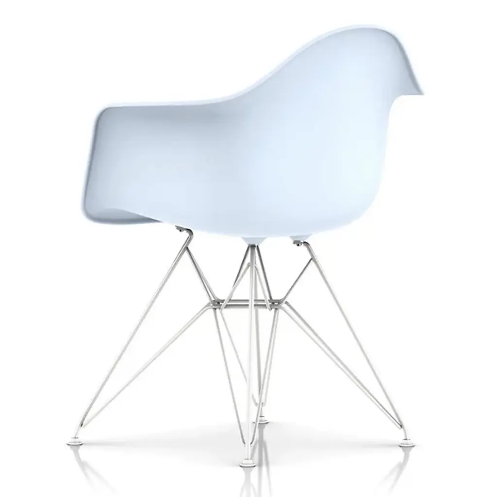 Enhance modern interiors with the clever, curving comfort of the Eames Molded Plastic Armchair - Wire Base from Herman Miller. A stately update to the storied classic, its single-piece seat is sculpted to fit the physical form with the traditional Herman Miller flair, supporting the physical form while resting atop a robust wire frame that brings a complex, Eiffel-like airiness to its character. Each seat is constructed entirely from recycled materials, the soft curves contrasting well with the angular presence of the frame, creating an enduring and involved elegance that still offers outstanding support.