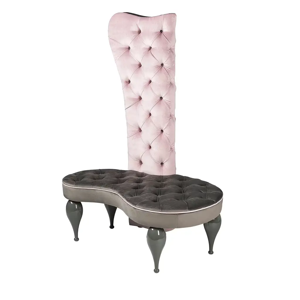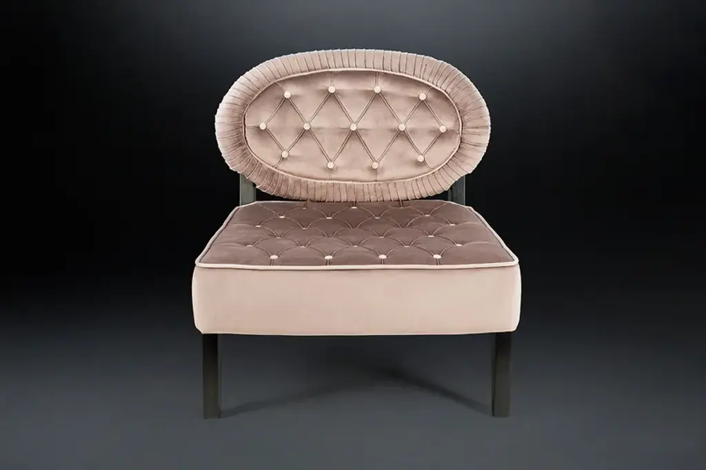 Elegant and exclusive armchair characterized by a comfortable seat and an oval back. The structure is made of wood and its capitonné covering is proposed on delicate tones of taupe, in a soft fabric. The pillow is presented in old pink colour, while hems and buttons of the seat are in dove gray. Delicate nuances for a timeless elegance. The seat can be customized with a wide range of fabrics and colors.