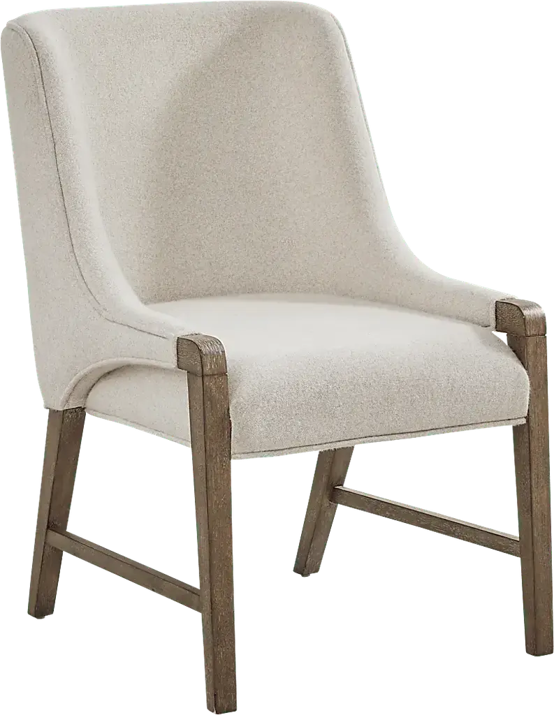 A contemporary-style upholstered armchair that's perfect for living room, dining room, and seating area use. This stylish design comes in a clean ivory fabric and features dramatic swoop arms. The brown wood legs are a lovely contrast that adds to the look.