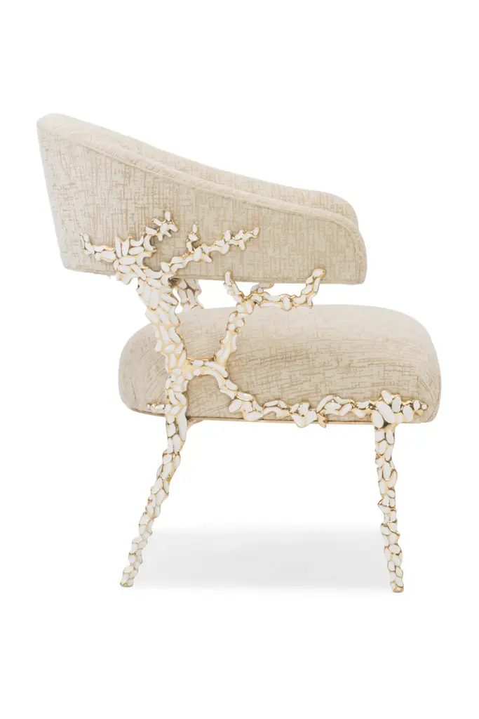 Bold in character, this dazzling chair is unique in every way. Its one-of-a-kind shape was born from design exploration of the organic beauty and inspiration found in nature. Cast in solid brass and finished in Gold Brush with white enamel, it has the feel of branches or coral reaching up toward the light. Richly upholstered in a soft, textured neutral, this remarkable creation conveys an attitude of modern opulence.