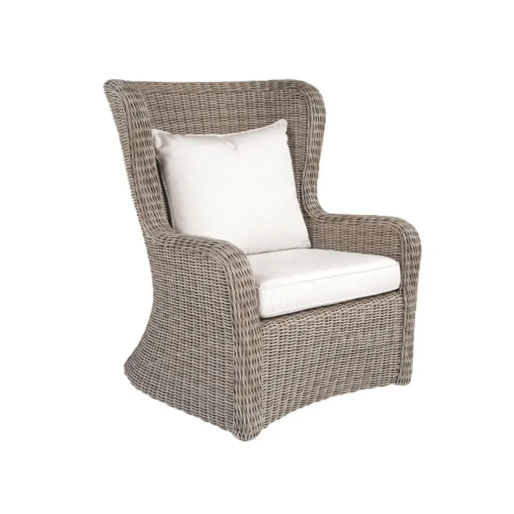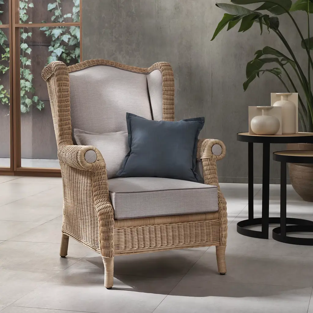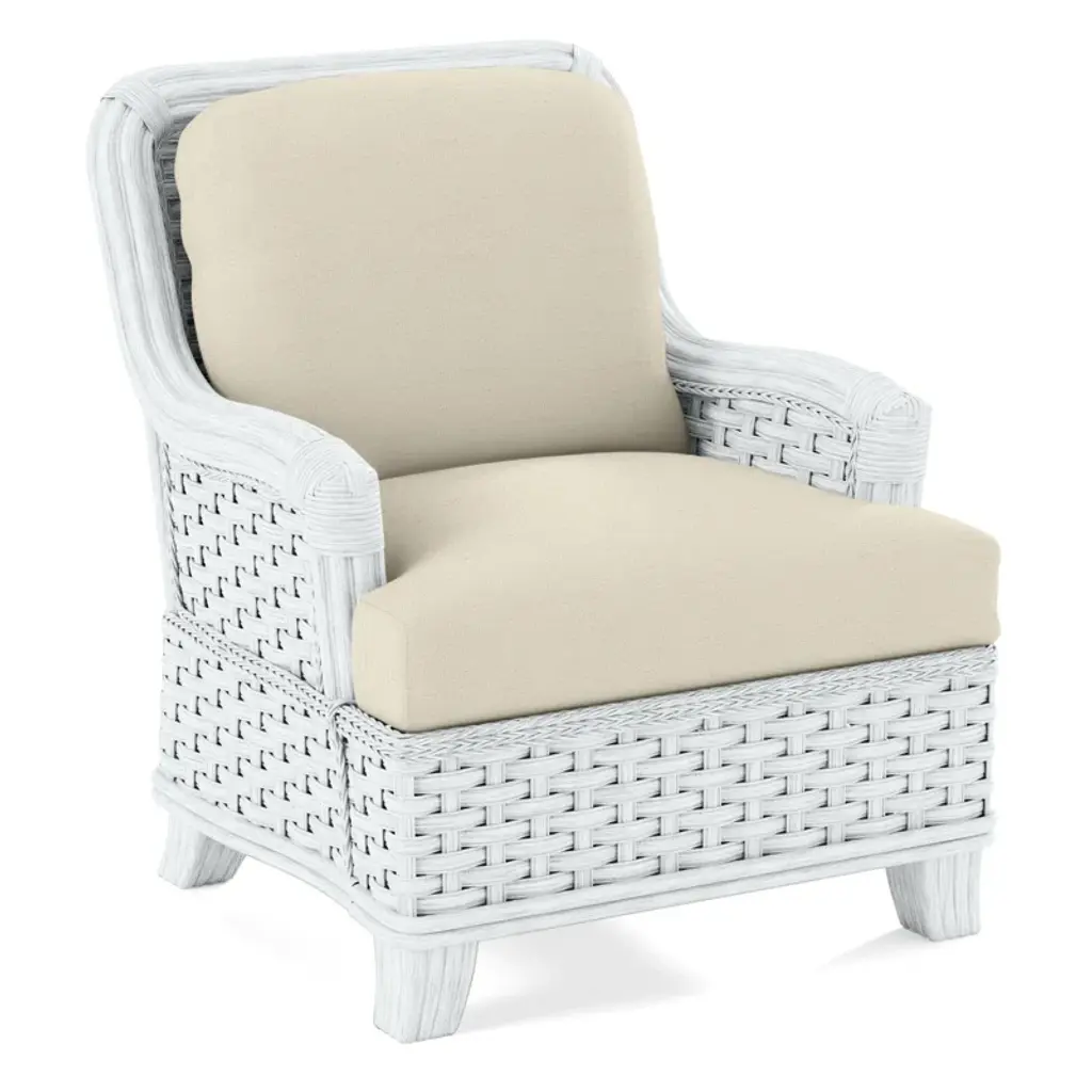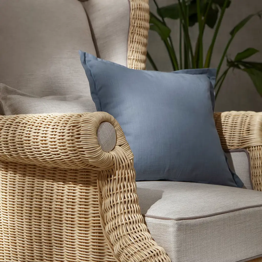 The intriguing curves traditionally tracing the silhouette of a bergére also outline this precious armchair, a masterpiece of manual wicking. Fresh beige linen upholsters the inside, and the cushion's cover is removable for ensuring utmost hygiene and practicality. A superb addition to rustic-chic decors, it undergoes a protective water-based treatment.