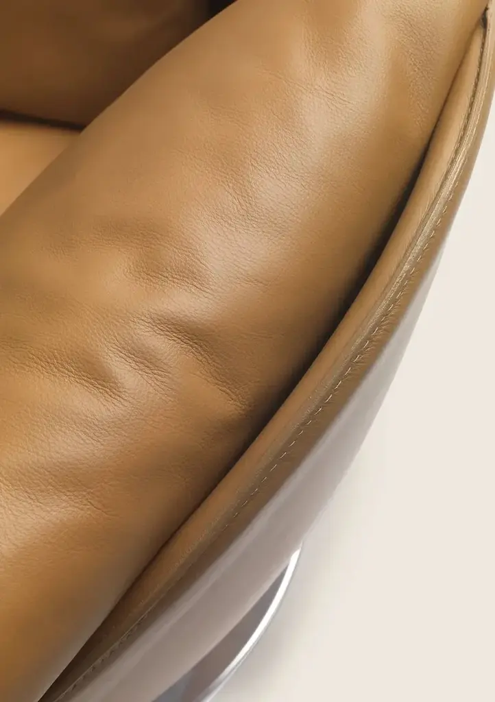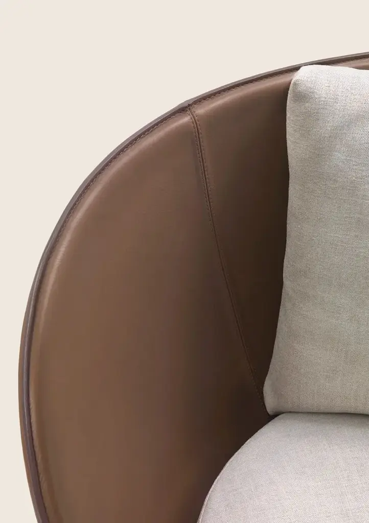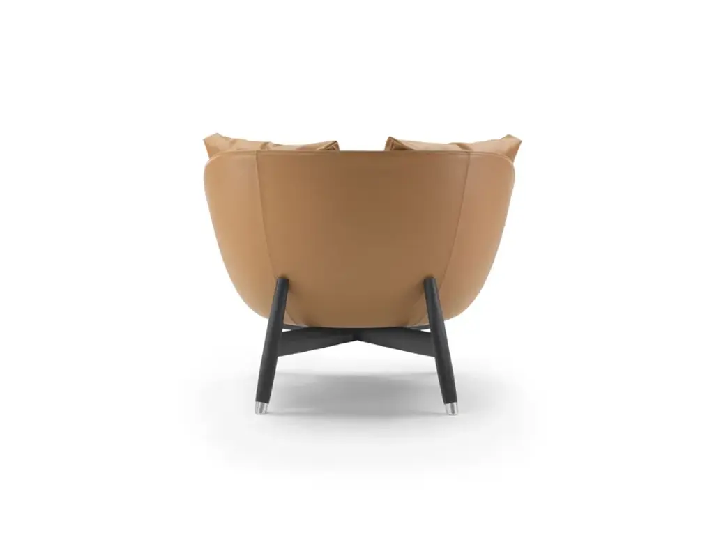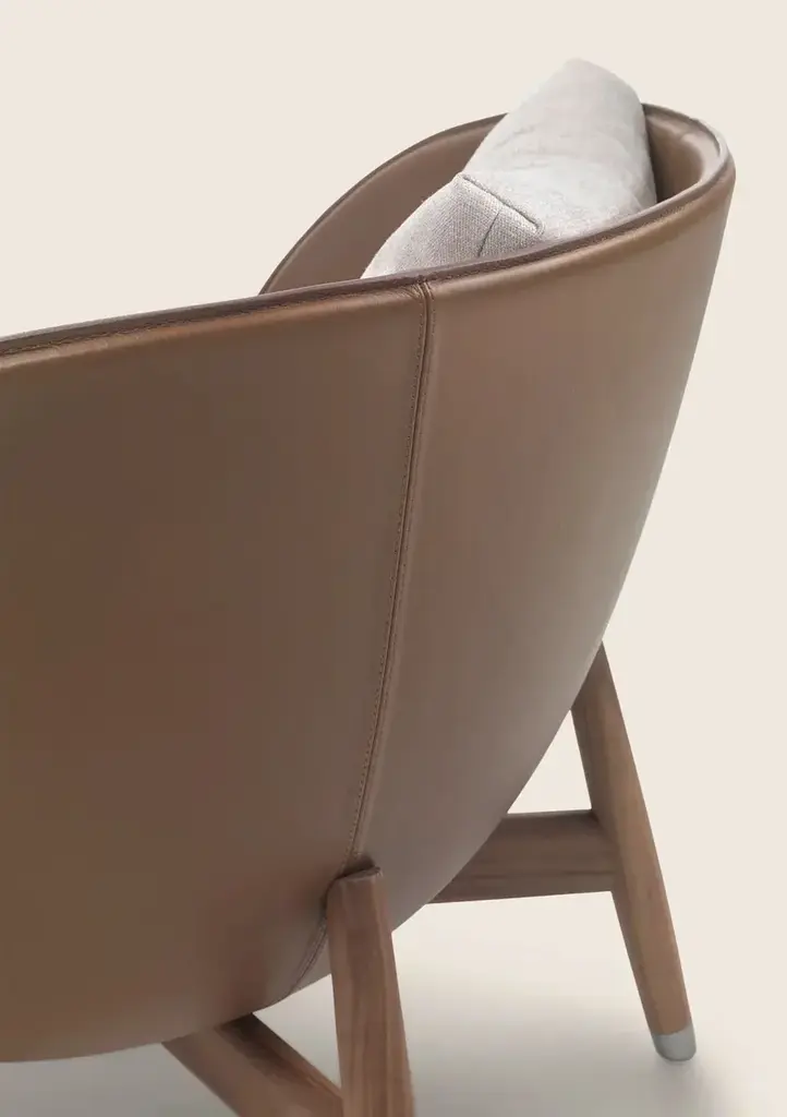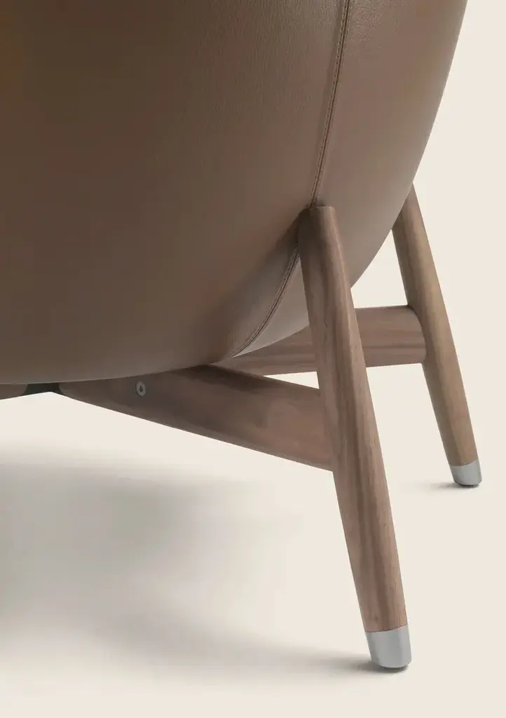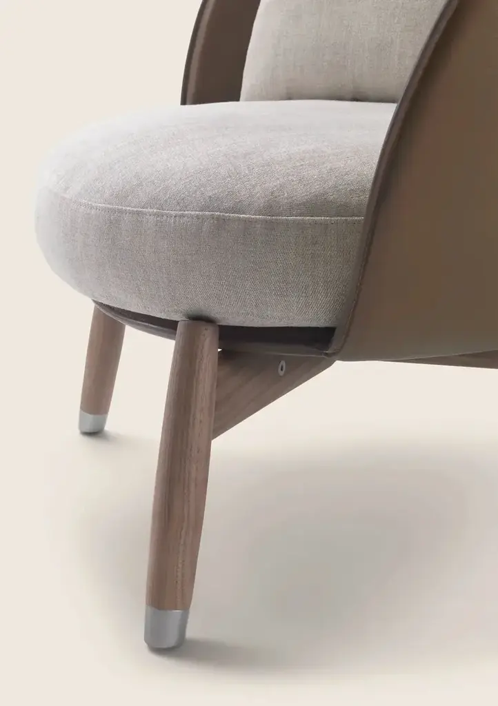 ERI is a removable armchair in leather or fabric.Elegant turned and hand-finished wooden legs support an upholstered shell with balanced proportions, which cradles seat and back cushions made of soft goose down, construction features carefully designed to promote a satisfying sense of relaxation.FeaturesShell: in rigid polyurethane coupled with expanded polyurethane, upholstered in leather or fabric in the following combinations for the inner and outer sides: entirely in leather (all the leathers in the collection); entirely in fabric; fabric inside and leather outside (all the leathers in the collection).Seat cushion: in sterilized goose down (Assopiuma certified, gold label) with an insert in non-deformable, differentiated density material, covered in protective fabric.Base: in solid turned Canaletto walnut wood in various finishes. Frame in black painted metal, with feet in die-cast zamak in various finishes. Rests on thermoplastic material feet.Upholstery: non-removable, both in fabric and leather versions.Eri is a collection of products that includes armchairs, poufs, and coffee tables.The elegantly raised collar of a jacket is the motif that inspired the subtle design of this family.Characterized by a soft and enveloping aesthetic, each variant of Eri is carefully designed to promote a satisfying sense of relaxation and comes in a wide selection of materials and fabric coverings, creating a play of interesting combinations.