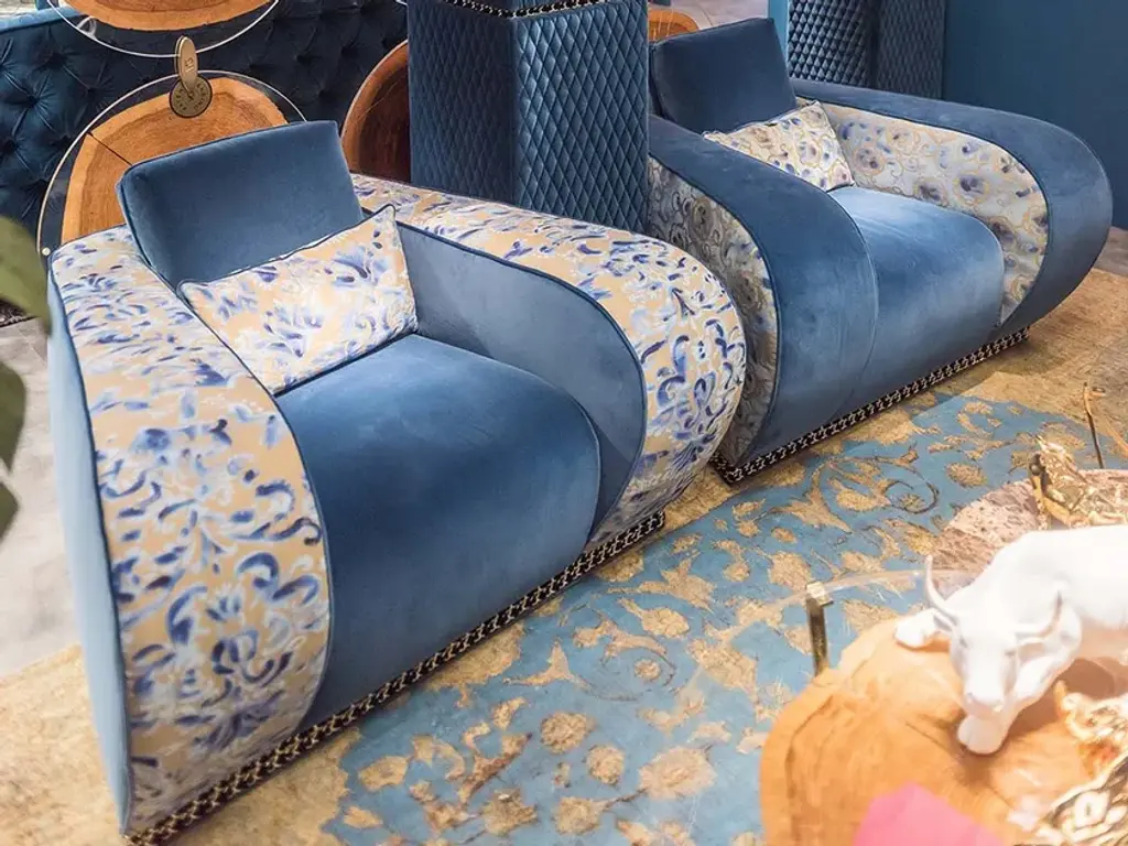 Classic armchair handcrafted by Venetian artisans, restyled by Slow+Fashion+Design for VG inspiring to antique Fortuny fabrics and Japanese shibori art. The choice of alternated textured inserts was inspired by the Yin & Yang philosophy, so that the two armchairs would complement one another.Fabrics: blue velvet and hand painted denim in gold and blue.Structure: wood, steel, water foam and kapok.Details: golden metal chain intertwined with velvet, clear reference to the fashion world.