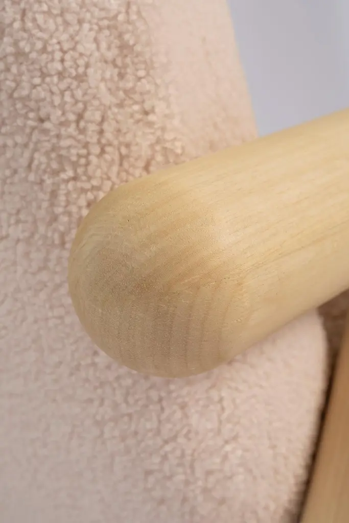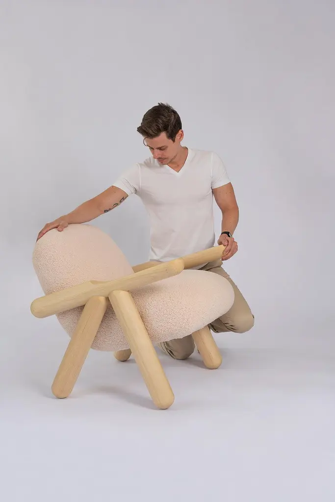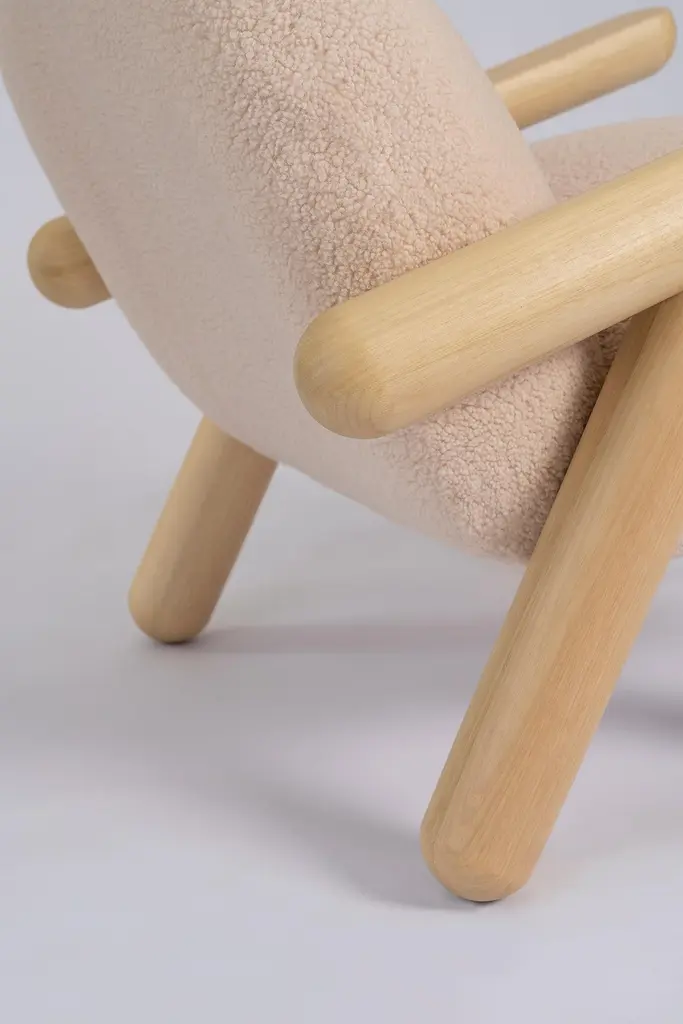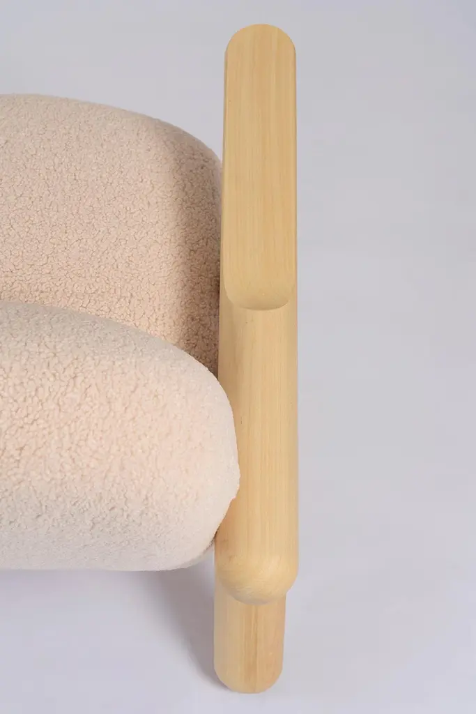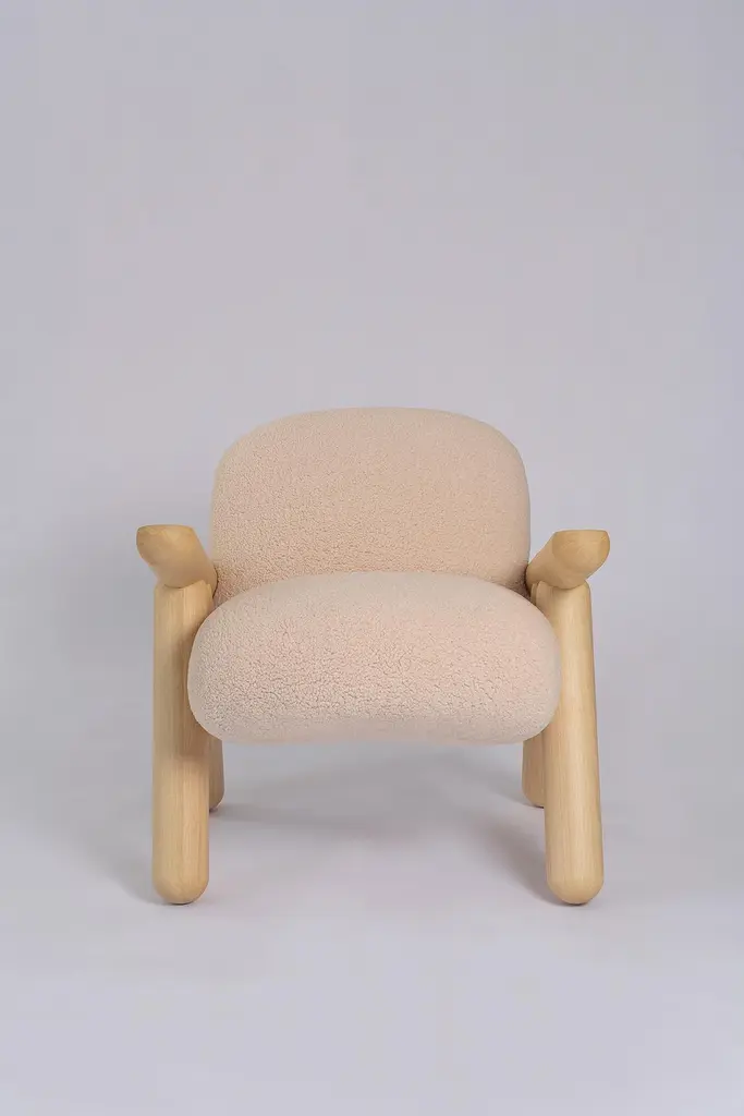"Fartura" in Portuguese, means abundance, wealth. Not in the financial sense exactly, but of everything that brings joy and happiness. It is a term widely used in Italian family meals, to represent the quantity and variety of food on the table.Fartura armchair appropriates this concept exactly, with a solid wood structure of large and succulent proportions. Inspired by the concept of Neotenic Design, extremely current and contemporary, we wanted to bring, in a piece of compact proportions, the unmistakable design of this armchair. Notice that the armchair seems to want to run away at any moment, because of the legs that refer to those of an animal.With sophisticated manufacture, capable only by the use of robots that create perfect fits for the wooden pieces, Fartura armchair has Its structure in Brazilian Tauari wood, which has a natural matte honey tone, but which can also be in a dark ebonized tone. The tapestry follows a (synthetic) sheep fur pattern in light or black.