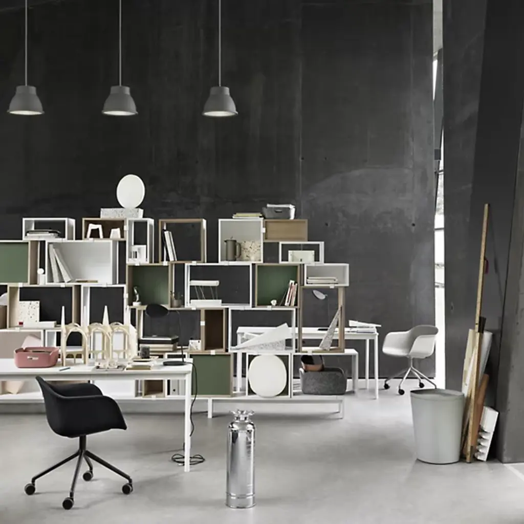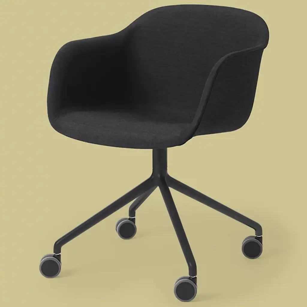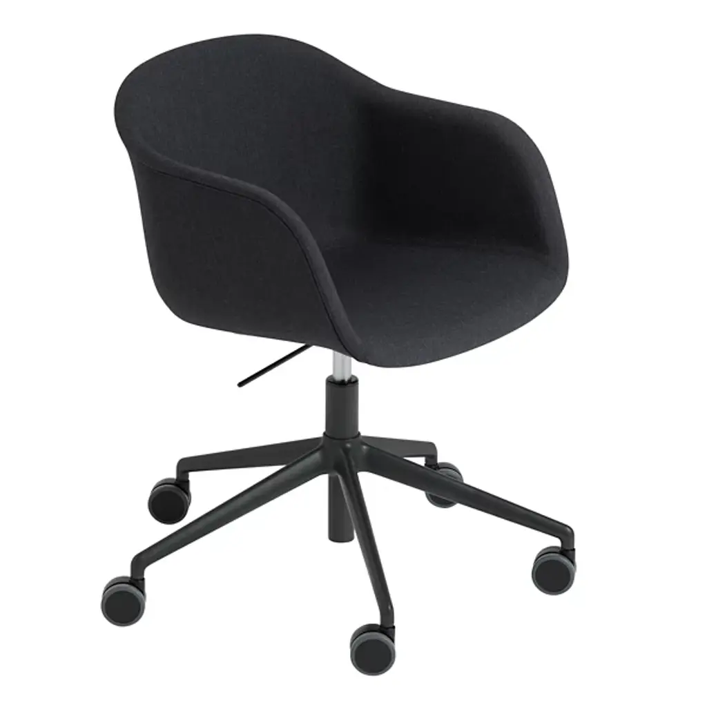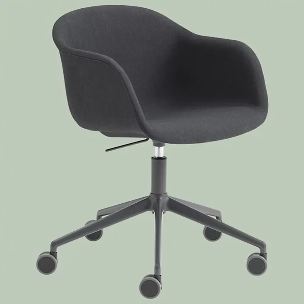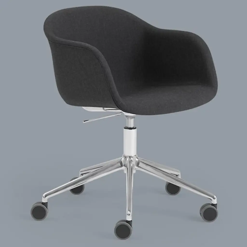 Lend a pleasing modern expression to office, waiting room, or home workspace with the Fiber Armchair with Gas Lift and Castors from Muuto. Balanced atop a five-legged aluminum frame with an array of smoothly-rotating castors below it, it raises smoothly with a gas lift, securing an encompassing, upholstered seat of robust, recyclable plastic mixed with up to 25% wood fibers above. The chair is highly comfortable and customizable to various heights and needs while promising years of robust and stylish service.