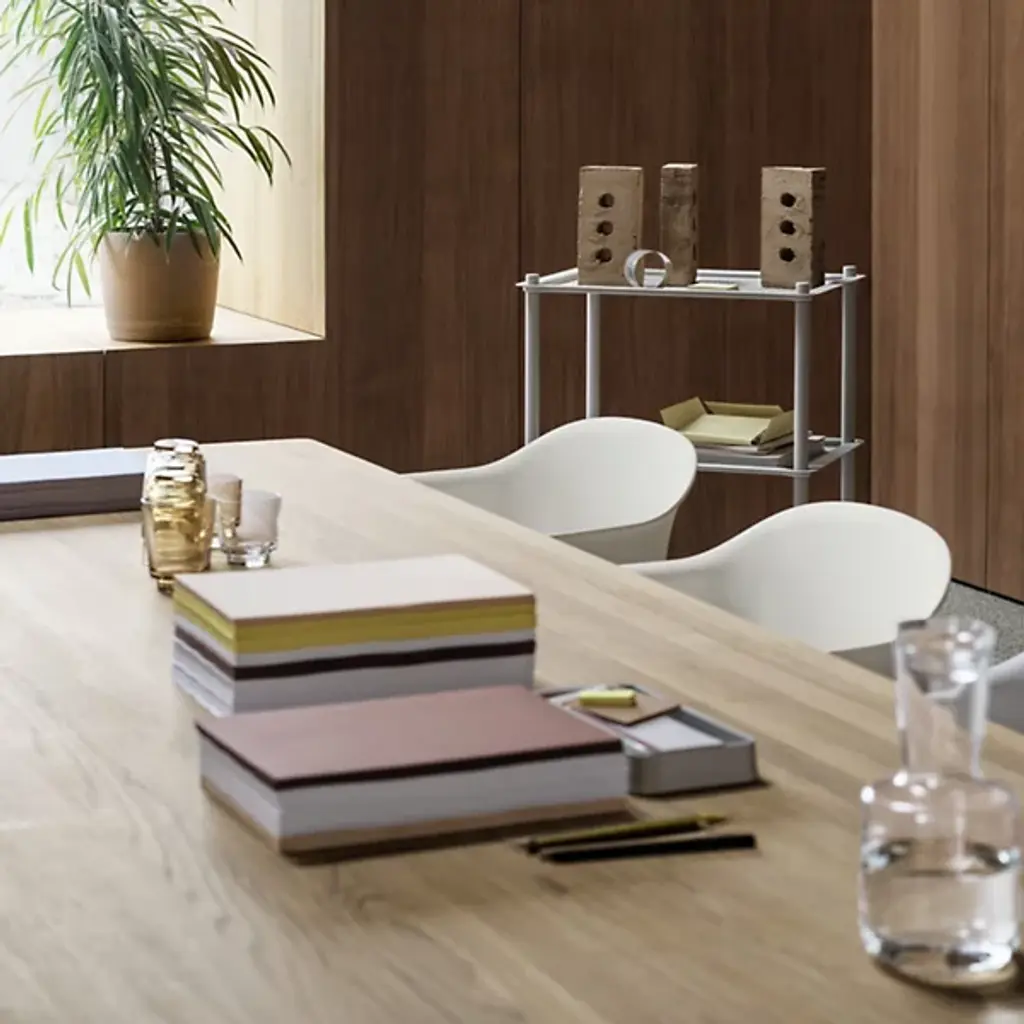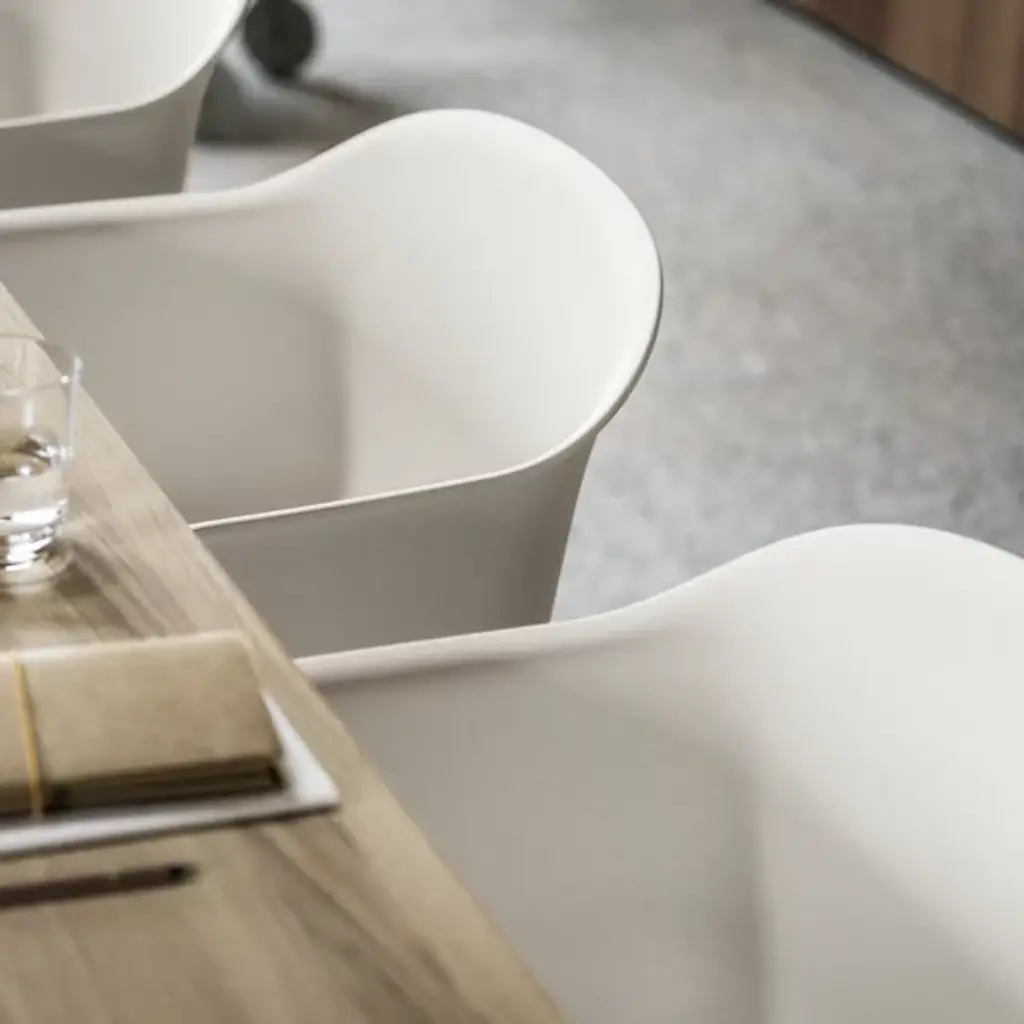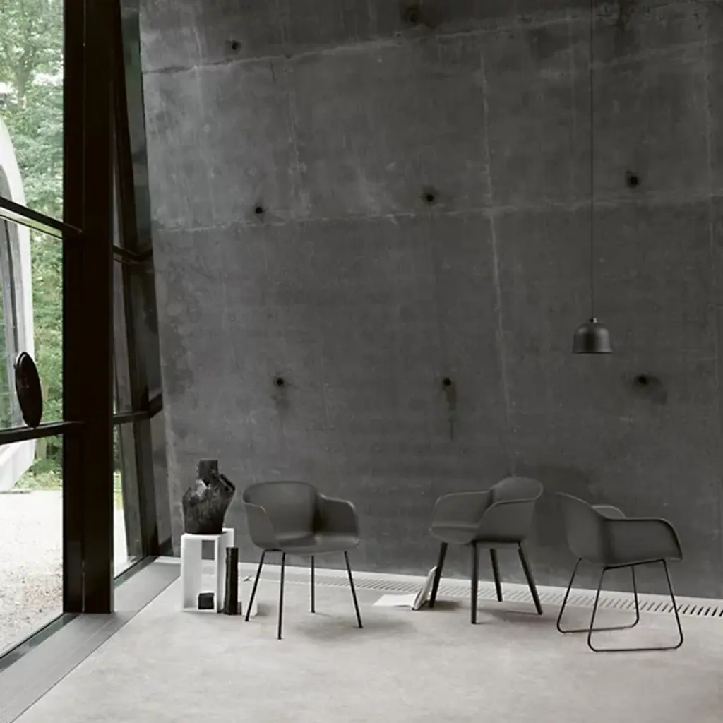 Rest and relax with a new spin on the traditional shell chair format with the Fiber Armchair with Sled Base from Muuto. Sleek and sustainable, it extends upward from a round-cornered sled-style steel base with small glides, which secures a novel one-piece shell seat assembled from a revolutionary composite of plastic and pine wood fiber. This bespoke blend is injection molded and offers an enveloping seat, a signature surface with a tactile touch that contrasts cleverly with its smooth support structures.