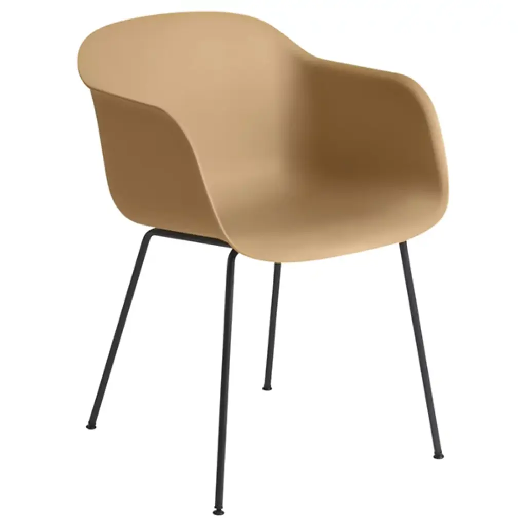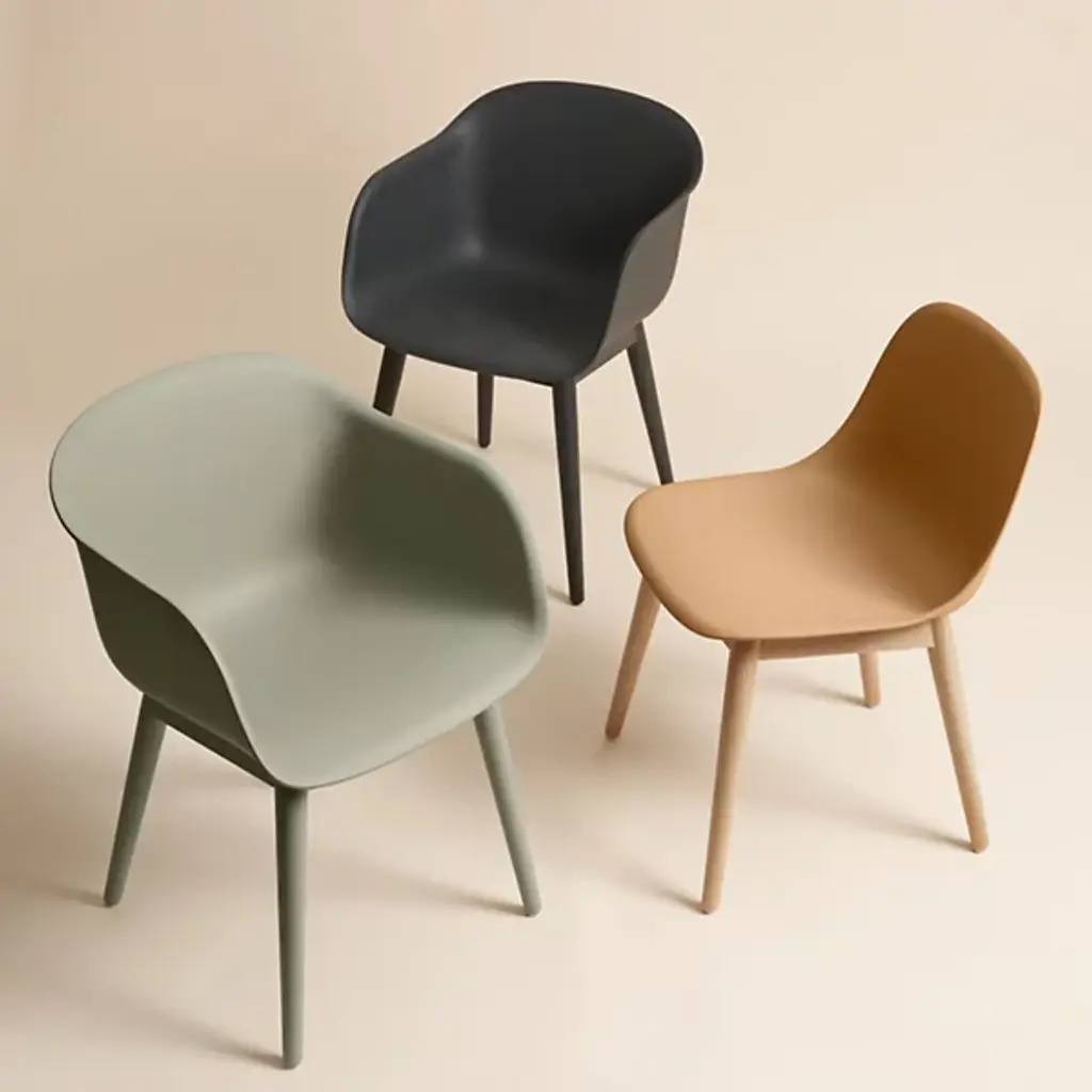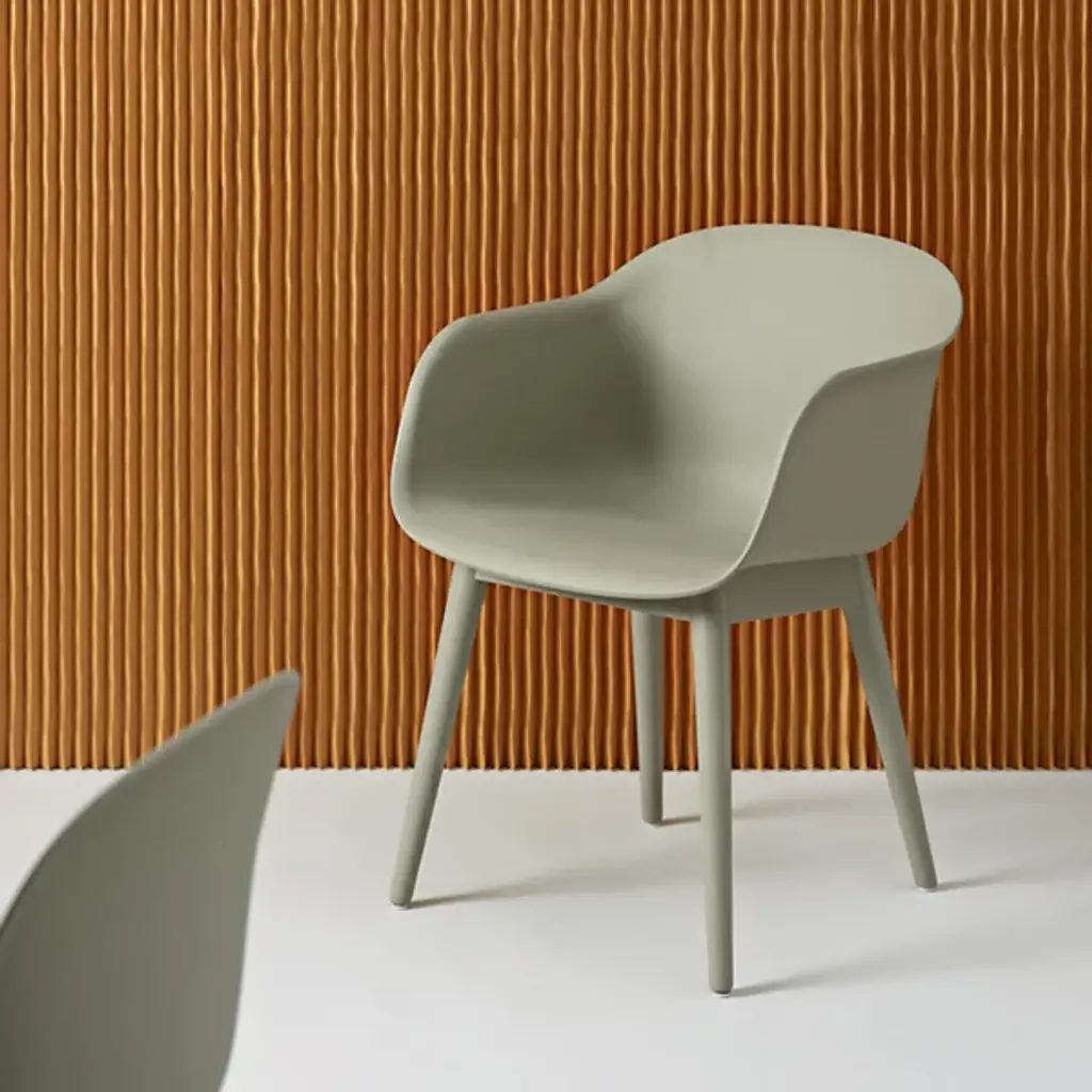 The Fiber Armchair Wood Base from Muuto enhances its surroundings with a thoughtful and appealing design. A mixture of Scandinavian subtlety and modern refinement, it starts with a wood base structure that joins smoothly telescoping round legs with robust plywood beams to create a sturdy foundation. A curving, single-piece shell seat of injection-molded recyclable plastic enhanced with up to 25% of wood fibers caps off the seat, expressing sustainable design principles with a tactile spirit that is both tactile and comfortable.