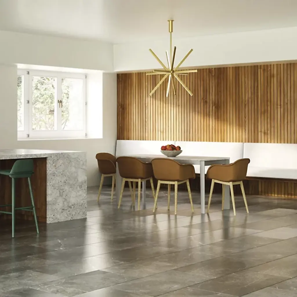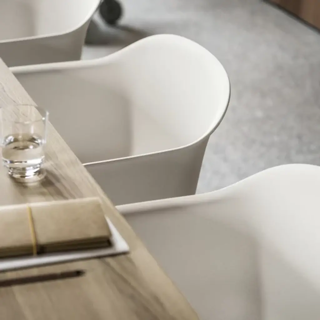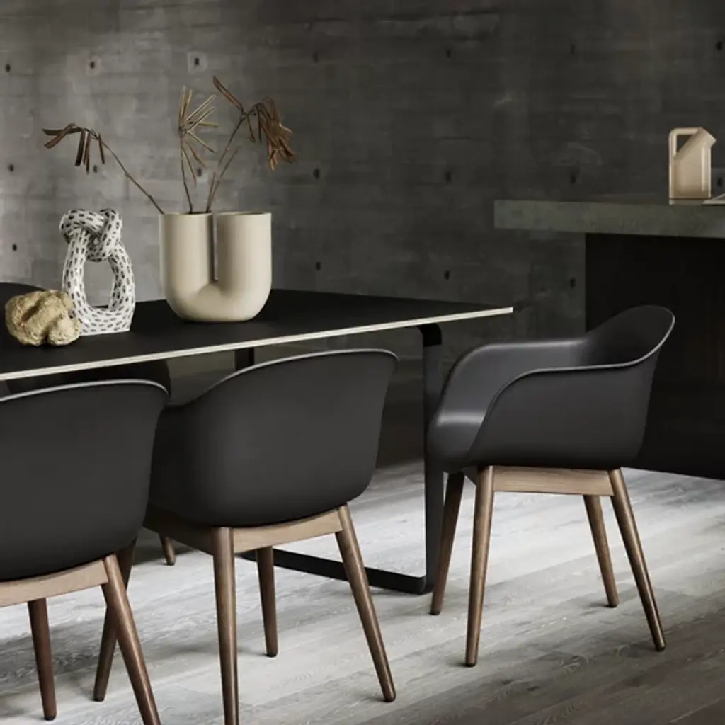 The Fiber Armchair Wood Base from Muuto enhances its surroundings with a thoughtful and appealing design. A mixture of Scandinavian subtlety and modern refinement, it starts with a wood base structure that joins smoothly telescoping round legs with robust plywood beams to create a sturdy foundation. A curving, single-piece shell seat of injection-molded recyclable plastic enhanced with up to 25% of wood fibers caps off the seat, expressing sustainable design principles with a tactile spirit that is both tactile and comfortable.