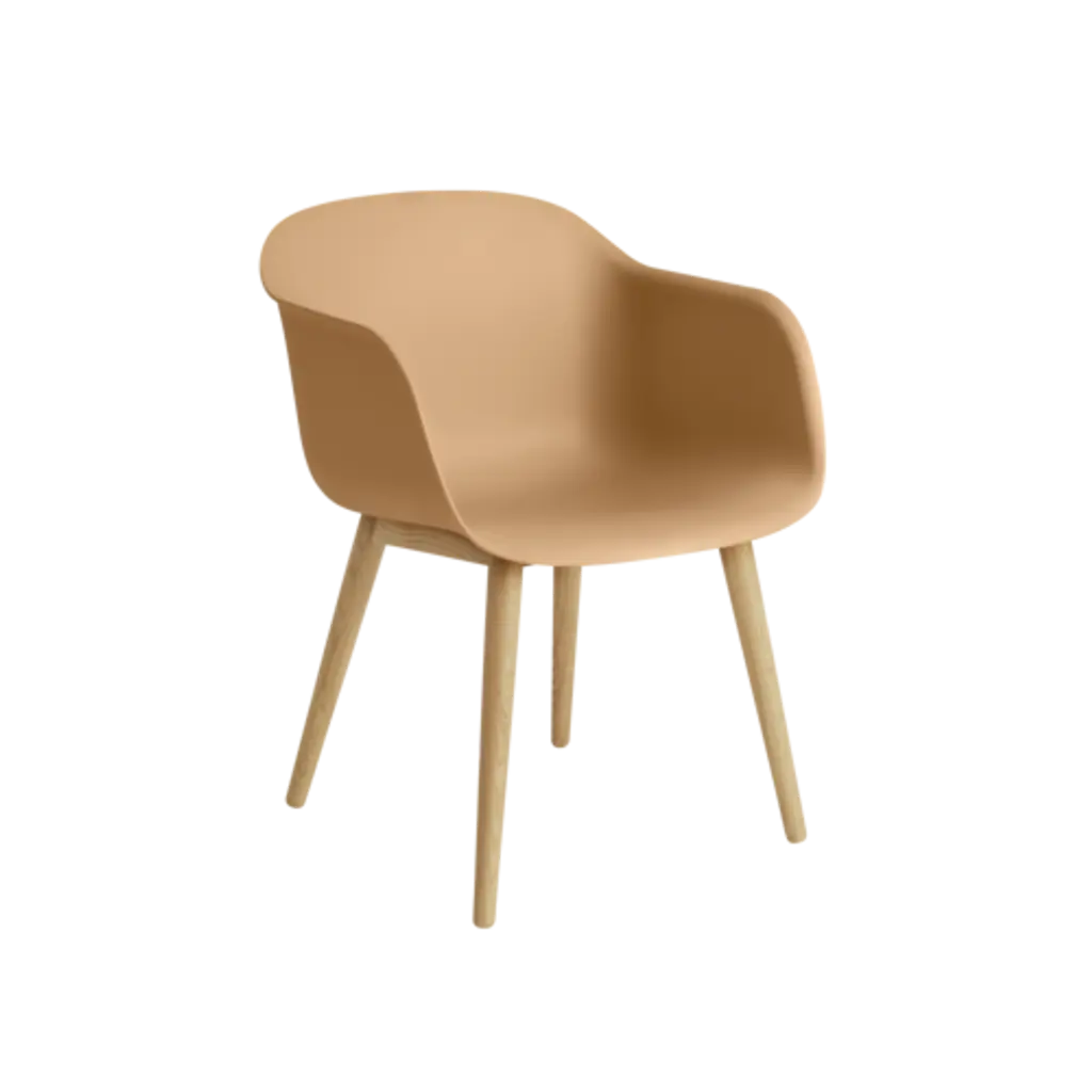 Muuto transforms an essential in its seating portfolio with an eco-friendly Fiber Armchair that also adds a custom upholstered interior and a wood base in water-base lacquered solid oak. With its signature curves, the composite shell is fashioned in an innovative composite of recycled plastic (min. 80% content) and FSC-certified wood fibers with an inviting matte finish.