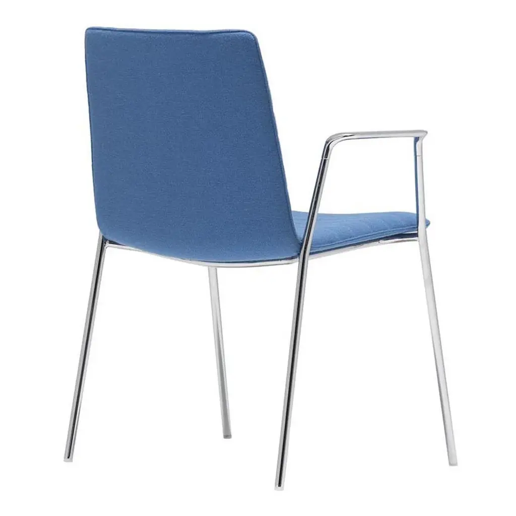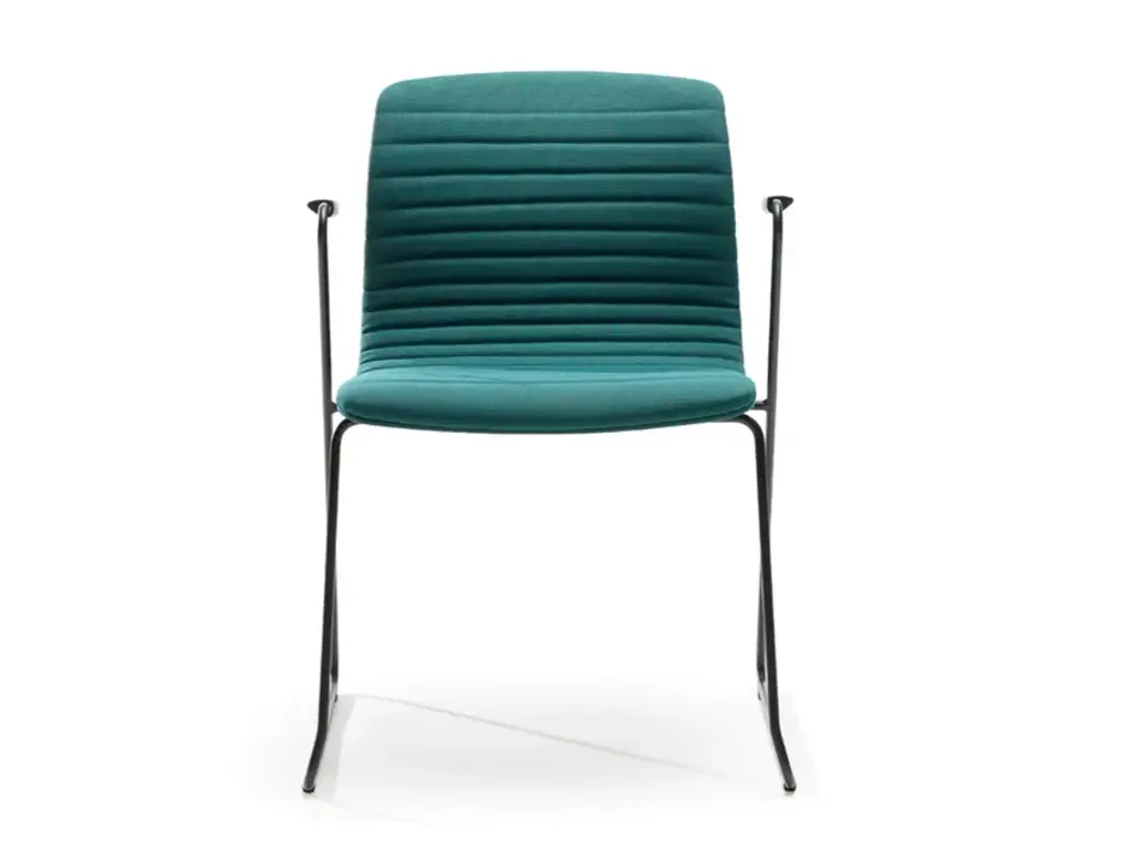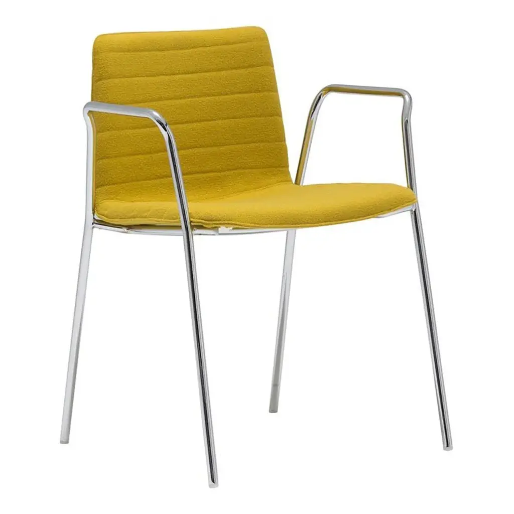 Stackable armchair with 4 tubular steel legs and finished in black or polished chrome. Fully upholstered seat and backrest. Optional Parallel upholstery. Also available: Upholstered arms option. Includes a stacking protector.The most luxurious piece in the Flex Collection, the Flex Corporate has a fully upholstered seat and backrest. The wider seat, higher backrest and thicker foam increase comfort and opulence.