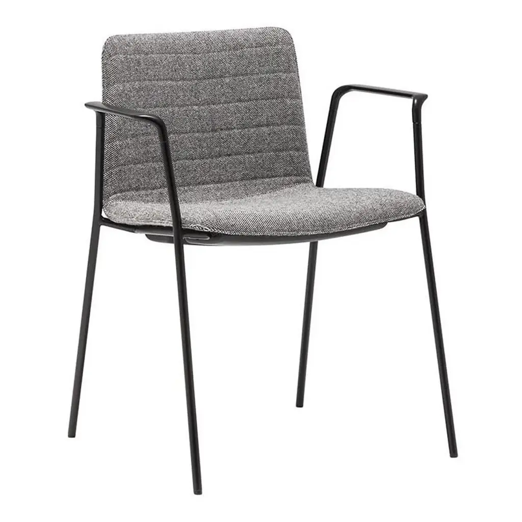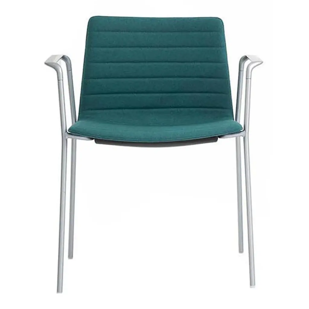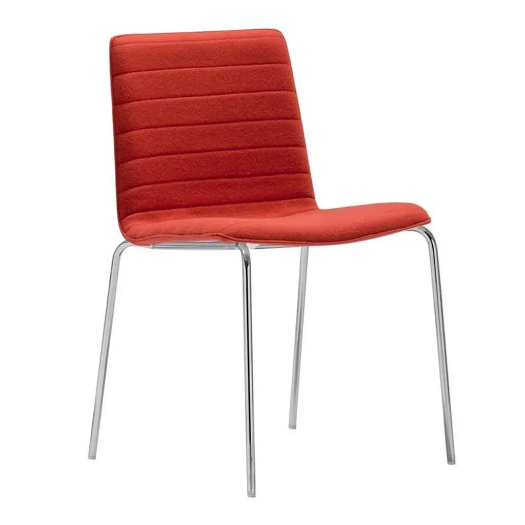 Stackable chair with 4 tubular steel legs available in polished chrome or other steel colors. Optional fully upholstered shell or parallel upholstery stitching. The upholstered version includes a stacking protector. Whether the application is an office or an auditorium, a chair must be durable, comfortable and attractive. The Flex Chair answers all of these prerequisites and is available with a wide range of accessories including writing tablets, ganging and numbering systems. The collection is composed of chairs, armchairs and stools with thermos-polymer or upholstered fiberglass reinforced shell.