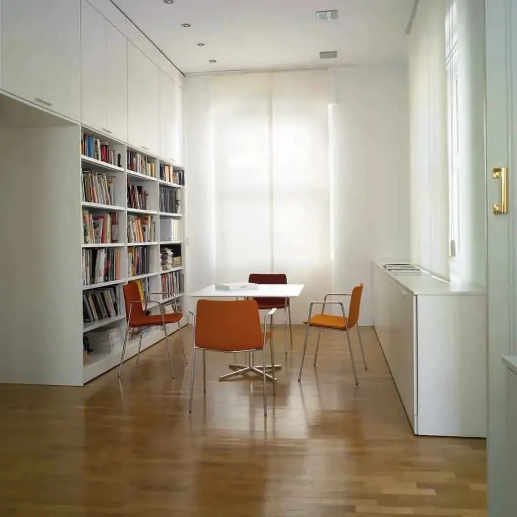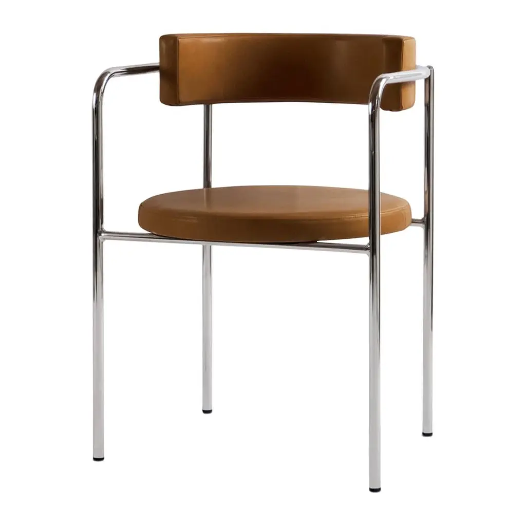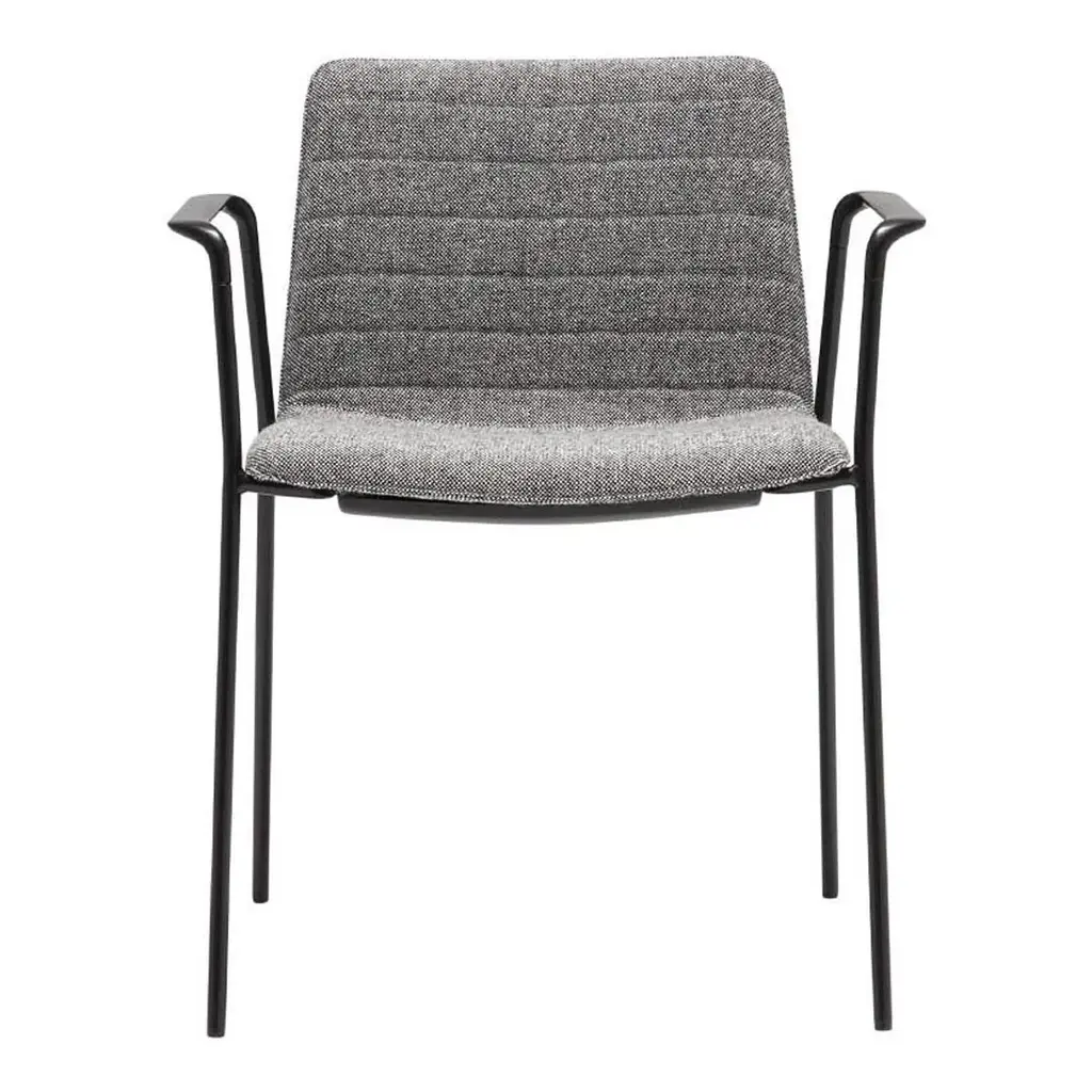 Stackable chair with 4 tubular steel legs available in polished chrome or other steel colors. Optional fully upholstered shell or parallel upholstery stitching. The upholstered version includes a stacking protector. Whether the application is an office or an auditorium, a chair must be durable, comfortable and attractive. The Flex Chair answers all of these prerequisites and is available with a wide range of accessories including writing tablets, ganging and numbering systems. The collection is composed of chairs, armchairs and stools with thermos-polymer or upholstered fiberglass reinforced shell.