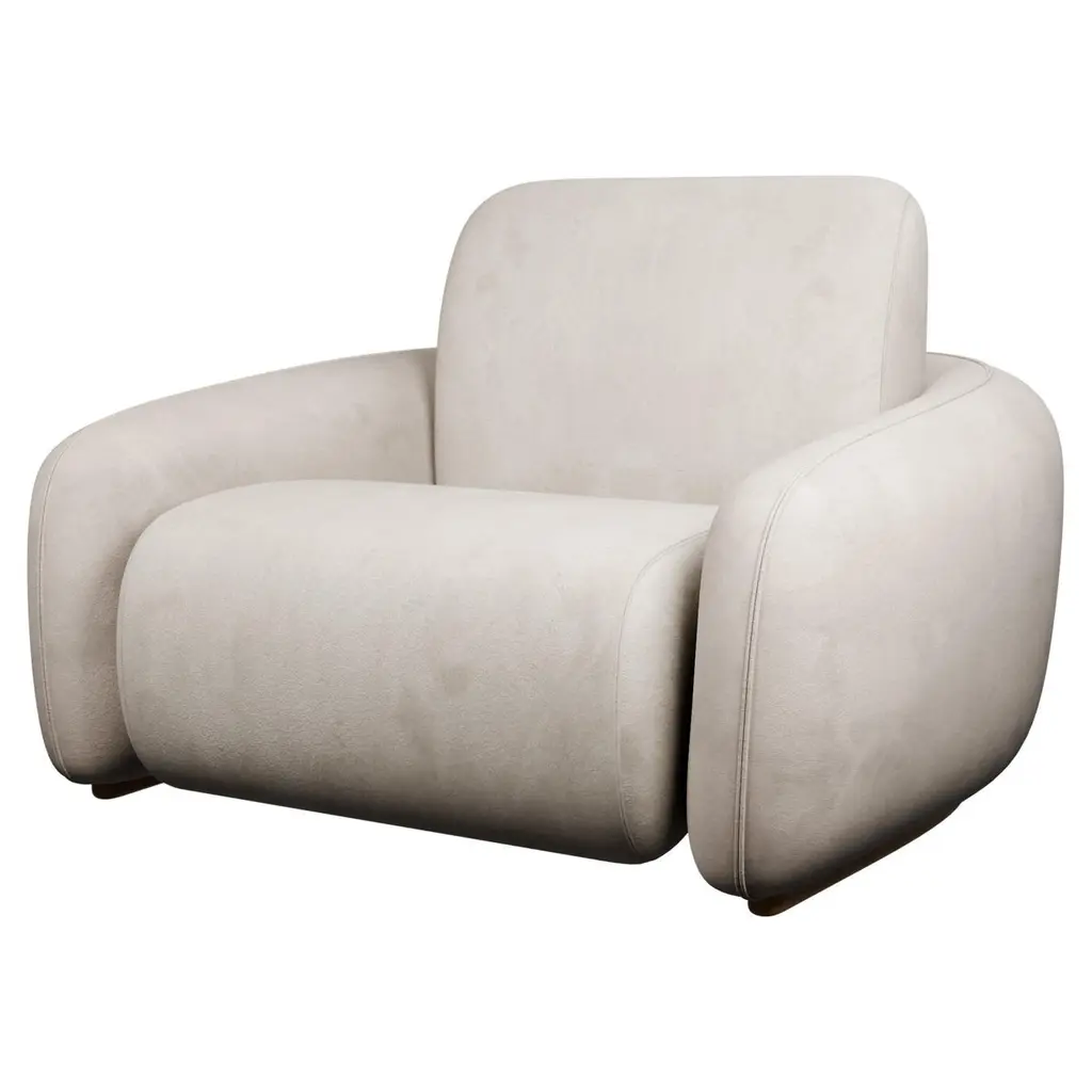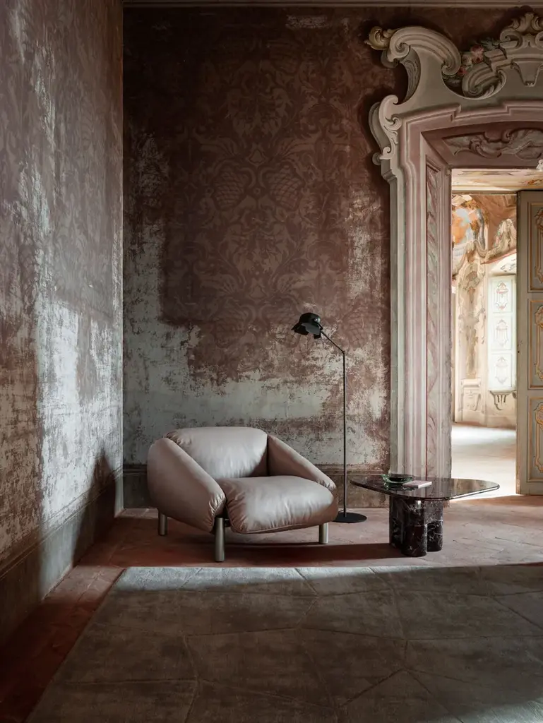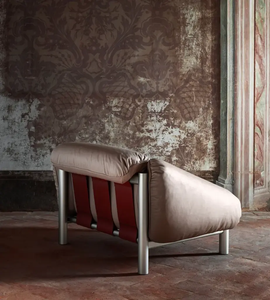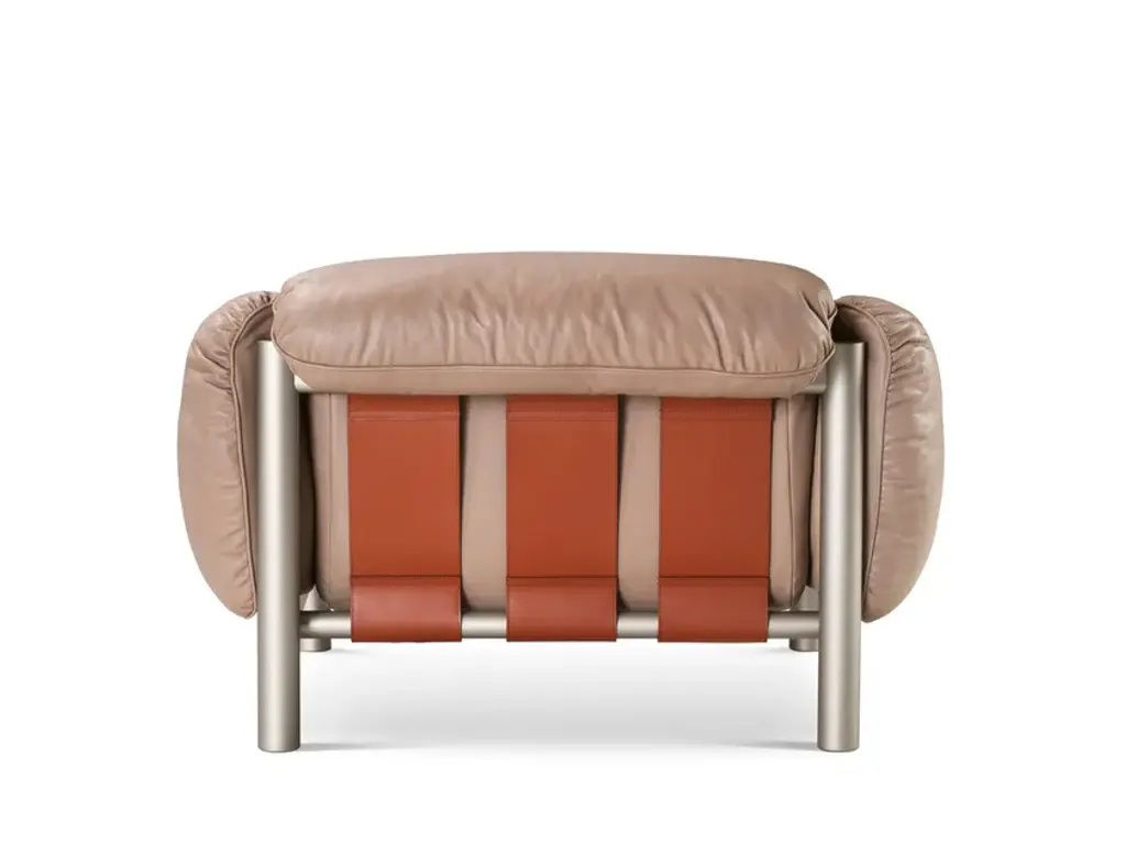 Flo is an armchair made by thick natural leather, padded with goose down, suggests a fusion of luxury, craftsmanship and design.The Flo series pays homage to mid-20th century Brazilian design, emphasizing high-quality materials and comfort such as the use of leather straps to support the seat and backrest.