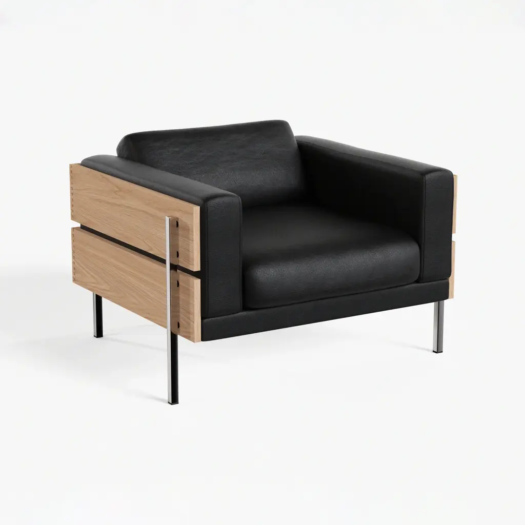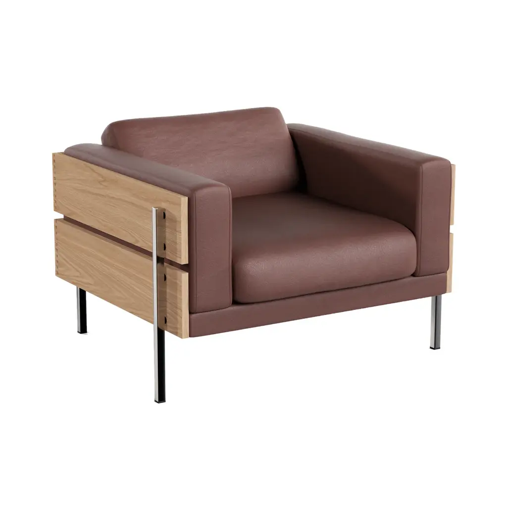 An icon of Midcentury design, Robin Day’s 1964 armchair features a visible frame in hardwood crafted with finger-joint detail and chrome-plated legs mounted to the outside. Reissued by Case from the original drawings, the attention to detail includes recreating the exact seat angle and full width-timber plank casing in solid walnut or oak with a metal-reinforced sub-structure for strength and longevity. Foam and Dacron-fill seat cushions offer upholstery in black or mocha leather or bouclé.