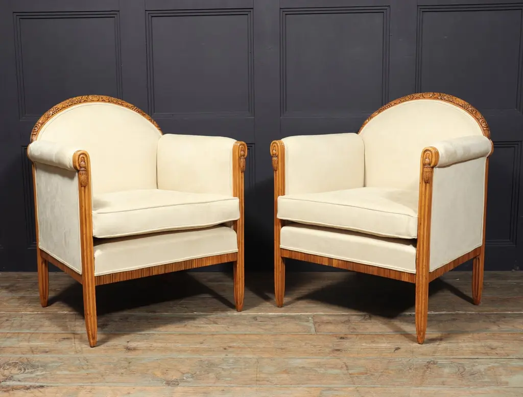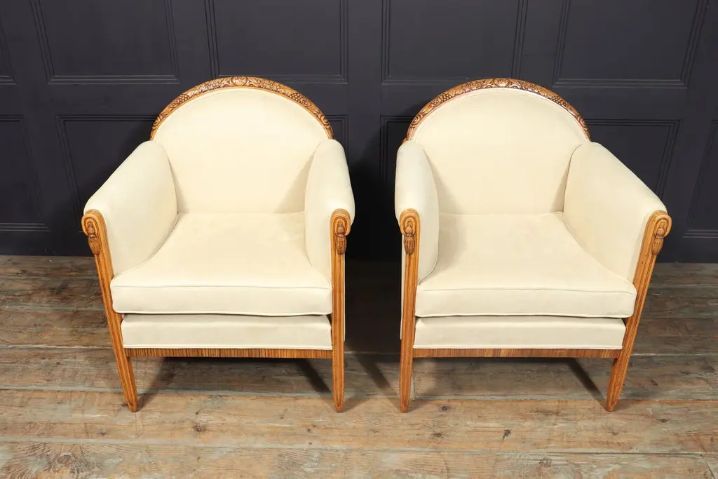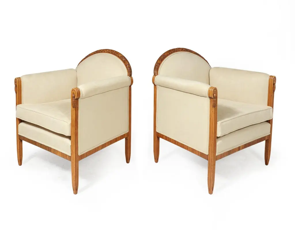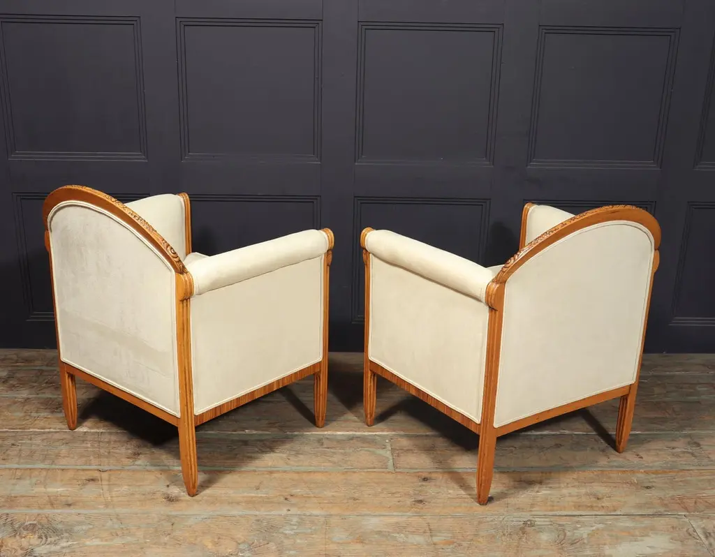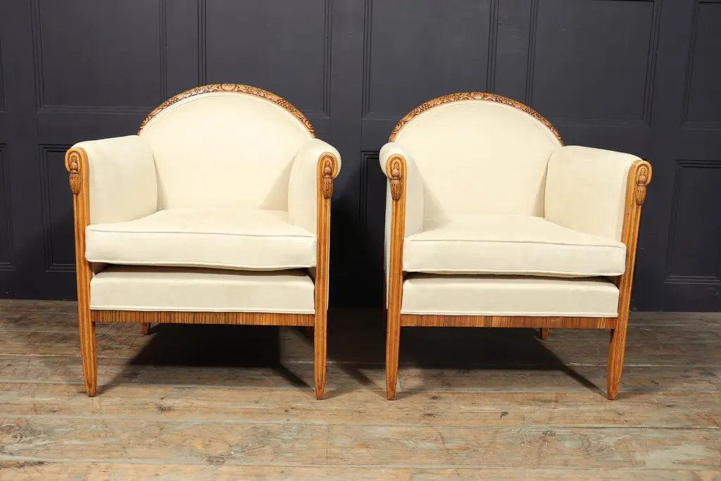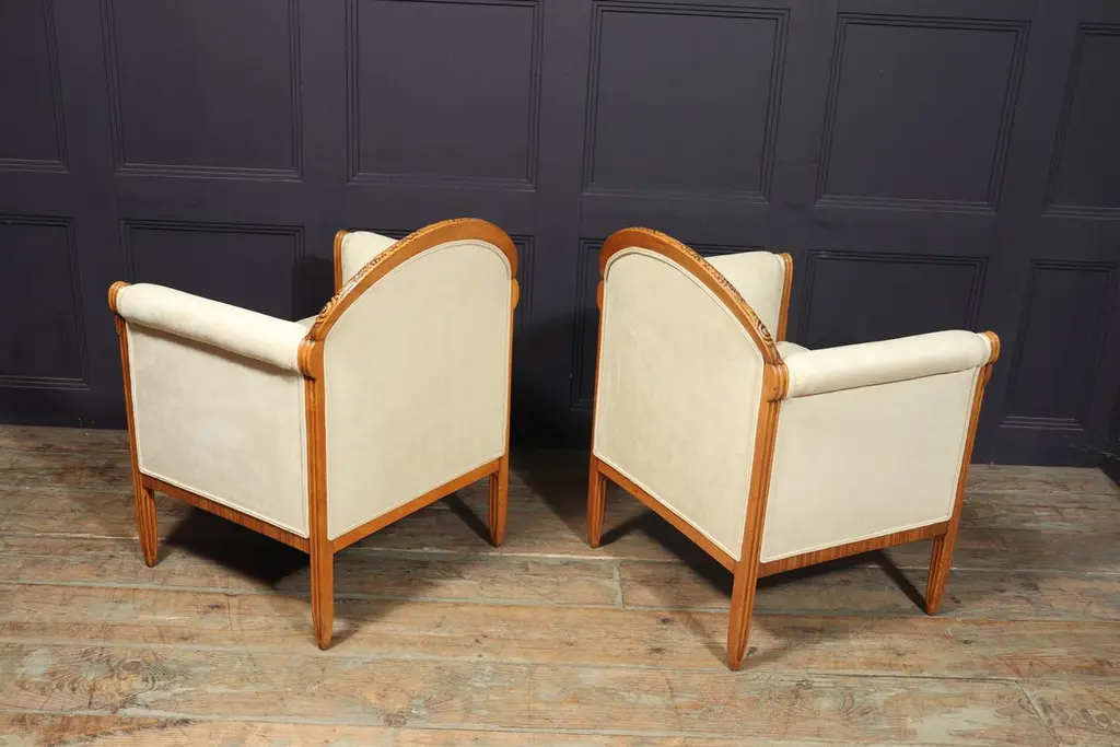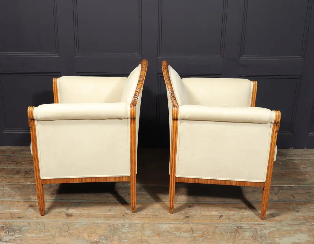 ARMCHAIRS BY PAUL FOLLOTA Pair of armchairs in beech with zebrano detail, crisply carved with a very classic French Art Deco form, designed and produced by one of the Masters of the Art Deco period, Paul Follot having a floral curved top edge and rolled arms with carved tassels and reeded legs that gently taper at the bottom, the chairs have been fully restored and fully upholstered and covered in high quality stain resistant Warwick Faux suede fabric The chairs are in the Art Deco museum in Russia that can be found hereArt Deco Museum Age: 1925Style: French Art DecoOrigin : FranceMaterial: Beech and ZebranoCondition: excellentRestoration: Fully polished and upholsteredDimensions: 84h x 68w x 65d cm