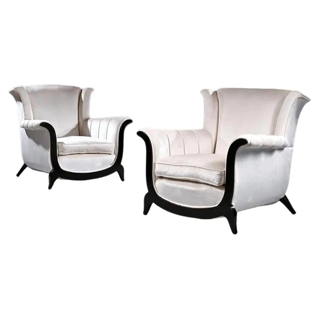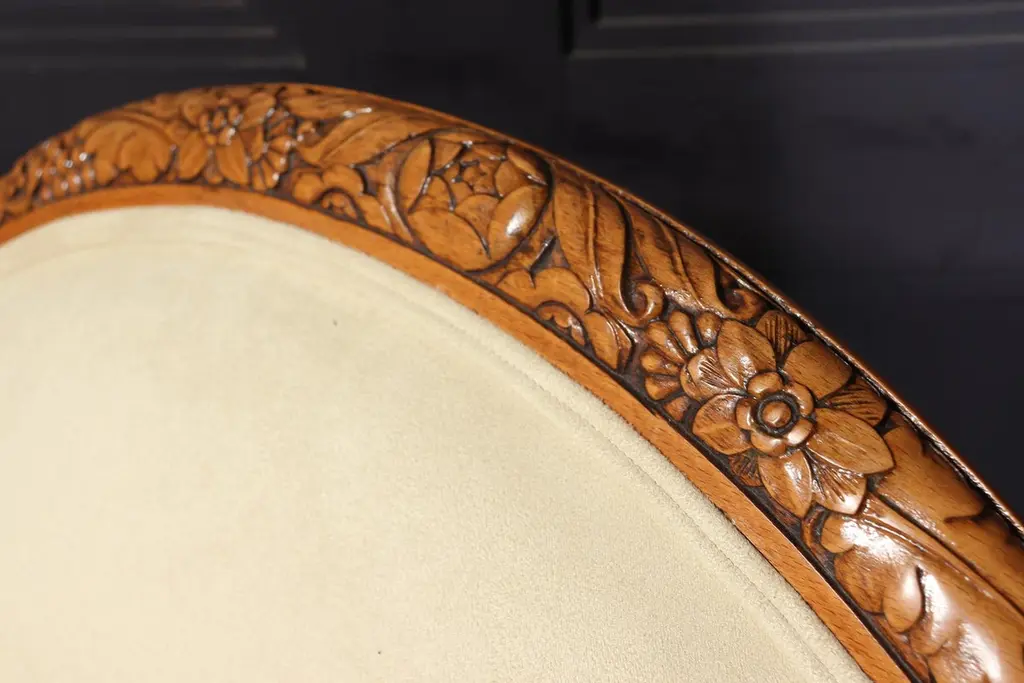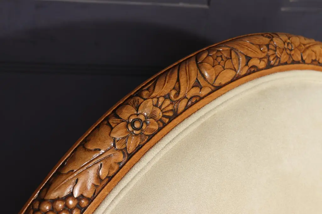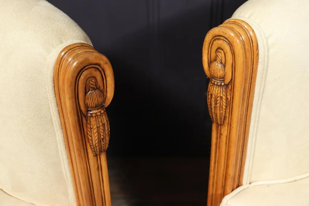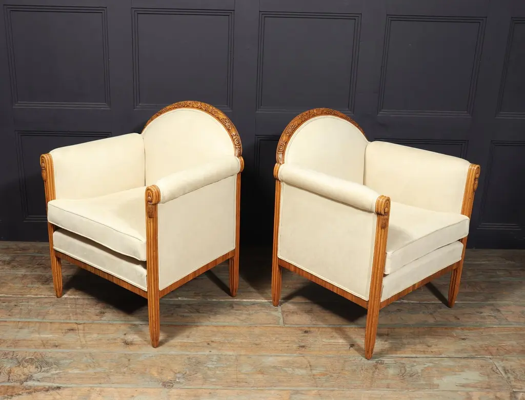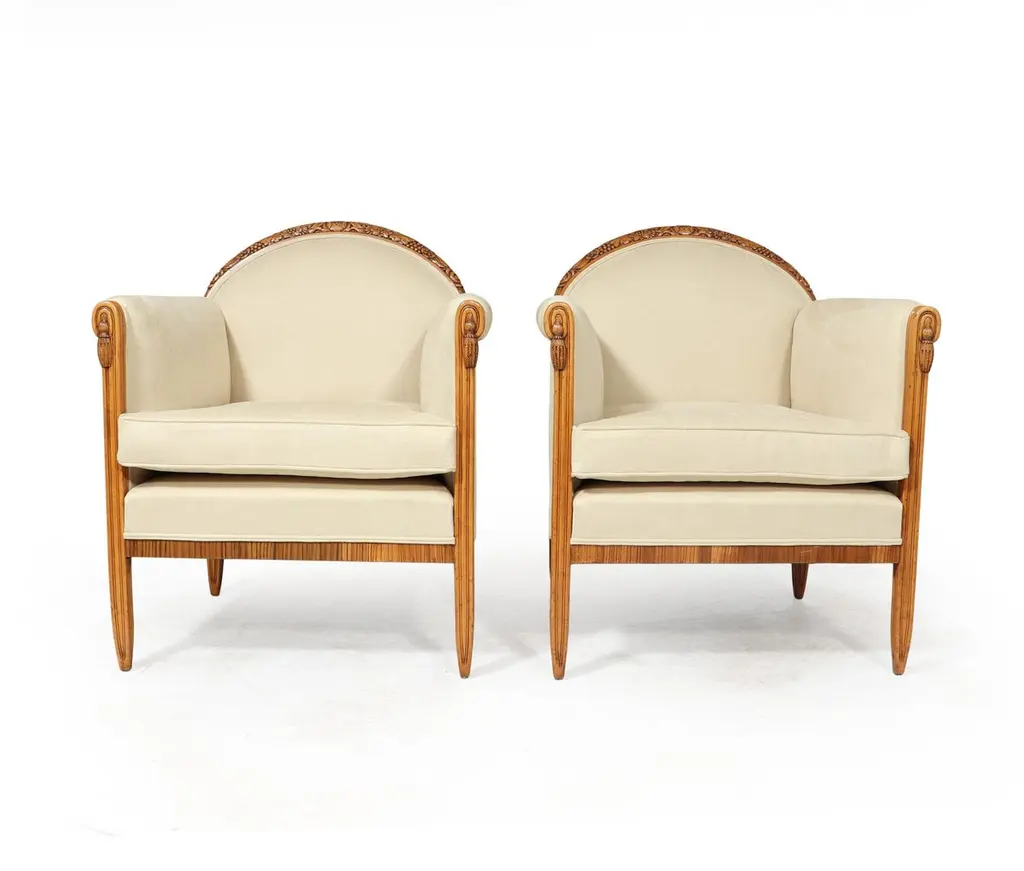 ARMCHAIRS BY PAUL FOLLOTA Pair of armchairs in beech with zebrano detail, crisply carved with a very classic French Art Deco form, designed and produced by one of the Masters of the Art Deco period, Paul Follot having a floral curved top edge and rolled arms with carved tassels and reeded legs that gently taper at the bottom, the chairs have been fully restored and fully upholstered and covered in high quality stain resistant Warwick Faux suede fabric The chairs are in the Art Deco museum in Russia that can be found hereArt Deco Museum Age: 1925Style: French Art DecoOrigin : FranceMaterial: Beech and ZebranoCondition: excellentRestoration: Fully polished and upholsteredDimensions: 84h x 68w x 65d cm