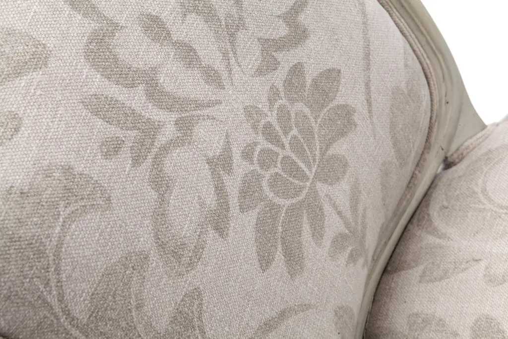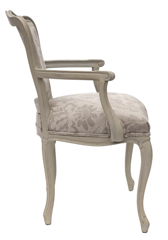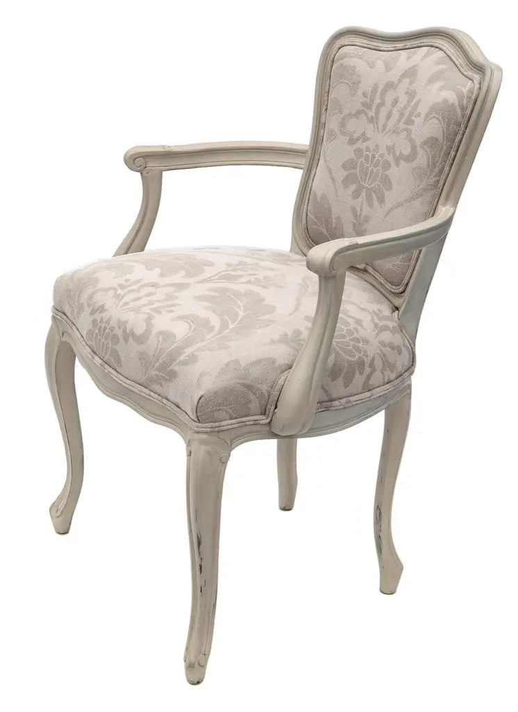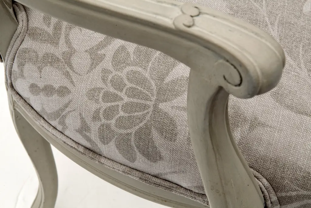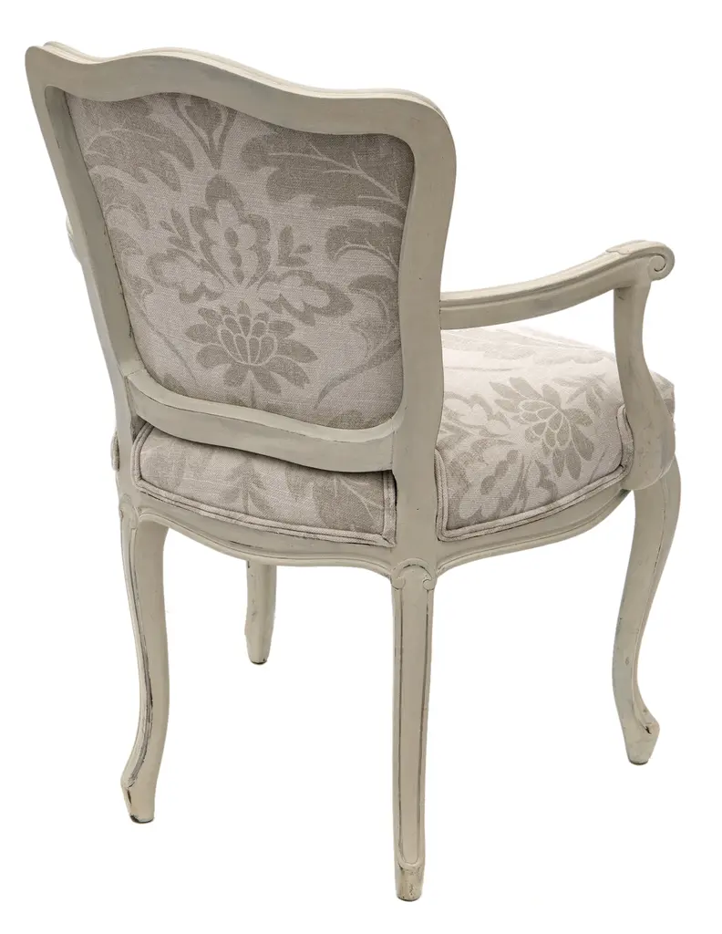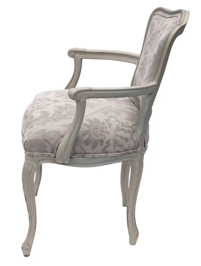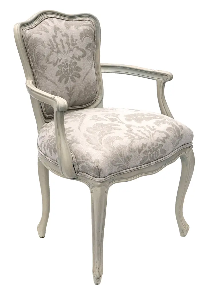 This stunning chair features elegant curves hand painted in shades of gray. It has been reupholstered in a linen "damask" by Romo on the seat & back. This chair is incredibly comfortable chair with a gorgeous silhouette. Condition is excellent, the chair is very tight & very sturdy.