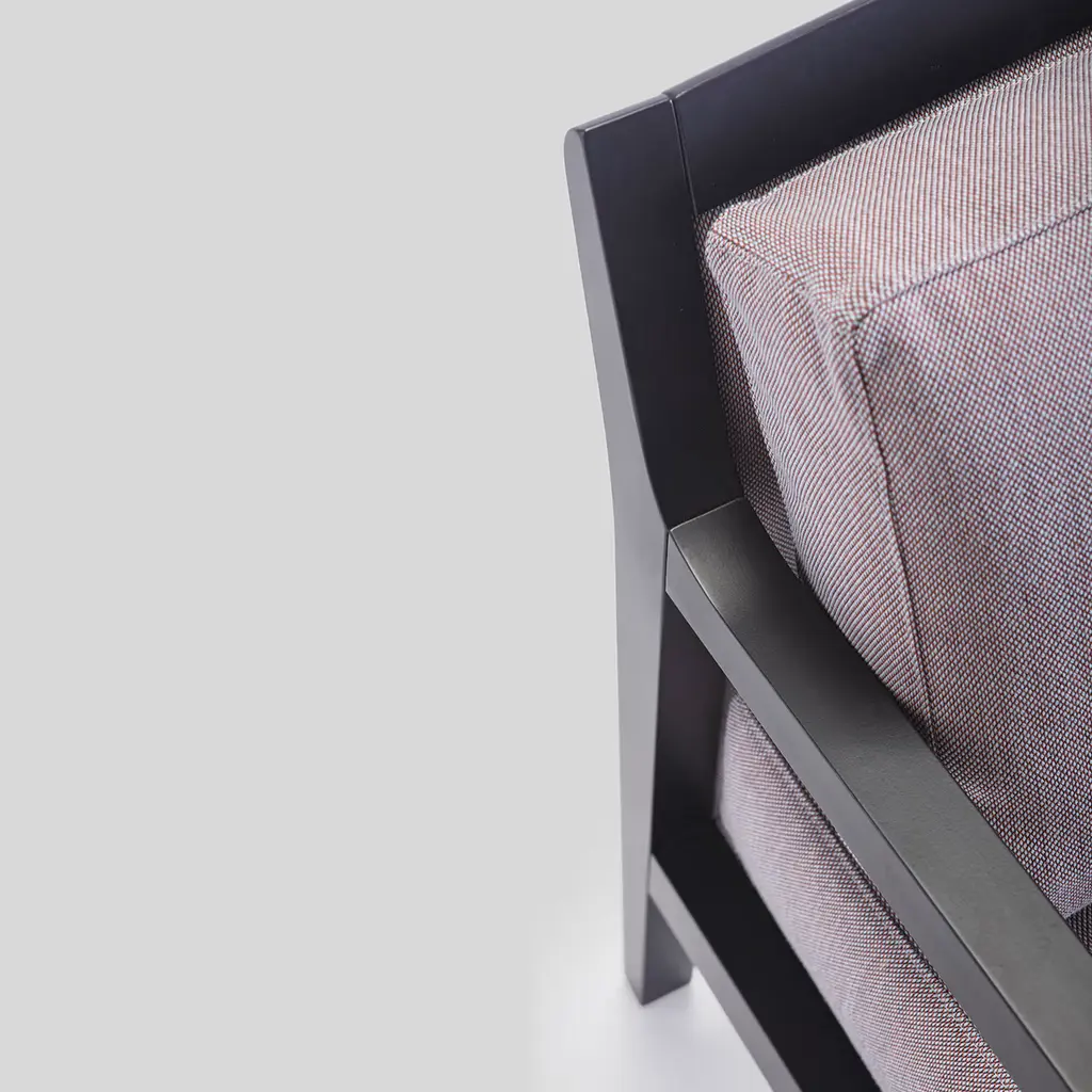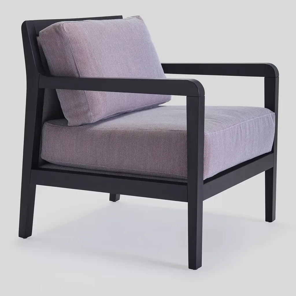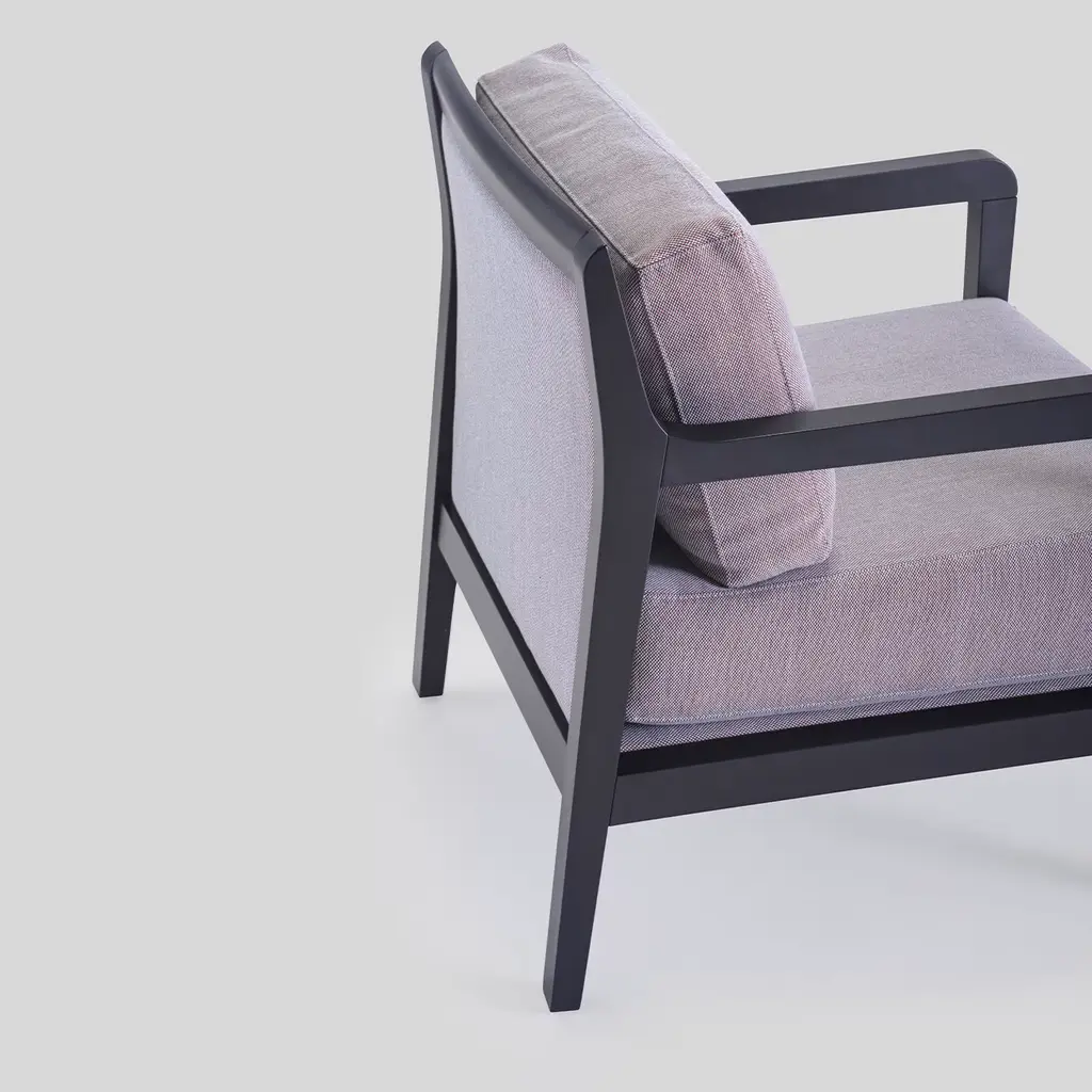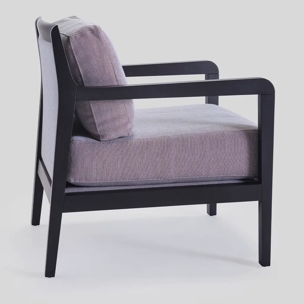 A clean and essential design of modern sophistication, this lounge armchair will exquisitely complement both public or private decors. Resting on a polished, black-lacquered beechwood structure with a low profile, it features a softly padded, welcoming seat and backrest, both upholstered in a fine lilac fabric. Also available in leather or other fabrics, please ask the Concierge for customization options.