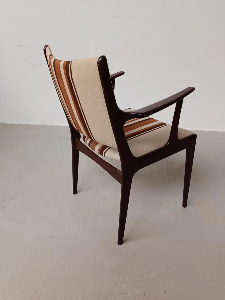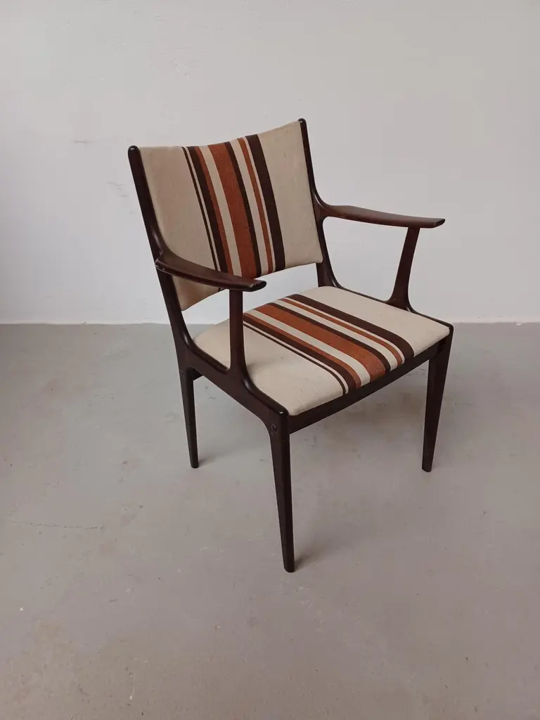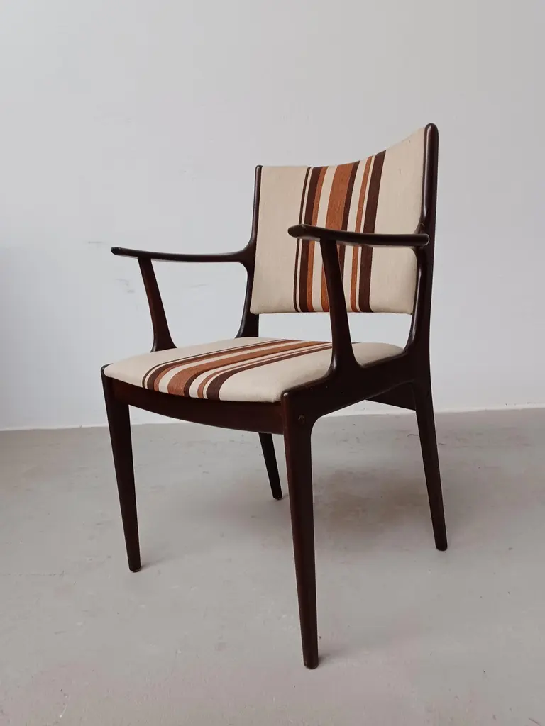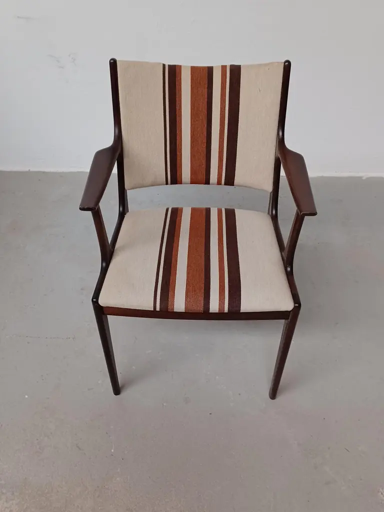 Fully restored Johannes Andersen mahogany armchairs custom reupholstery includedThe armchairs feature a clean simple yet elegant design that will fit in well in most houses. The chairs have been fully restored and refinished by our cabinetmaker to insure that they are in very good condition with only minimal signs of age and use and will be reupholstered without additional cost fabric of your choice from a wide selection of "Kvadrat" or "Romo" fabrics.