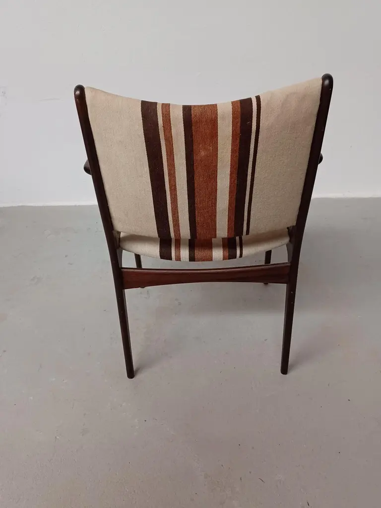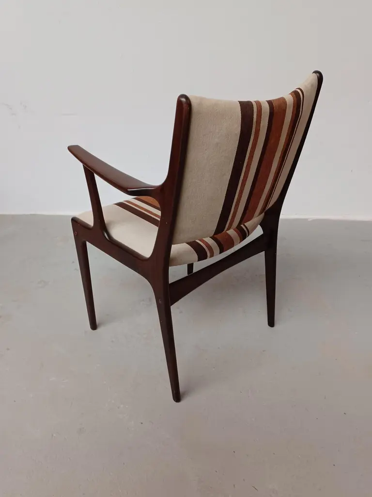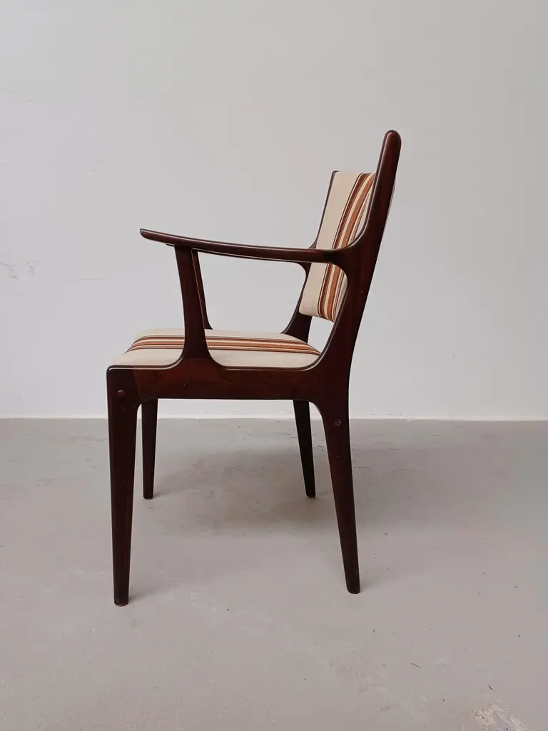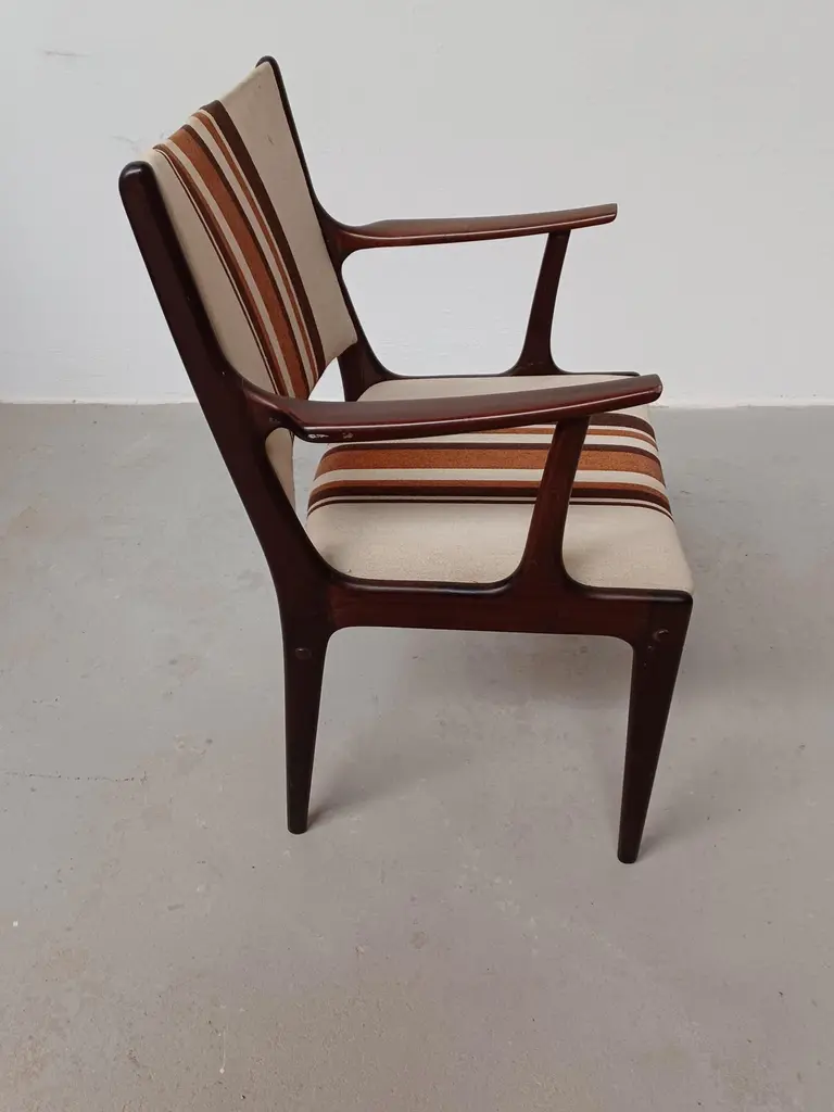 Fully restored Johannes Andersen mahogany armchairs custom reupholstery includedThe armchairs feature a clean simple yet elegant design that will fit in well in most houses. The chairs have been fully restored and refinished by our cabinetmaker to insure that they are in very good condition with only minimal signs of age and use and will be reupholstered without additional cost fabric of your choice from a wide selection of "Kvadrat" or "Romo" fabrics.