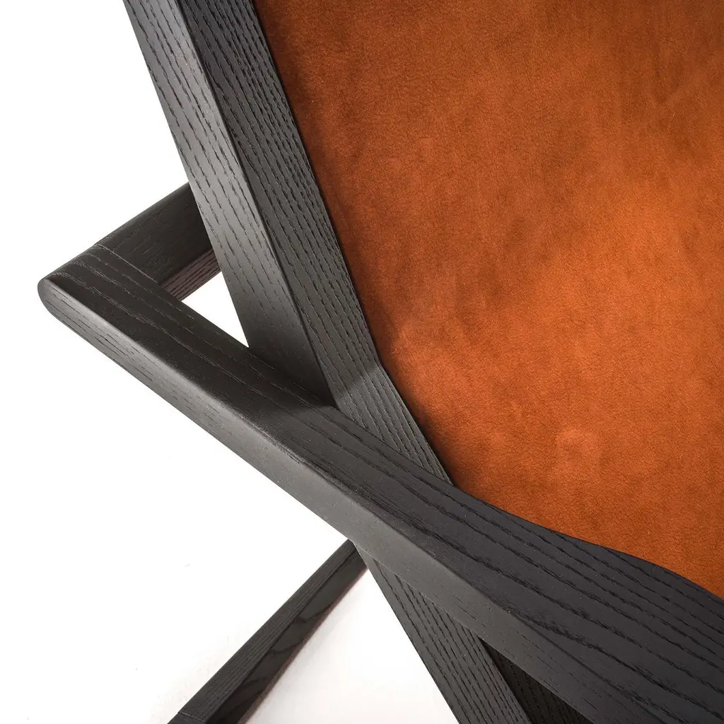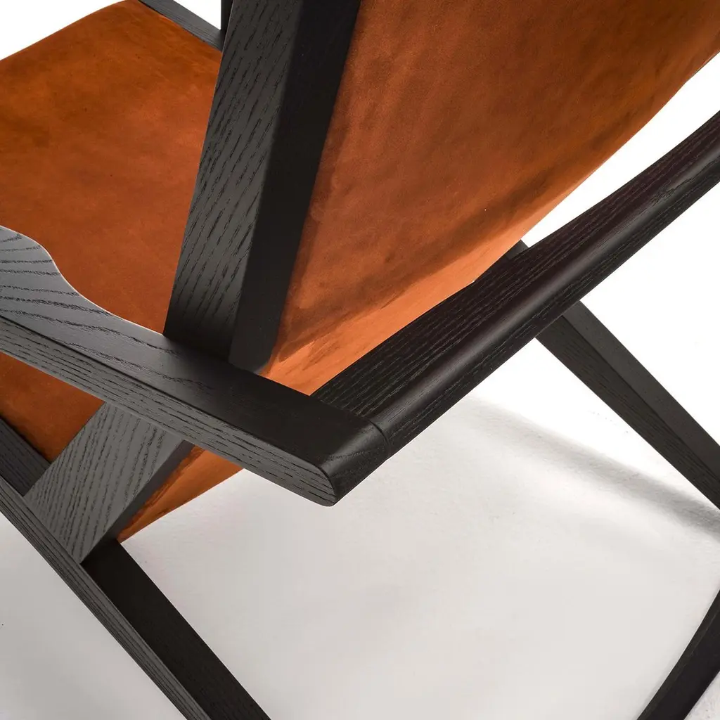 The Gazzella armchair is designed in straight lines and soft curves that create a timeless chair, capable of adapting to various settings. With an iconic solid wood structure in two distinct parts, it is complimented by a comfortable padded seat upholstered in orange leather. Canaletto walnut and polished ash are used alternately for the various types of upholstery.