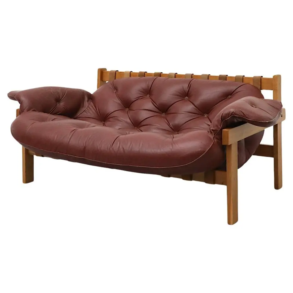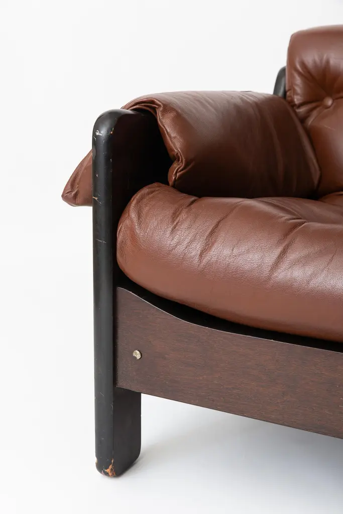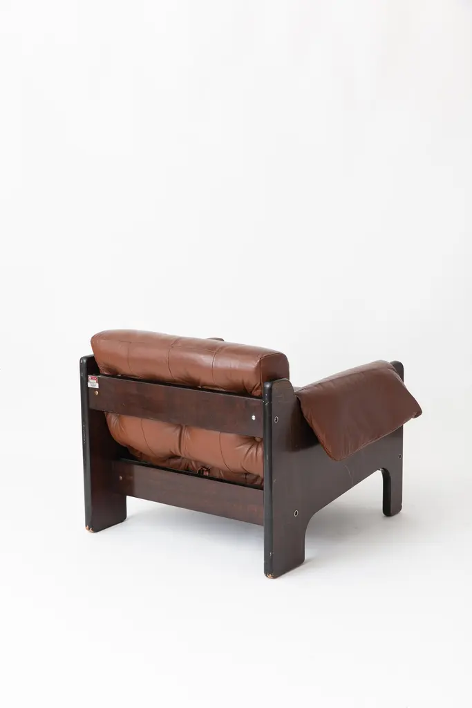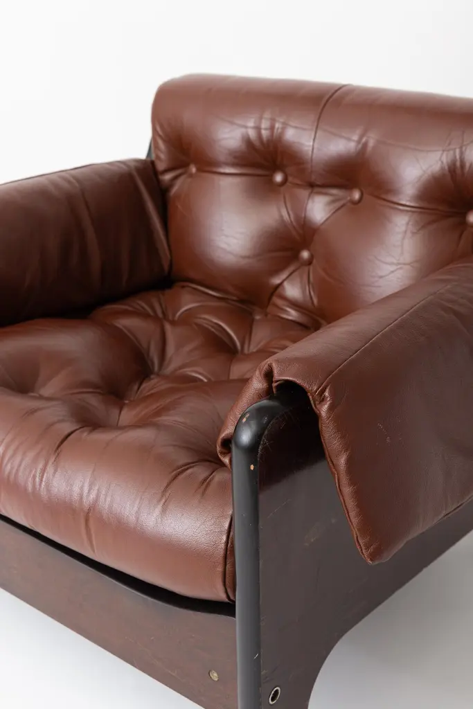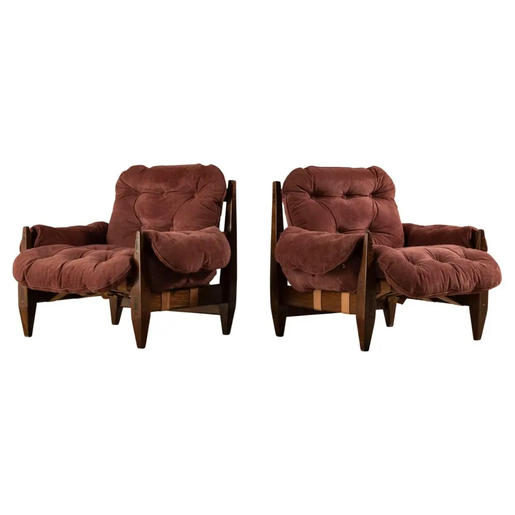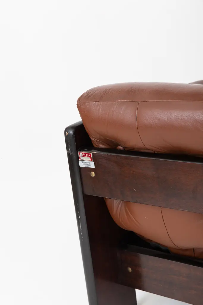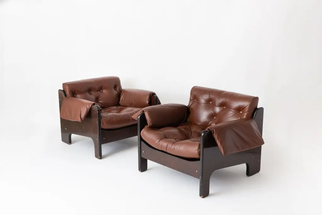 Pair of very rare leather armchairs designed by very important Brazilian Modernist figure Geraldo De Barros who was an artist and furniture designer. Cushions with this more "free" style are very reminiscent of Sergio Rodrigues's iconic Mole chair However when incorporated with Geraldo De Barro's more utilitarian base, create a beautiful contrast. The original soft leather is a deep rich brown and expertly constructed with plenty of character. These chairs are not only a beautiful statement piece, but are also extremely comfortable. We have not seen another in this style available anywhere. They contain the original inventory tags from the organization that first acquired them. In original vintage condition, but can be restored with the customer's request at no extra charge.