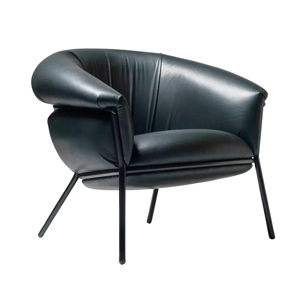 The Grasso Armchair makes a bold visual statement with its design, emphasizing an abundance of comfort. The upholstery appears to overflow the tubular steel frame, giving the impression that the material is almost too generous for its structure and is being squeezed. The frame is available in red, black, blue, or dark grey, and the upholstery options extend to both leather and fabric. A playful addition to private homes and commercial spaces, the Grasso also comes with an optional matching footstool to elevate the lounging experience.