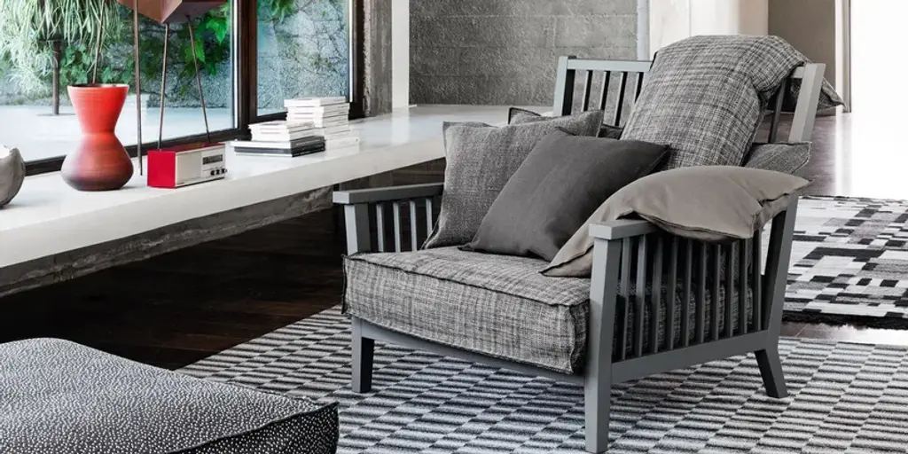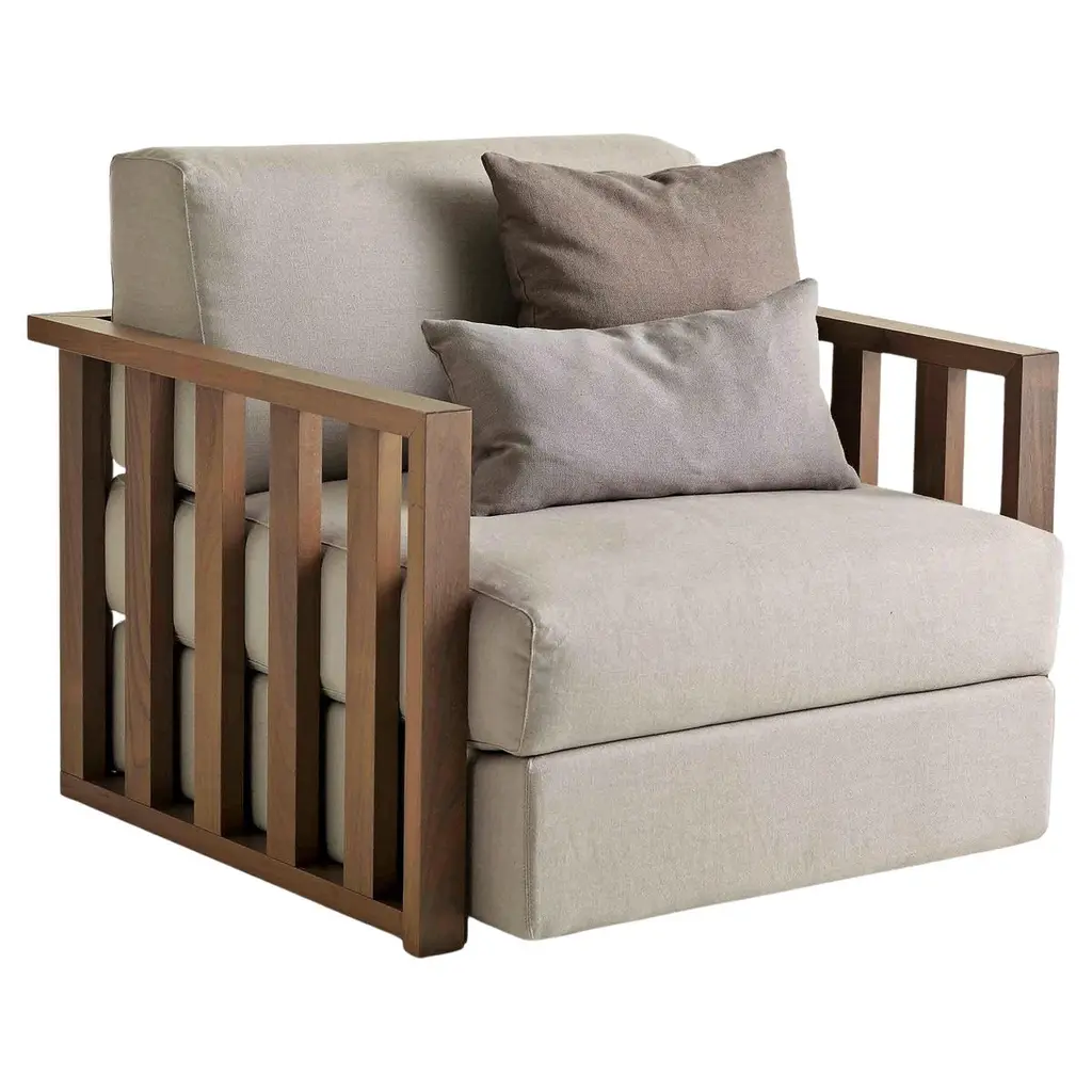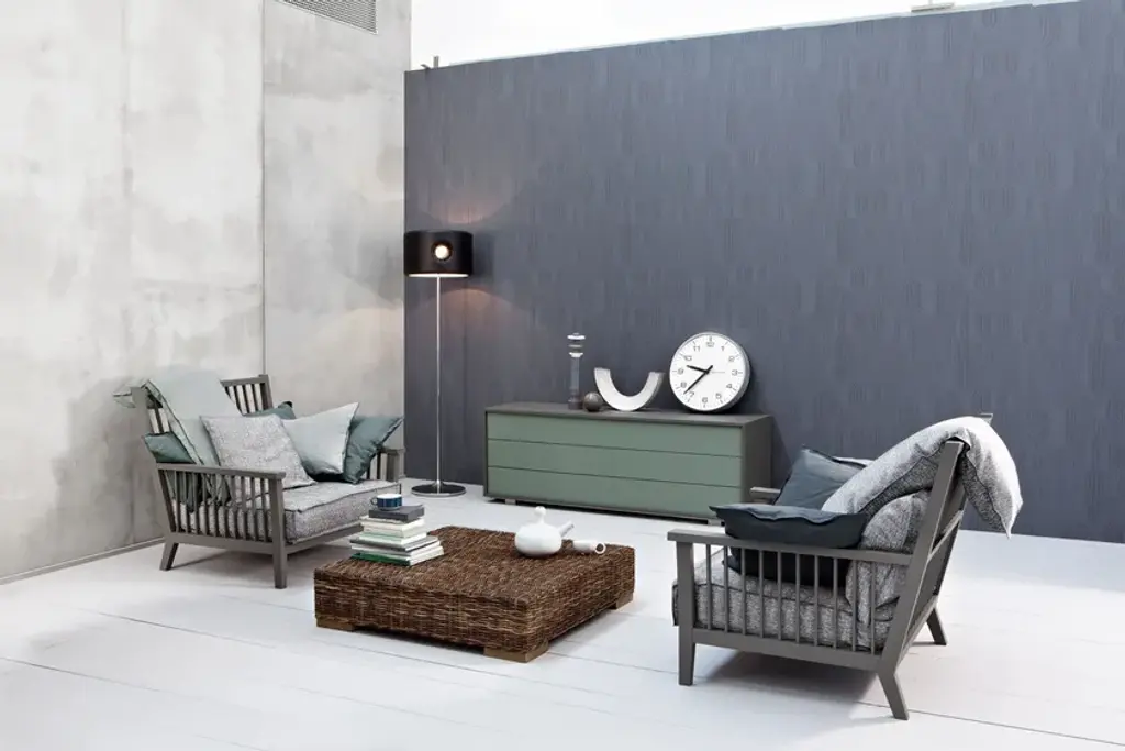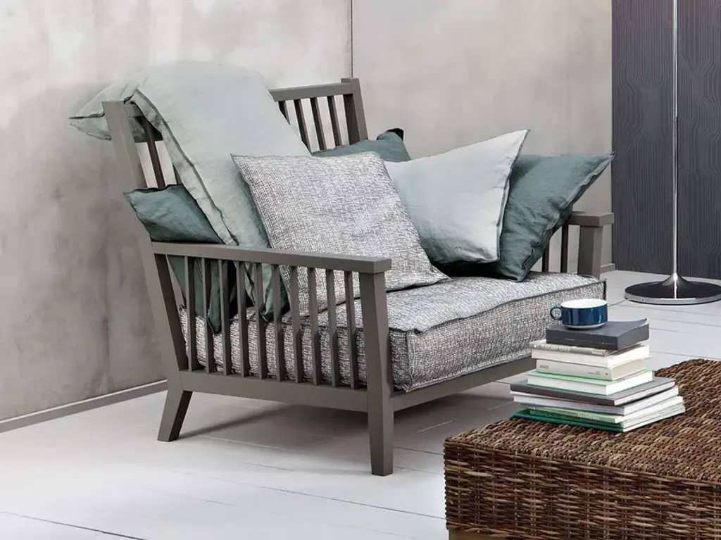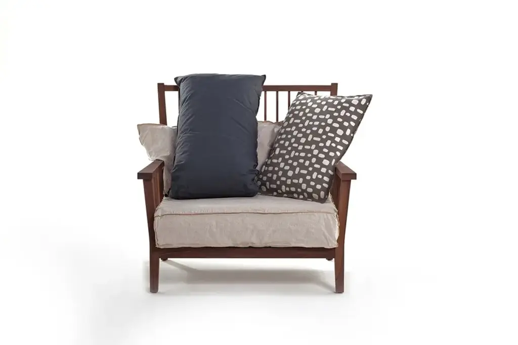 Lounge armchair with wooden structure, Gray 01 is characterised by straight, essential lines. The contrast between the solidity of the wide listels and the softness of the loose cushions gives the product a pleasant visual balance. The structure is made of natural painted Canaletto walnut, bleached oak or white, grey, black, ocean or dove-grey lacquered oak, Blueberry, Date, Ginger.Vintage soul and contemporary design characterise Gray, an articulated collection of chairs, armchairs, sofas, tables and coffee tables that mixes the austere elegance of classic furnishings with the simplicity of Nordic forms. A collection in solid walnut or oak embellished with workmanship, shapes and unusual materials, such as stone, porcelain, aluminium and marble.