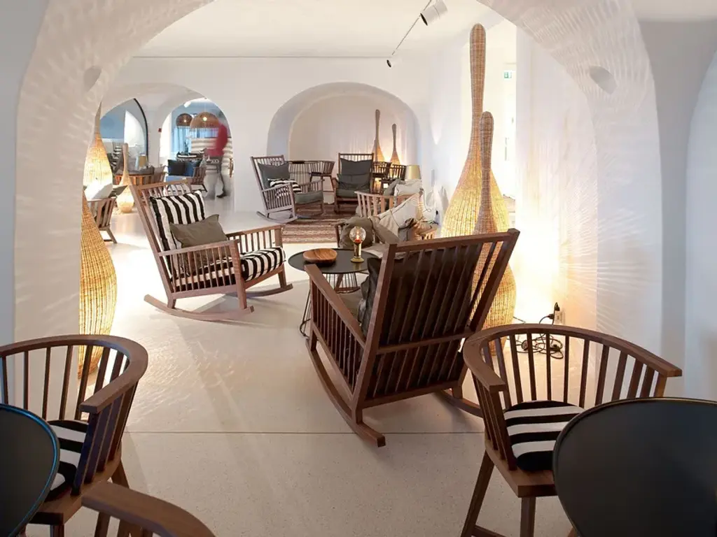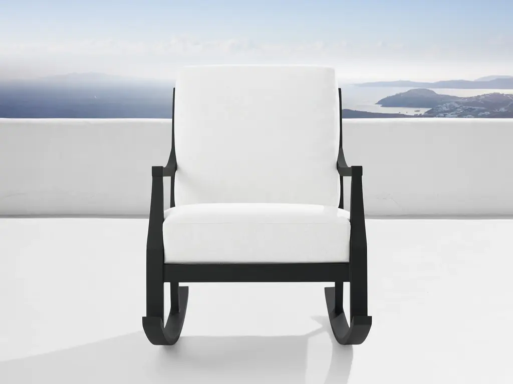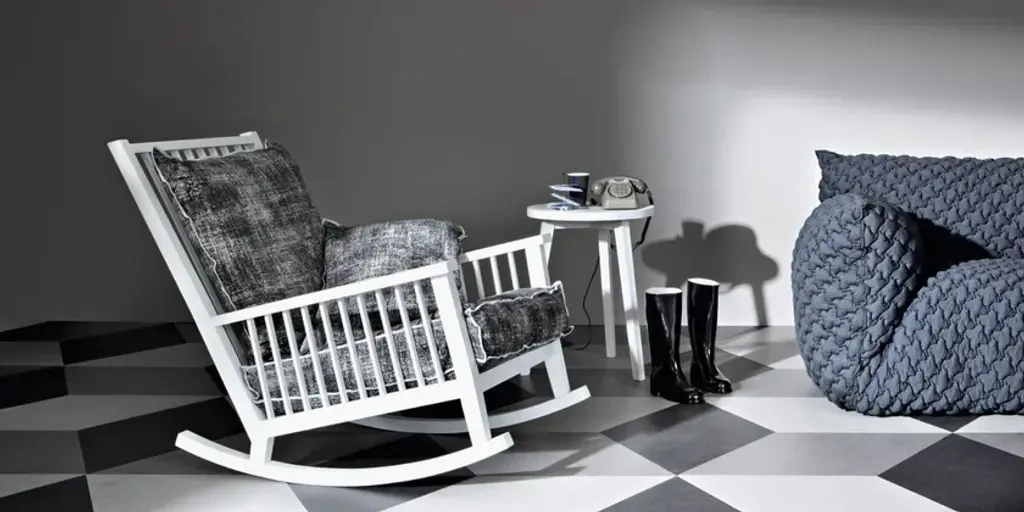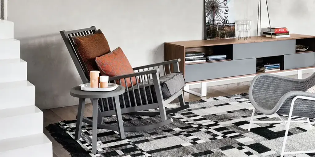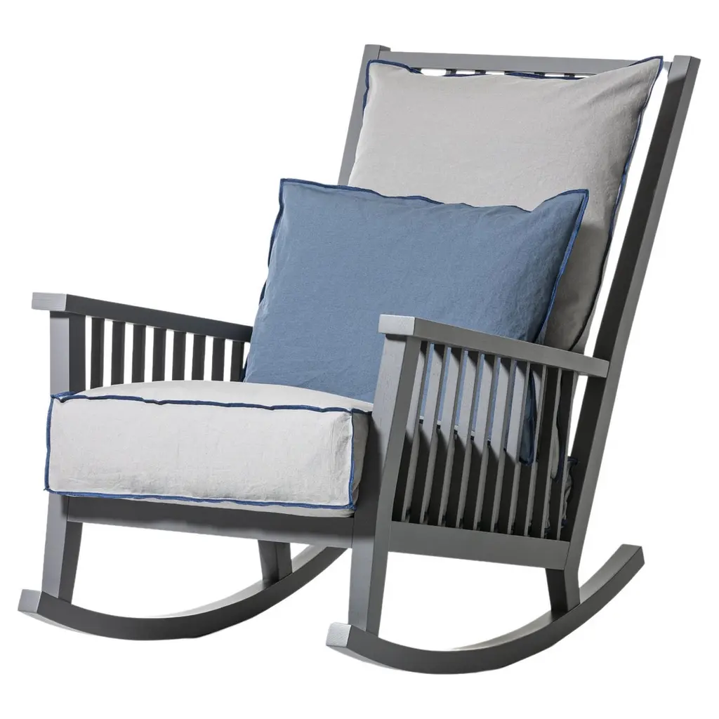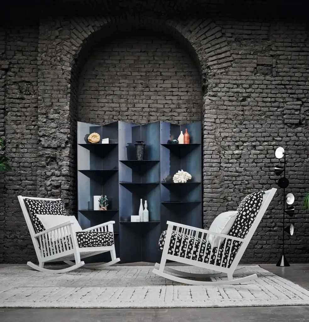 Rocking chair in wood, Gray 09 is characterised by a high backrest with visible slats on which a soft loose cushion rests. The structure, with a large and welcoming seat, is made of natural painted Canaletto walnut, bleached oak or white, grey, black, ocean or dove-grey lacquered oak, Blueberry, Date, Ginger.Vintage soul and contemporary design characterise Gray, an articulated collection of chairs, armchairs, sofas, tables and coffee tables that mixes the austere elegance of classic furnishings with the simplicity of Nordic forms. A collection in solid walnut or oak embellished with workmanship, shapes and unusual materials, such as stone, porcelain, aluminium and marble.